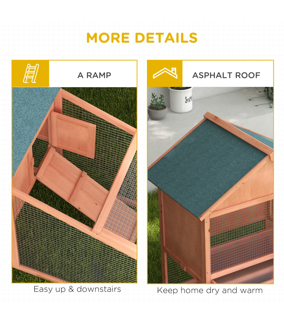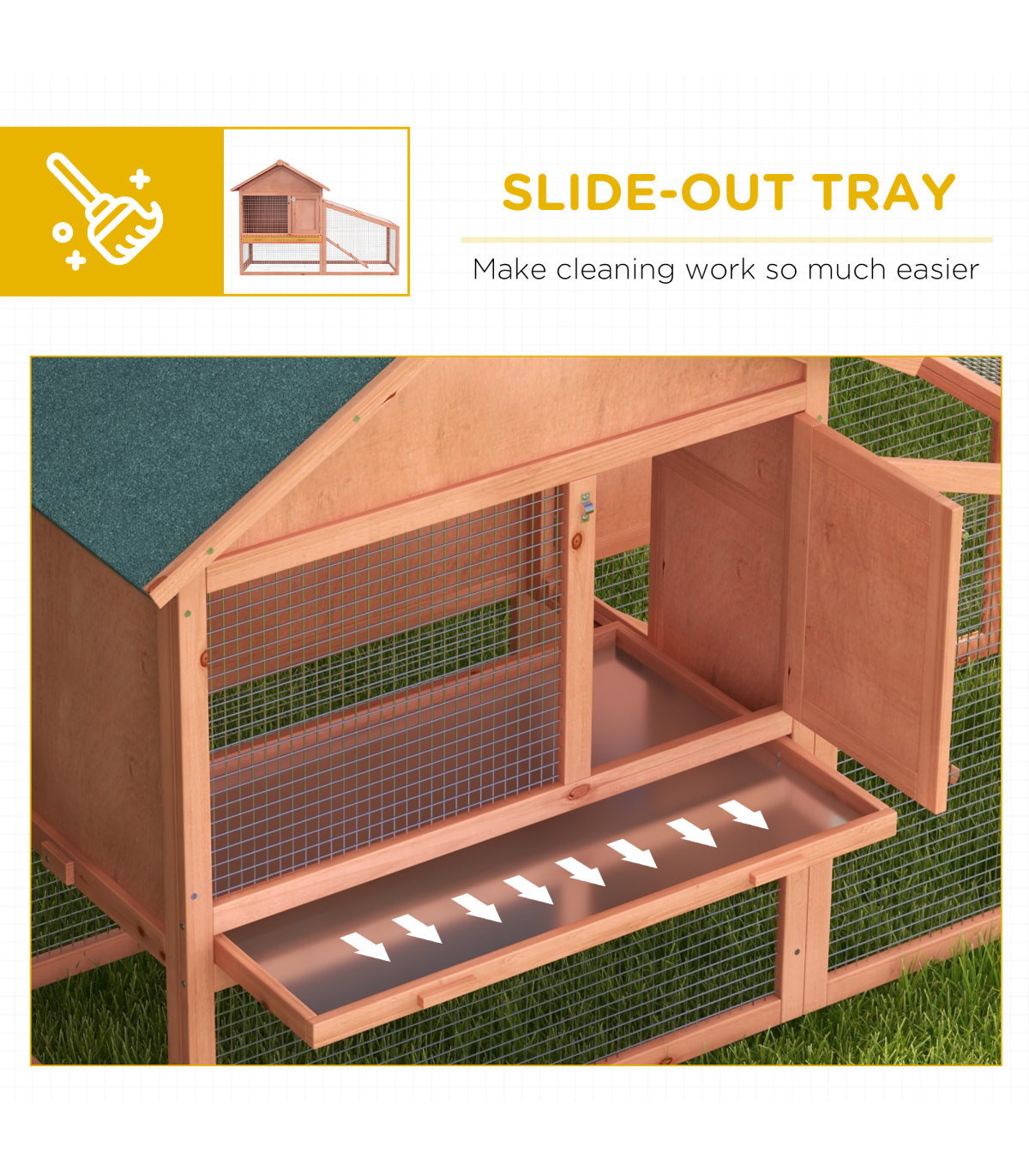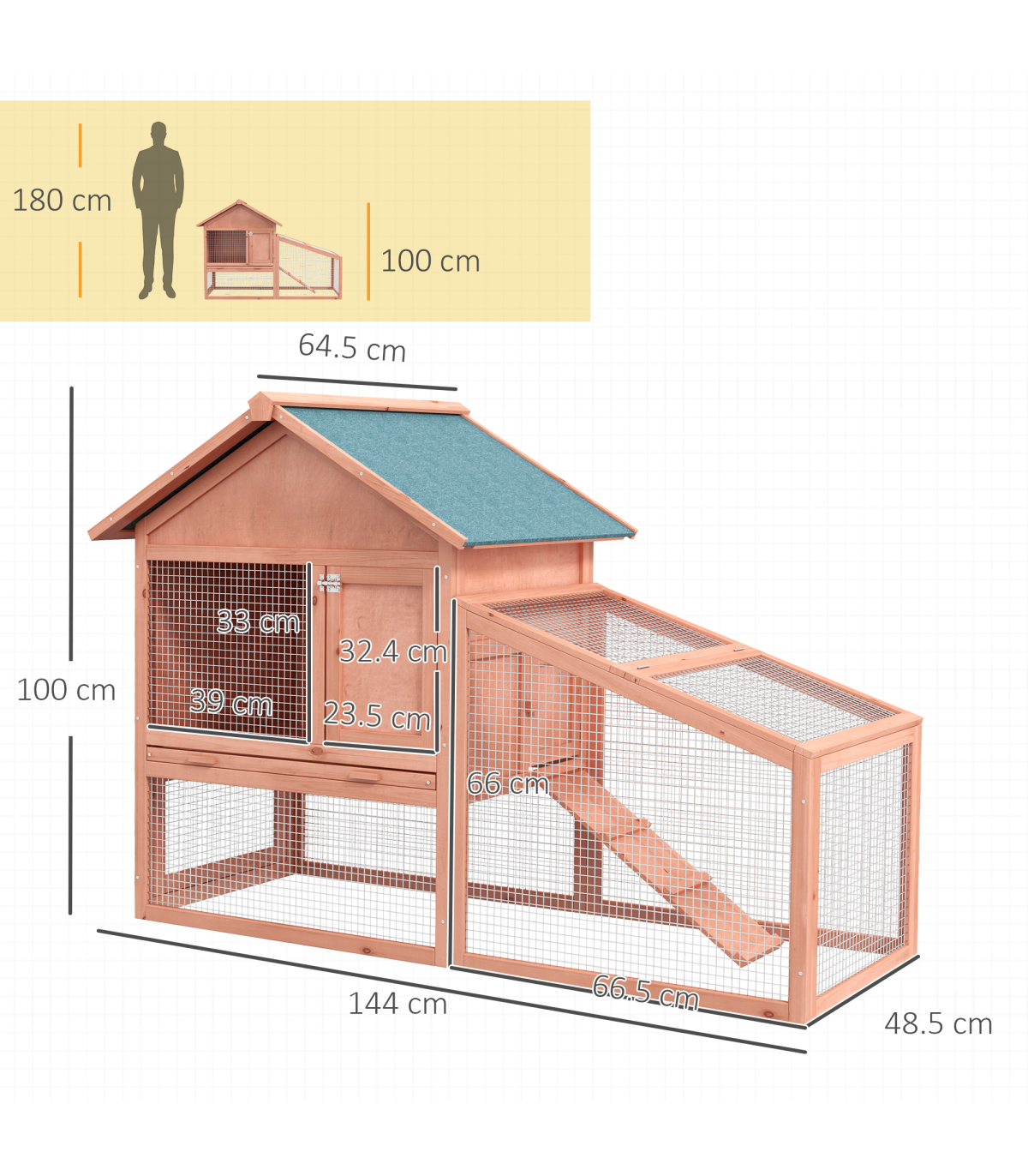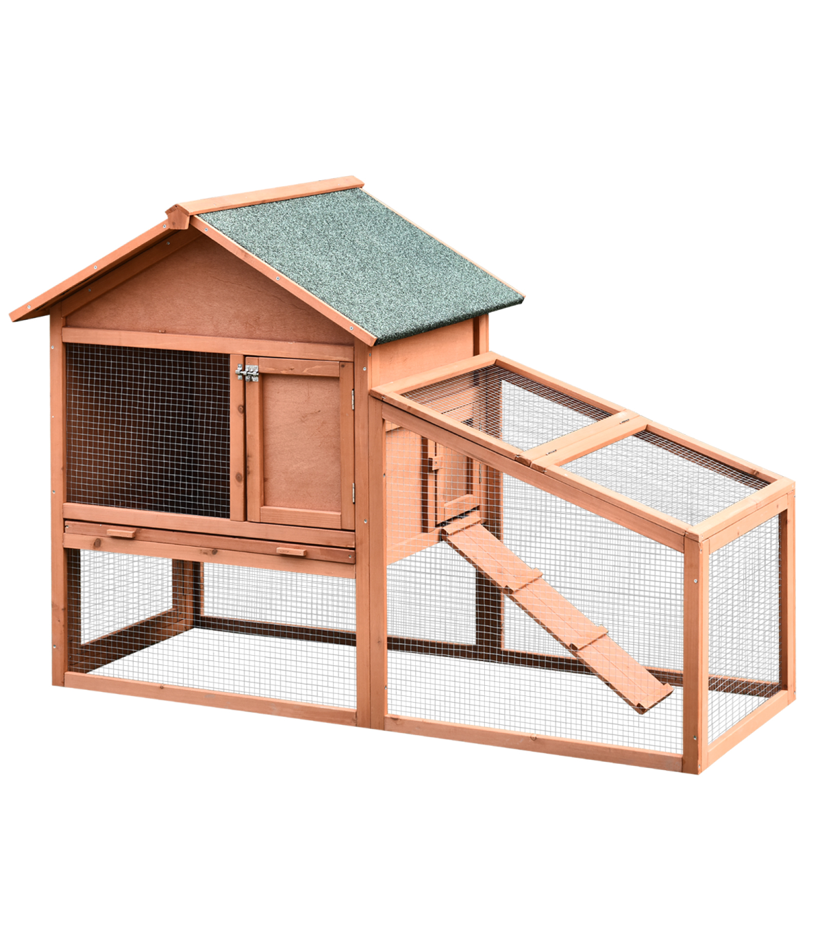 Give your small pet the ultimate living space with this 2 Tier Wood Rabbit Hutch from PawHut. Crafted from solid fir wood with a non-hazardous waterproof paint, this rabbit hutch is designed to provide strength and protection for year-round use. The two-level design offers a large living space, side room, and outdoor run area, giving your pet the flexibility to rest, relax, and enjoy fresh air. The tilted asphalt roof prevents water build-up and protects the inside from water and UV damage. With multiple doors, secure latches, and a slide-out tray for easy cleaning, this rabbit hutch offers convenience and accessibility. The non-slip ramp with a middle wood strip provides easy and safe access in and out for your pet. Perfect for rabbits, hamsters, guinea pigs, and other small animals, this rabbit hutch is the ideal choice for pet owners looking to provide a comfortable and secure living environment for their furry friends.