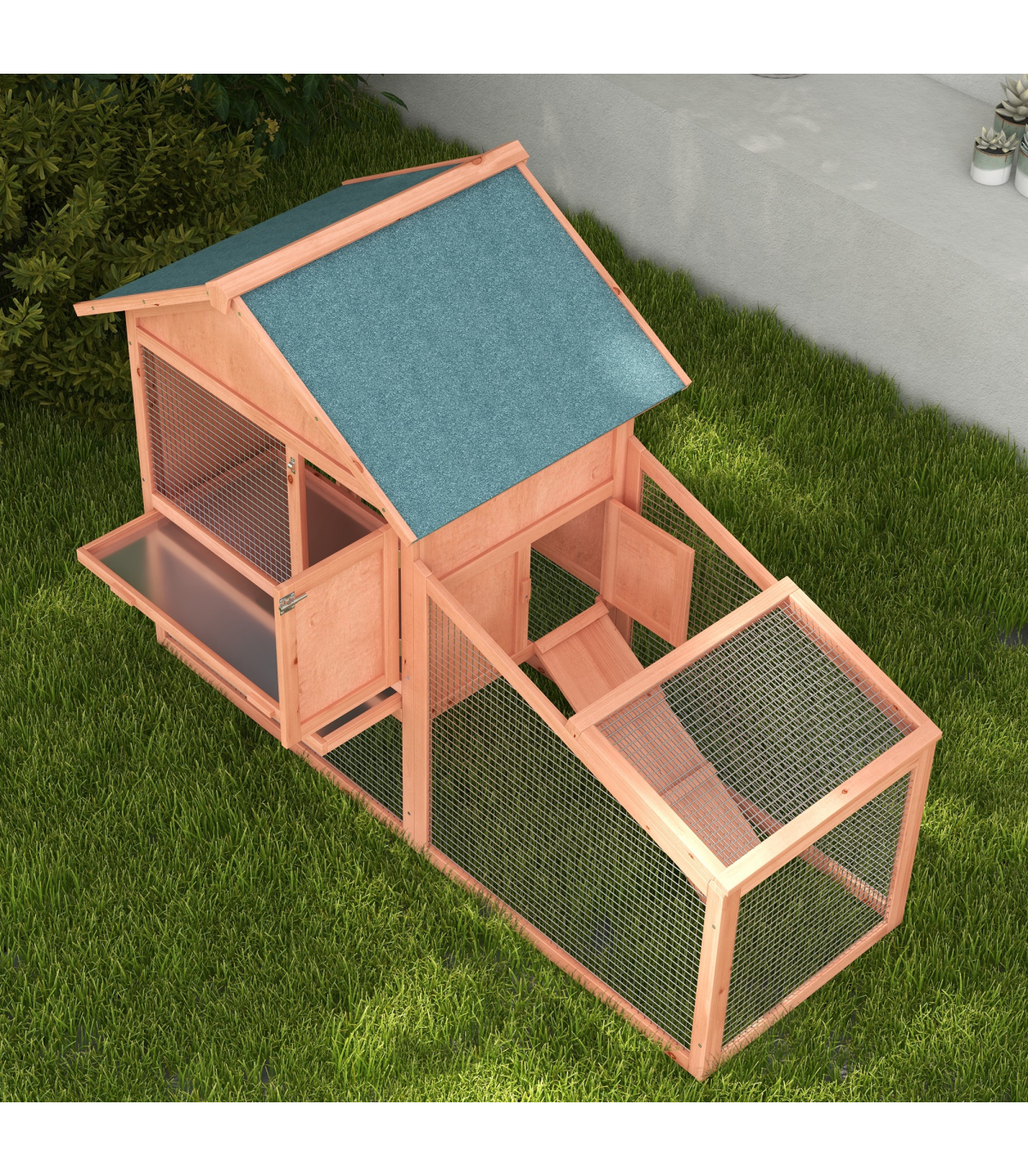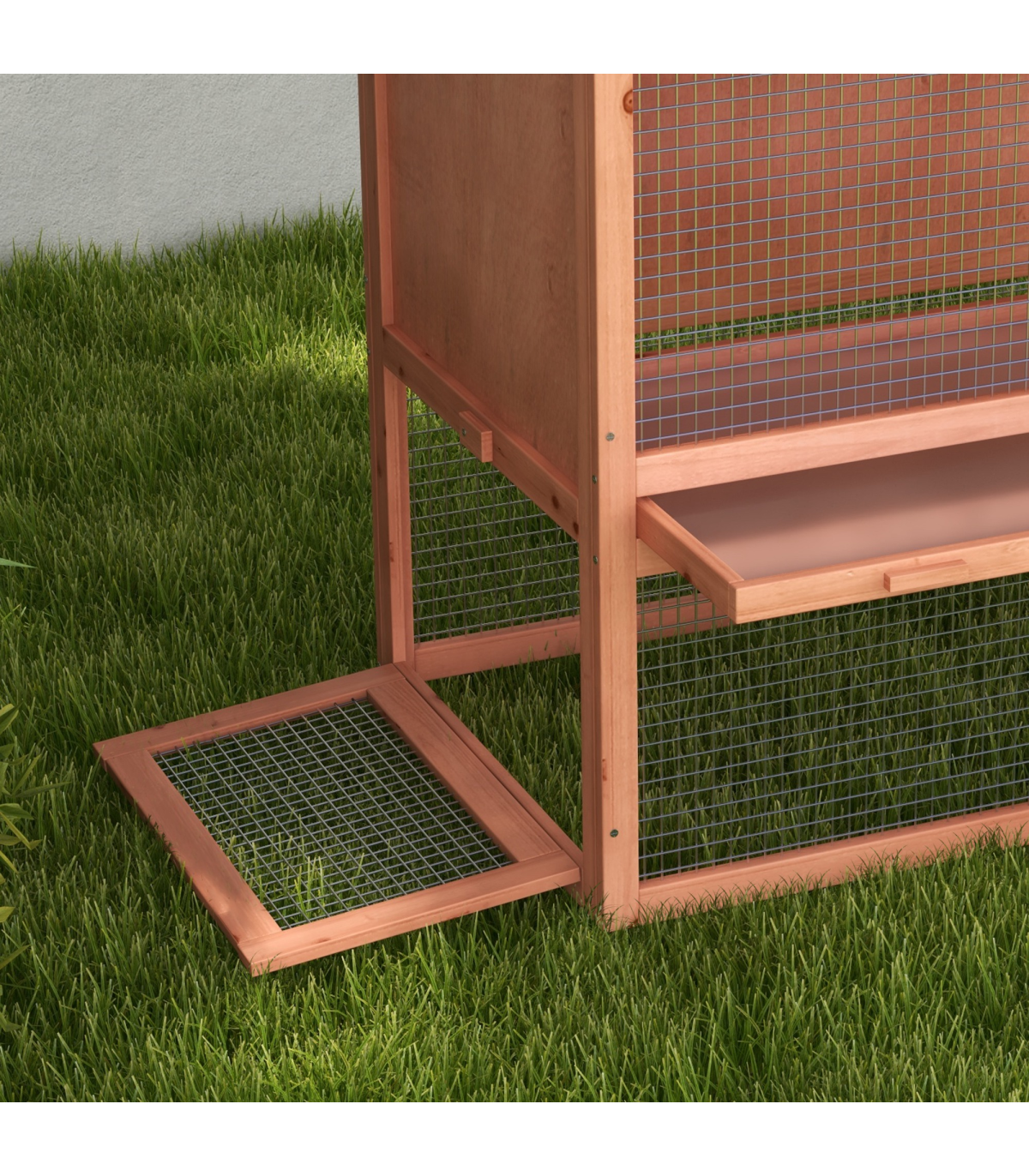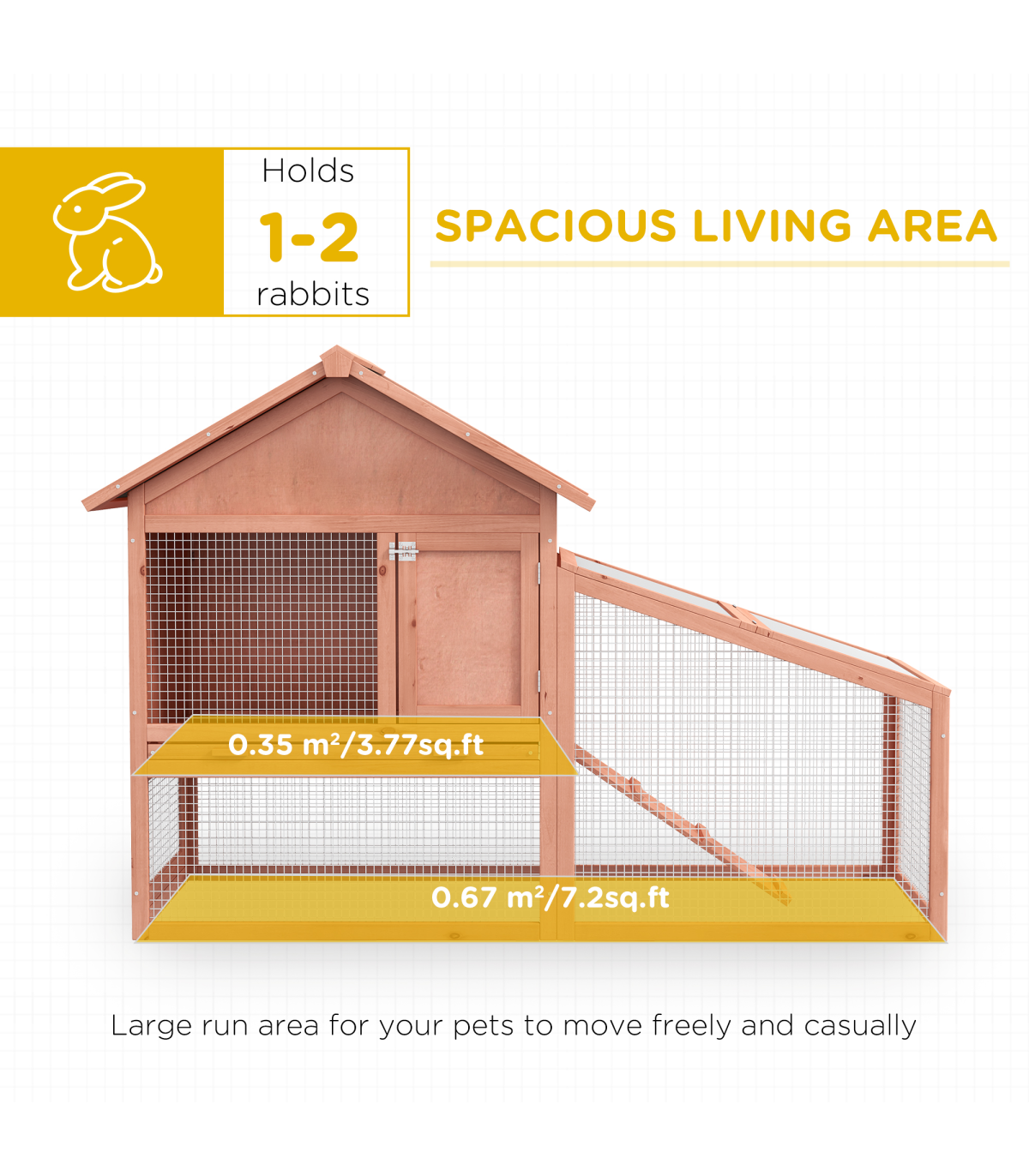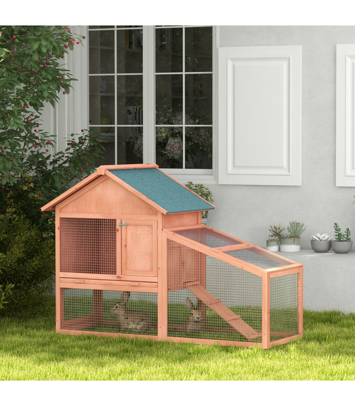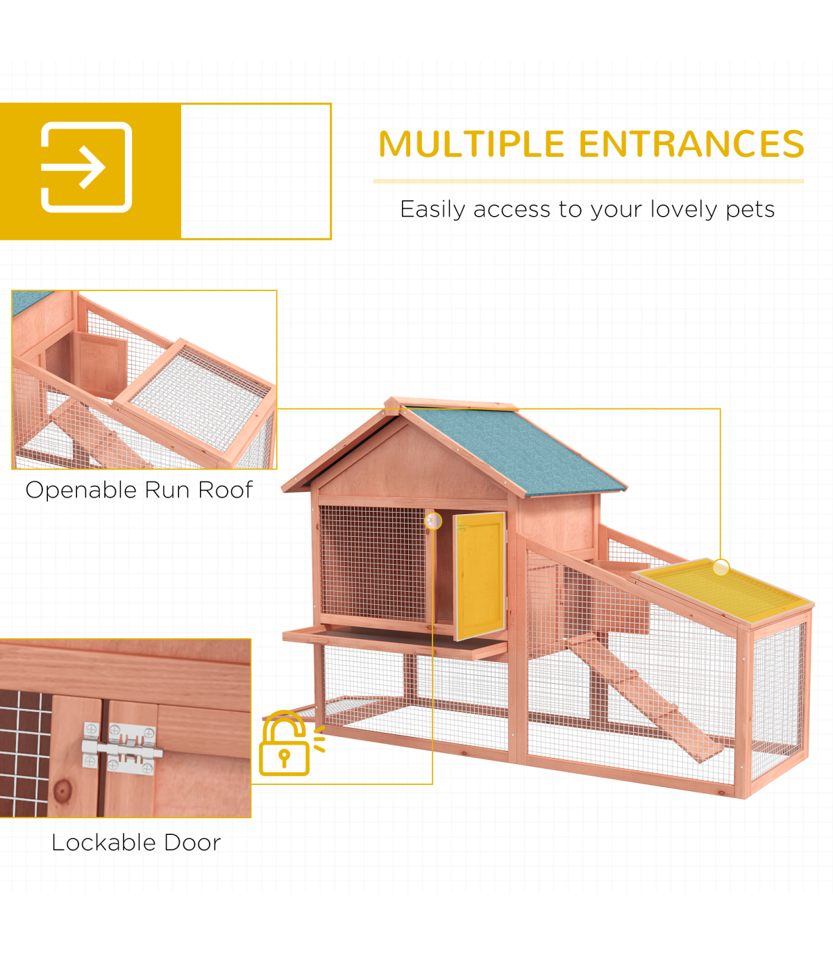 Give your small pet the ultimate living space with this 2 Tier Wood Rabbit Hutch from PawHut. Crafted from solid fir wood with a non-hazardous waterproof paint, this rabbit hutch is designed to provide strength and protection for year-round use. The two-level design offers a large living space, side room, and outdoor run area, giving your pet the flexibility to rest, relax, and enjoy fresh air. The tilted asphalt roof prevents water build-up and protects the inside from water and UV damage. With multiple doors, secure latches, and a slide-out tray for easy cleaning, this rabbit hutch offers convenience and accessibility. The non-slip ramp with a middle wood strip provides easy and safe access in and out for your pet. Perfect for rabbits, hamsters, guinea pigs, and other small animals, this rabbit hutch is the ideal choice for pet owners looking to provide a comfortable and secure living environment for their furry friends.