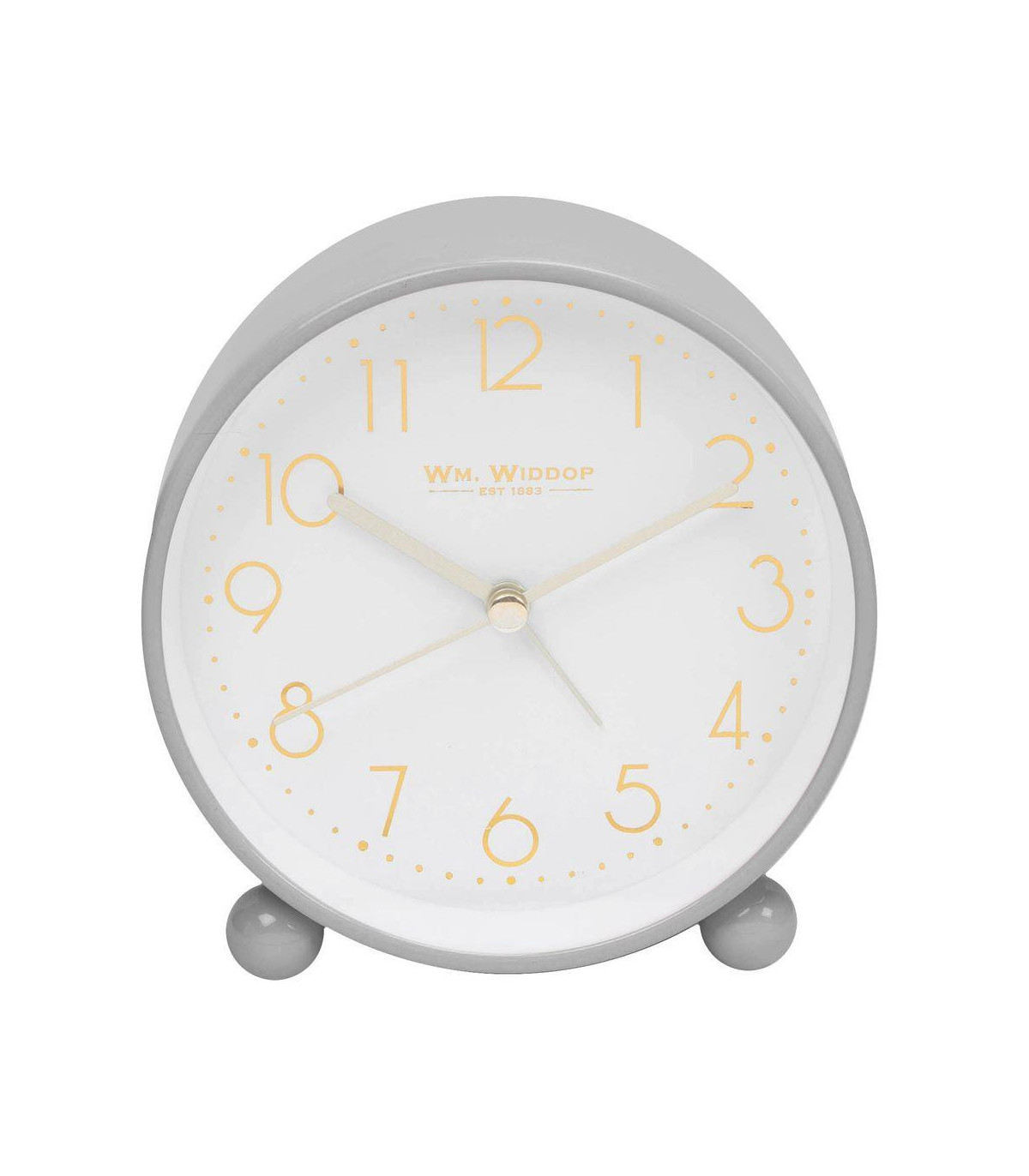 This stylish and contemporary warm grey round metal alarm clock features a gold foil embossed dial, adding a touch of elegance to any room. The clock is from WILLIAM WIDDOP®, a brand with over 130 years of unrivalled innovation and unbeatable quality in British timekeeping. The clock is perfect for home or travel use, offering both functionality and style.