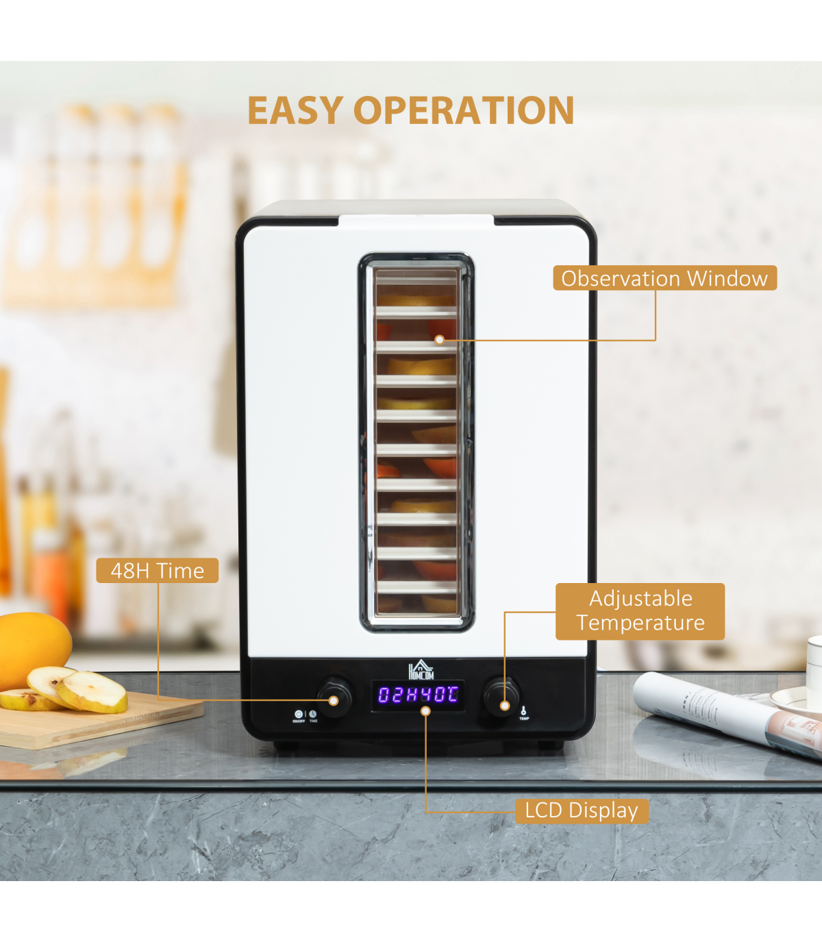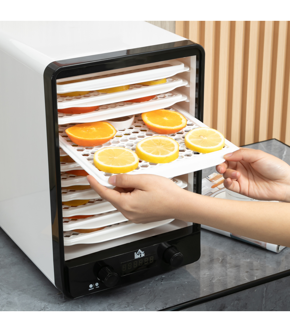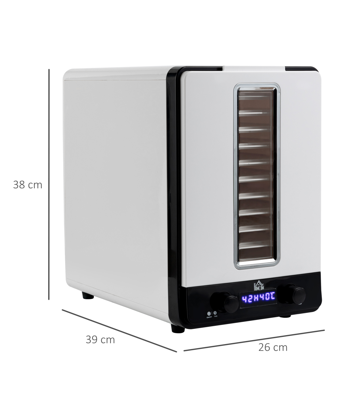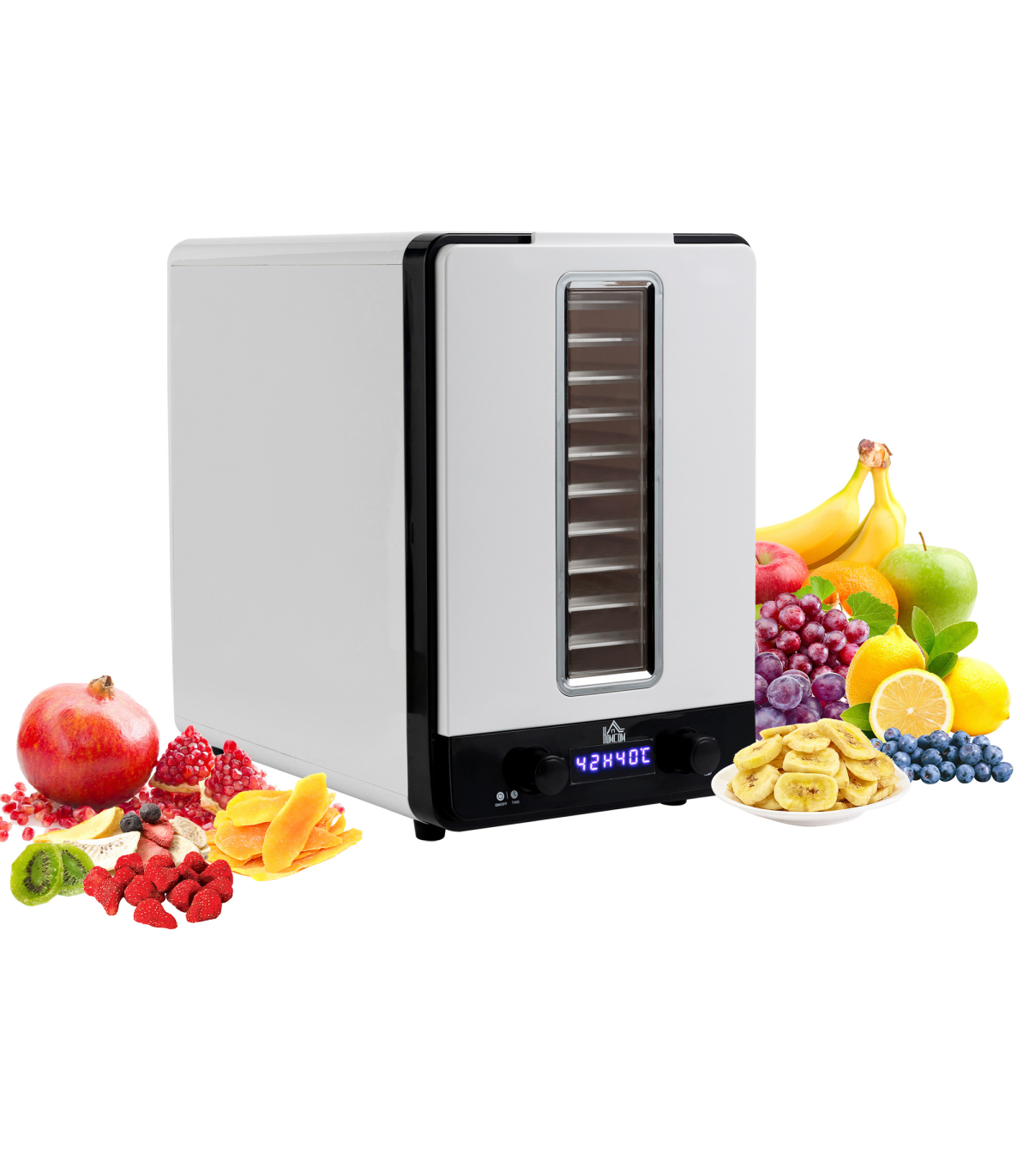 A sleek small kitchen appliance made to complete your culinary creations. Whether it's cocktails or cakes, you can dry out whatever you want with this HOMCOM dehydrator. The 40?-70? temperature range and 0-48 hour timer means it's easy to adjust and set to what's wanted. Inside, there are eleven trays which means you can organise and separate ingredients for efficient drying, and most importantly, to help prevent cross contamination.