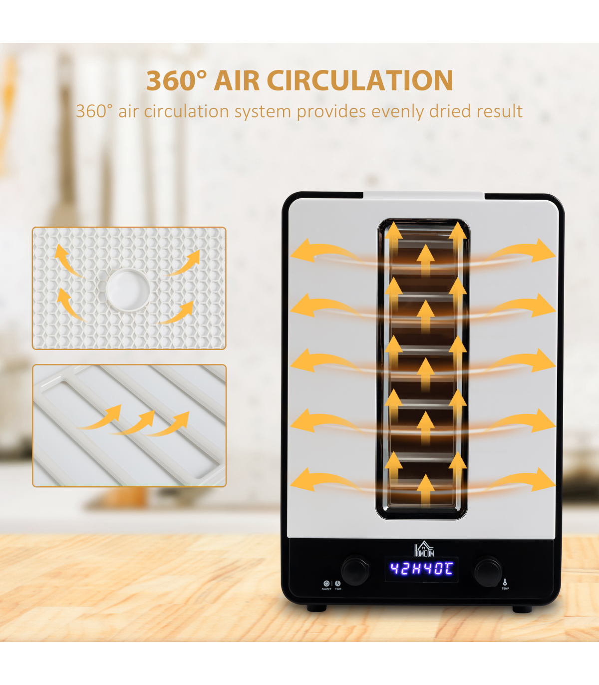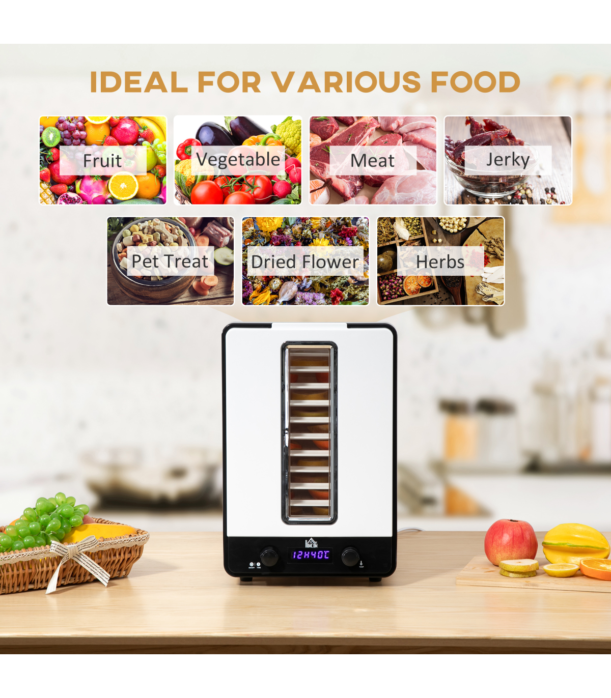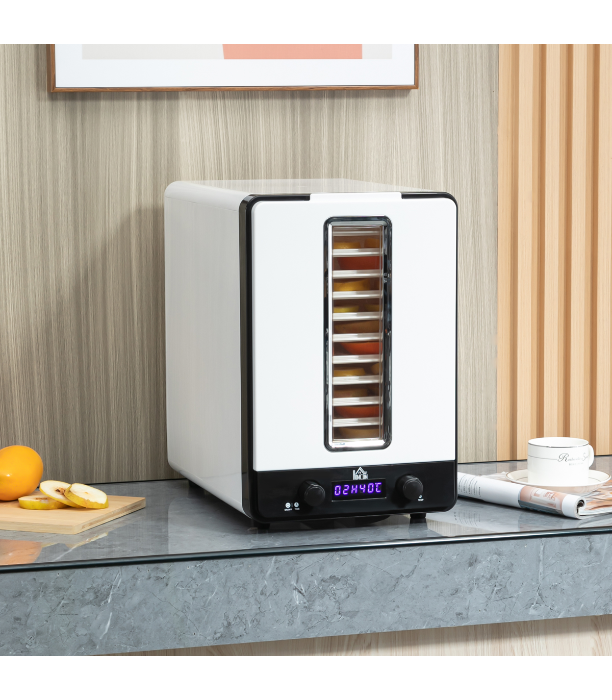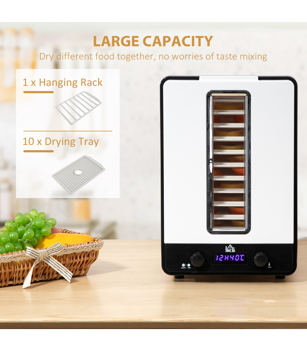 A sleek small kitchen appliance made to complete your culinary creations. Whether it's cocktails or cakes, you can dry out whatever you want with this HOMCOM dehydrator. The 40?-70? temperature range and 0-48 hour timer means it's easy to adjust and set to what's wanted. Inside, there are eleven trays which means you can organise and separate ingredients for efficient drying, and most importantly, to help prevent cross contamination.