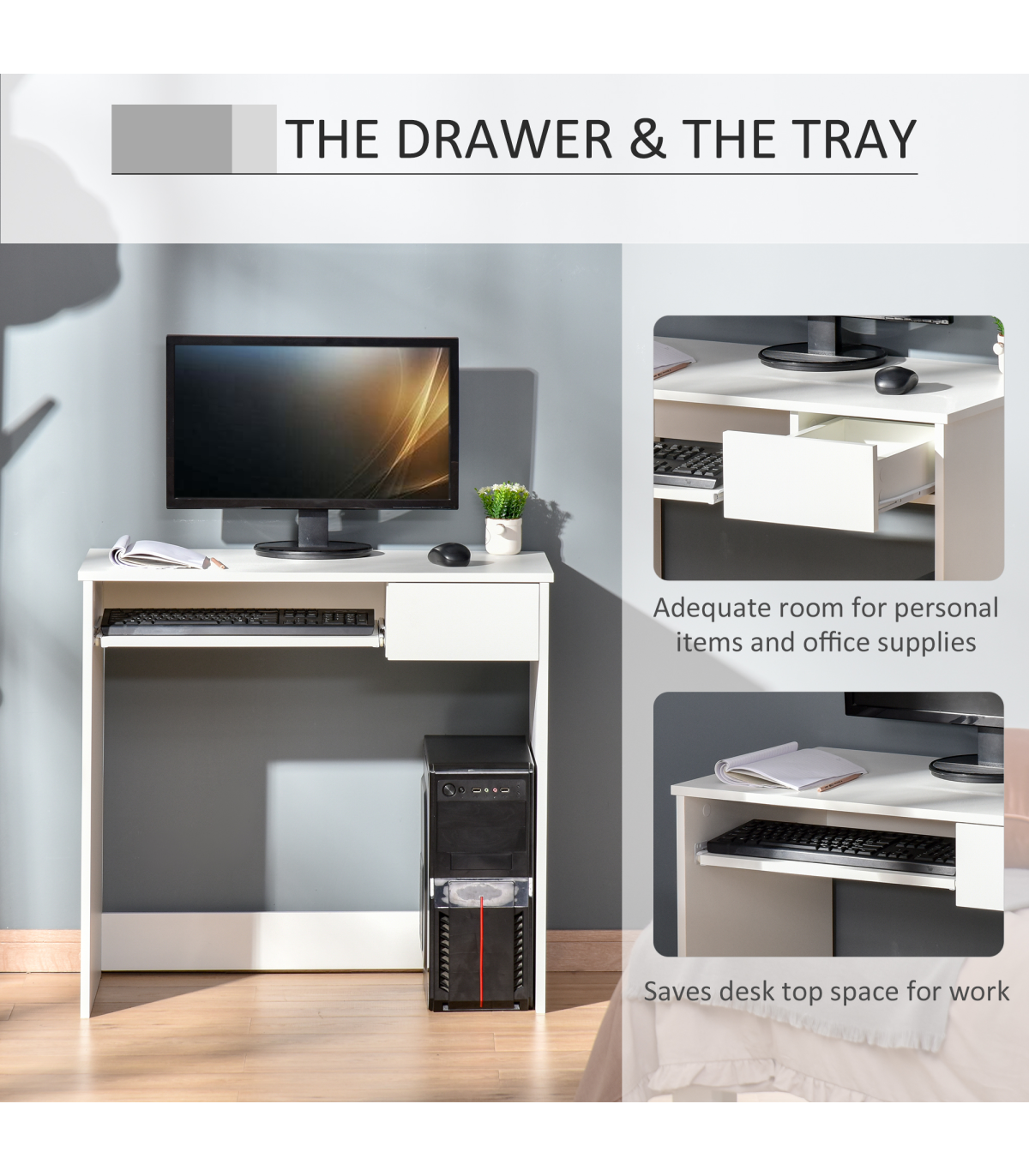 - Features a keyboard tray and a drawer saving lots of work space