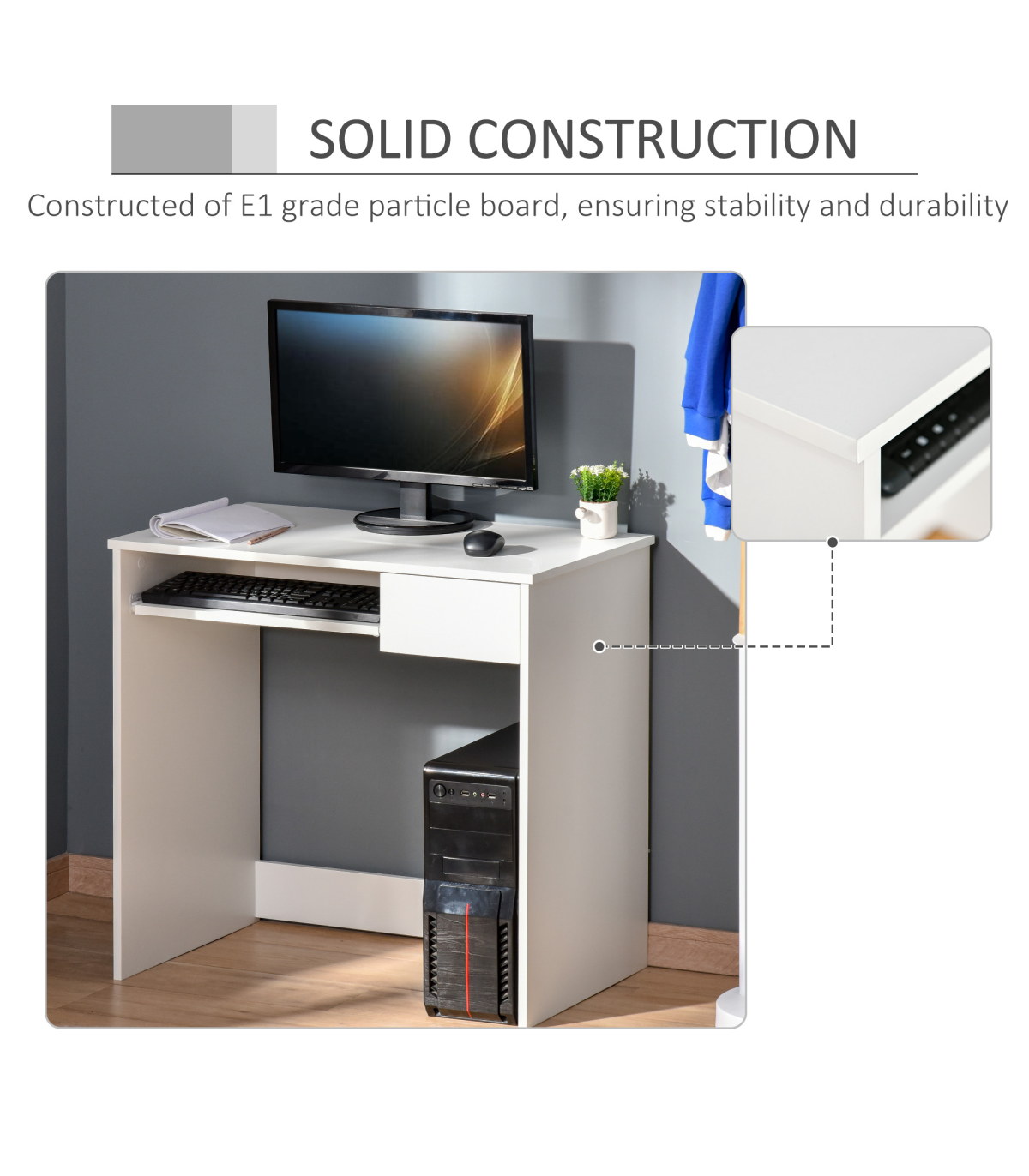 Efficiently save space with this computer desk from HOMCOM. Featuring a keyboard tray and a drawer, it saves a lot of desktop space. Constructed of particle board with oak surface, it's durable, easy to maintain, and brings you the atmosphere of nature. Its contemporary look will blend beautifully into any style décor. It's an ideal choice for you to have this desk in your study, office, or bedroom to enrich your furniture while saving space!