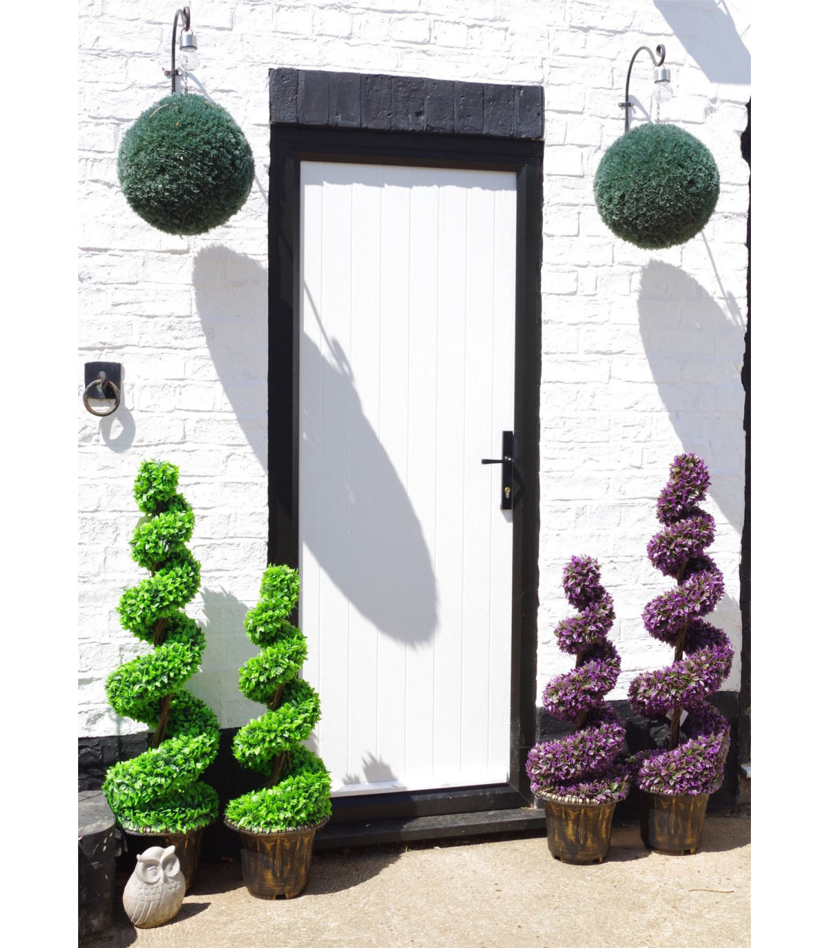 Stunning realistic artificial boxwood spiral trees with special large leaves - a very bold statement plant ideal for entrances. These come with the decorative planters pictured and will be delivered to you fully assembled in a large box. Green color, 120cm high. Other colors and sizes available, see our other products. Comes with the decorative plastic planter shown - all you need to do is un-box and it is ready for display immediately. You can also set this inside an even larger outdoor planter if you wish (one of the photographs shows a customer's trees in larger pots outside her door). Twists around a central pole and natural vines. Special large format artificial leaves make this more visually striking than most artificial topiaries. Highly realistic, premium quality. These are suitable for indoor or outdoor use. If using outside place in a sheltered area and protect from extremes of weather. Decorative planter (measuring 30cm wide x 23cm high) supplied is plastic although certainly doesn't look it (see our pictures). These are really attractive and complement the trees perfectly. The base of these is weighted and they are ready to display. Available in two sizes and also two colors. Price is per tree.