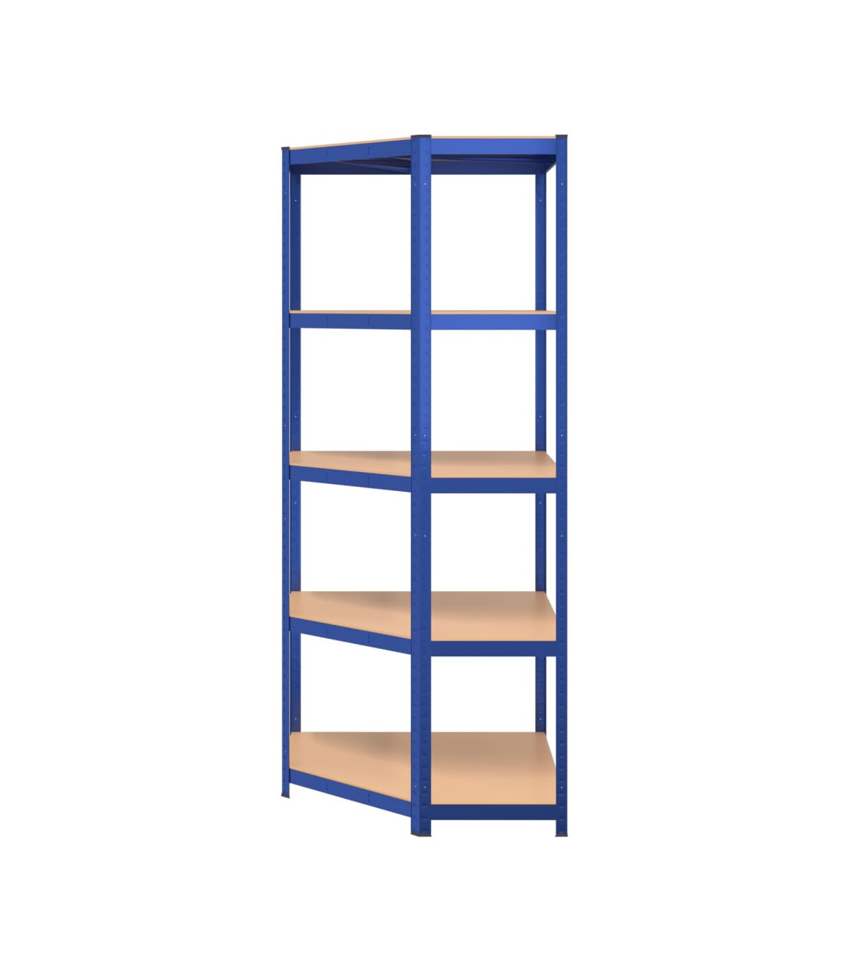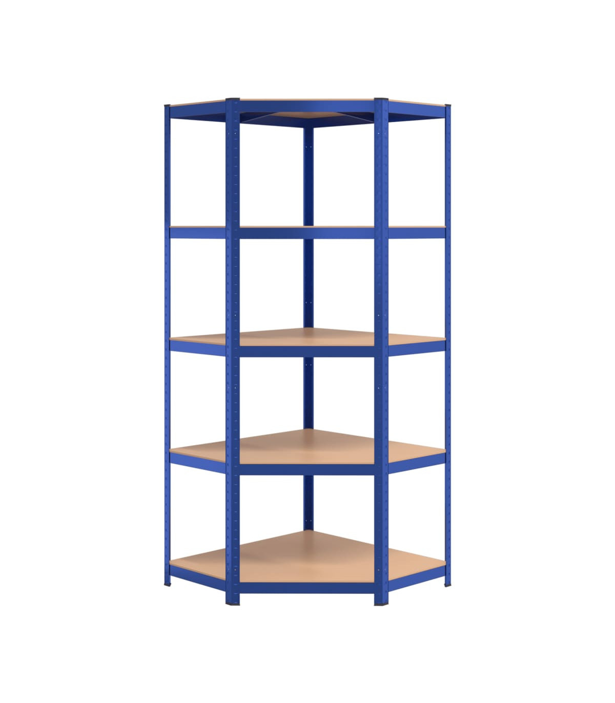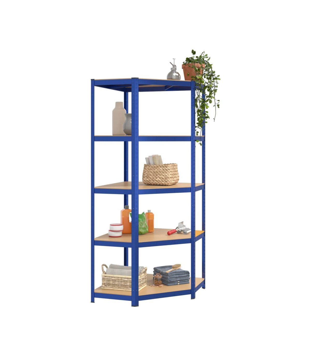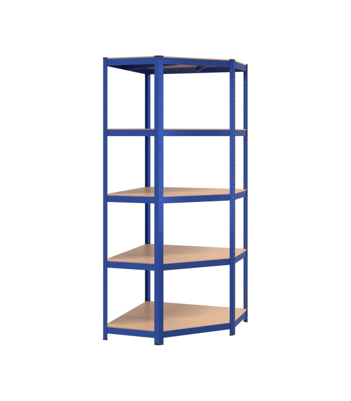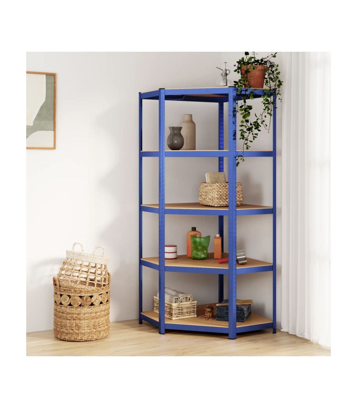 This blue 5-layer corner shelf is the perfect storage solution for both residential and commercial spaces. The combination of a steel frame and engineered wood boards ensures durability and resistance to moisture. The sturdy construction, along with reinforcement bars and a boltless design, provides a strong load capacity for all your storage needs. The adjustable layers allow for flexible storage options, and the shelf can even be divided into two separate small racks. Keep your space neat and organized with this versatile corner shelf.