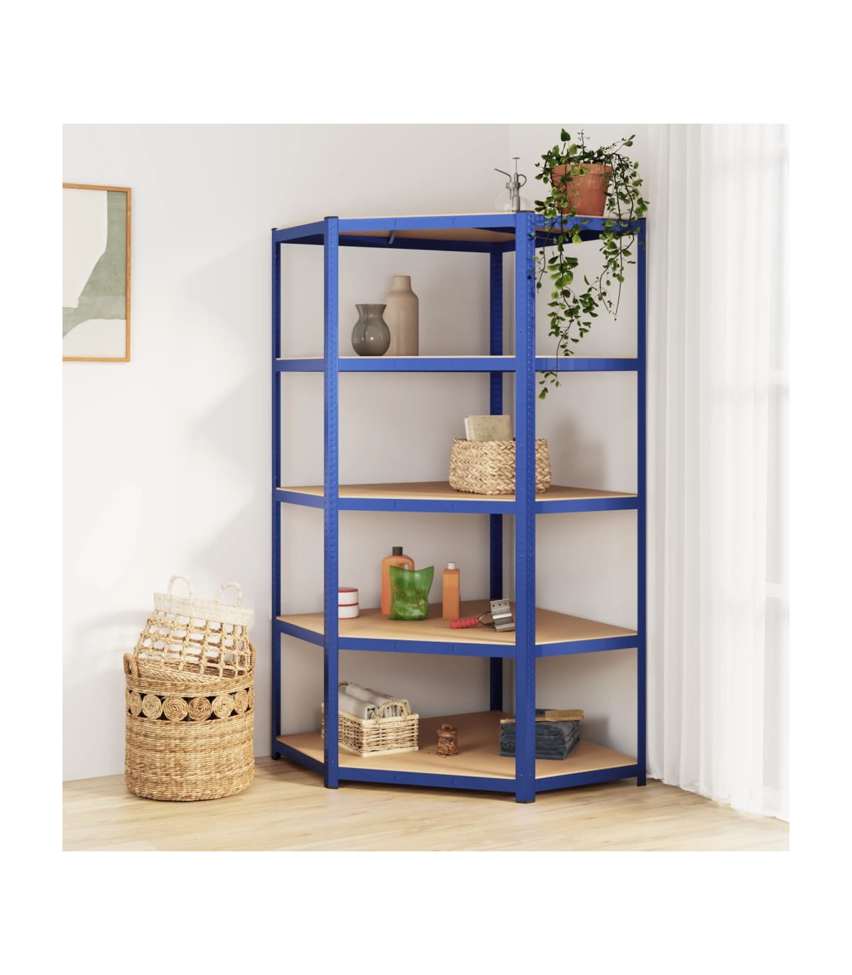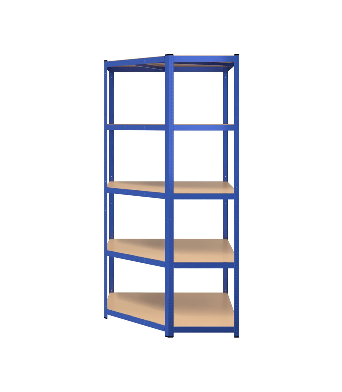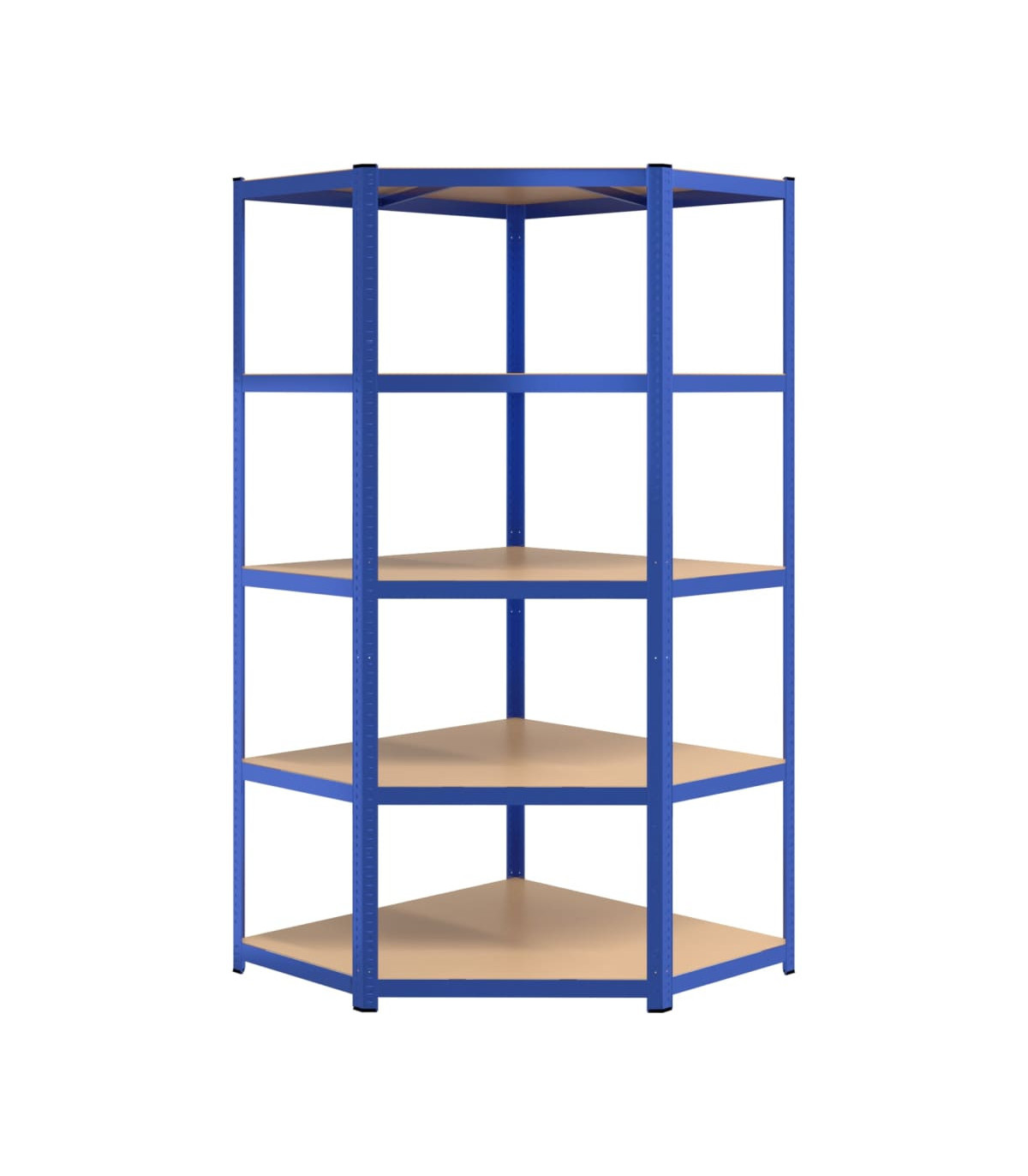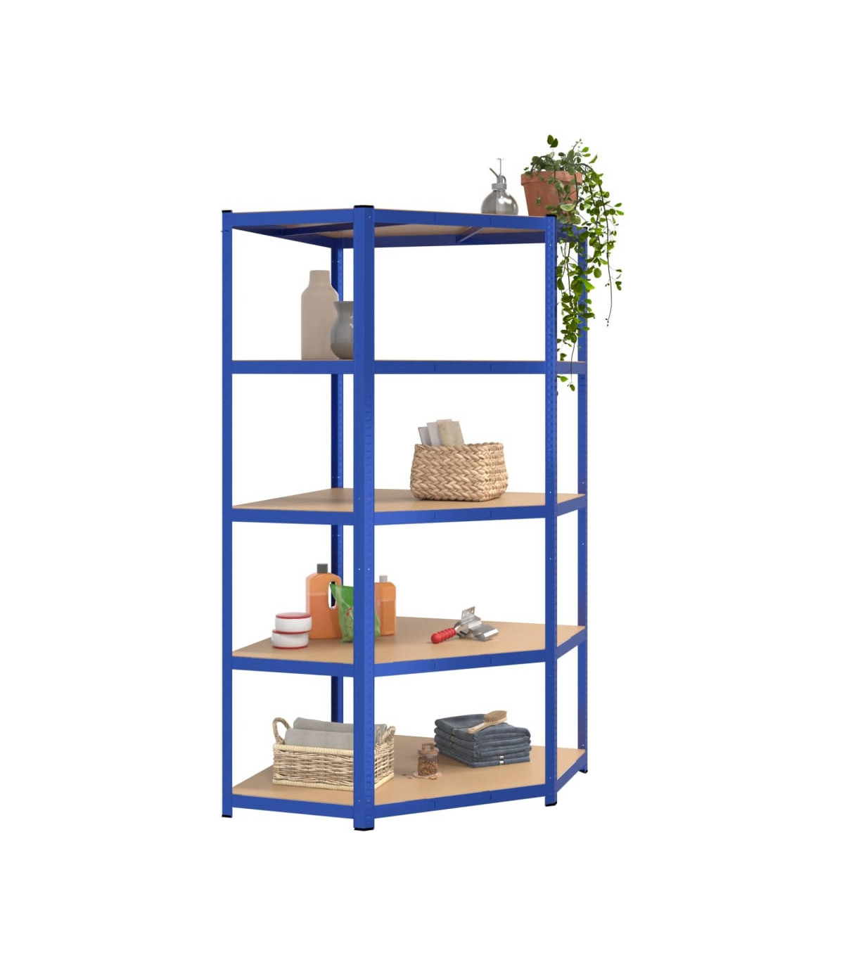 This blue 5-layer corner shelf measuring 90x90x180 cm is the perfect storage solution for both residential and commercial spaces. The sturdy steel frame combined with engineered wood boards ensures durability and stability, while also providing resistance to moisture. The shelf's boltless design, reinforcement bars, and thick material contribute to its strong load capacity, making it ideal for storing a variety of items. Additionally, the shelf can be divided into two separate small racks and the height of the layers is adjustable, offering flexibility in storage options. Each shelf comes with an assembly manual for easy setup.