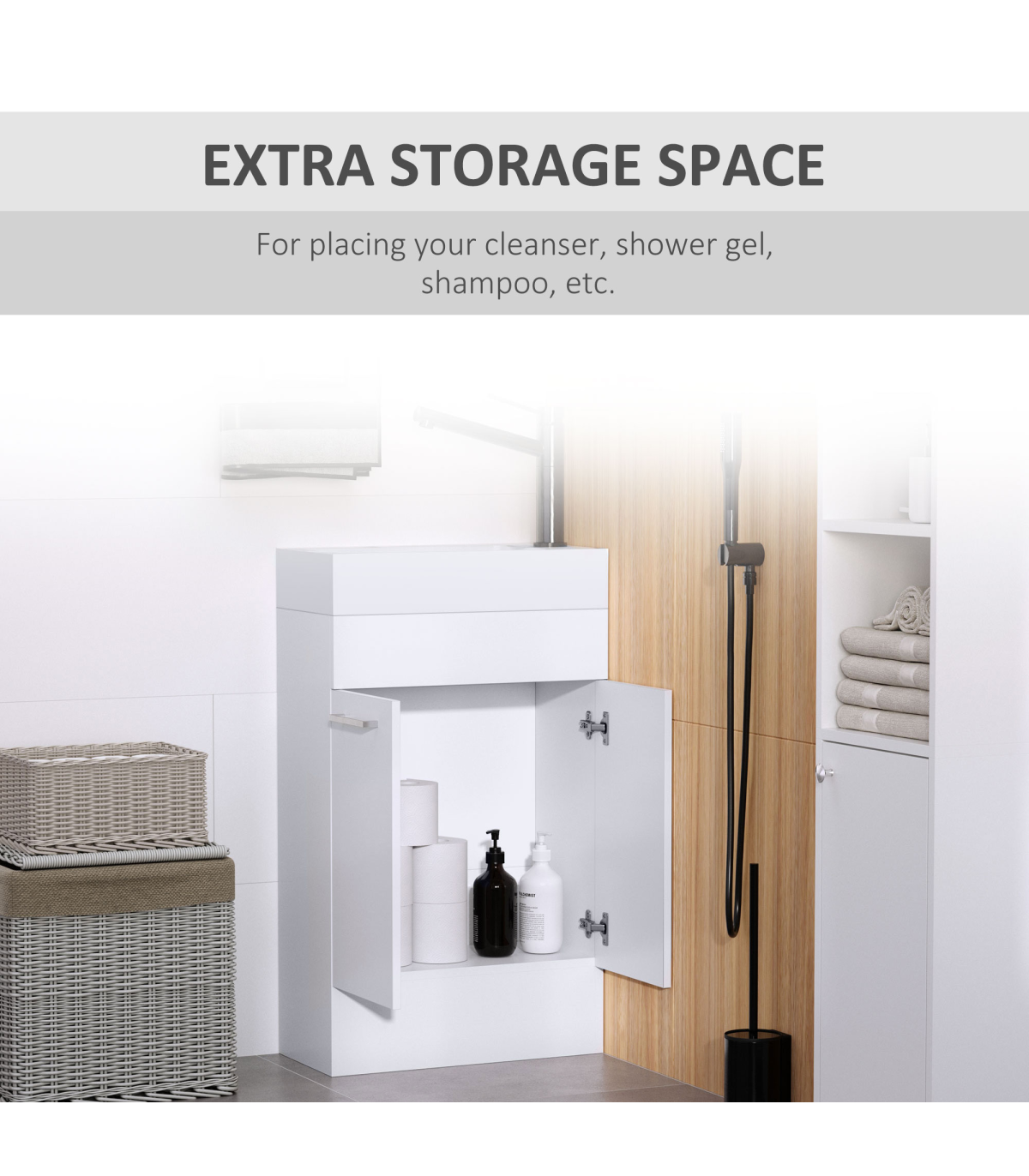 - Extra storage with two doors to organize toiletries and products