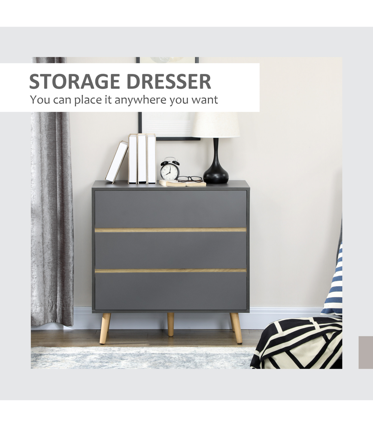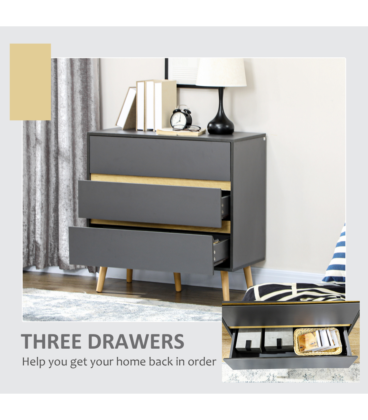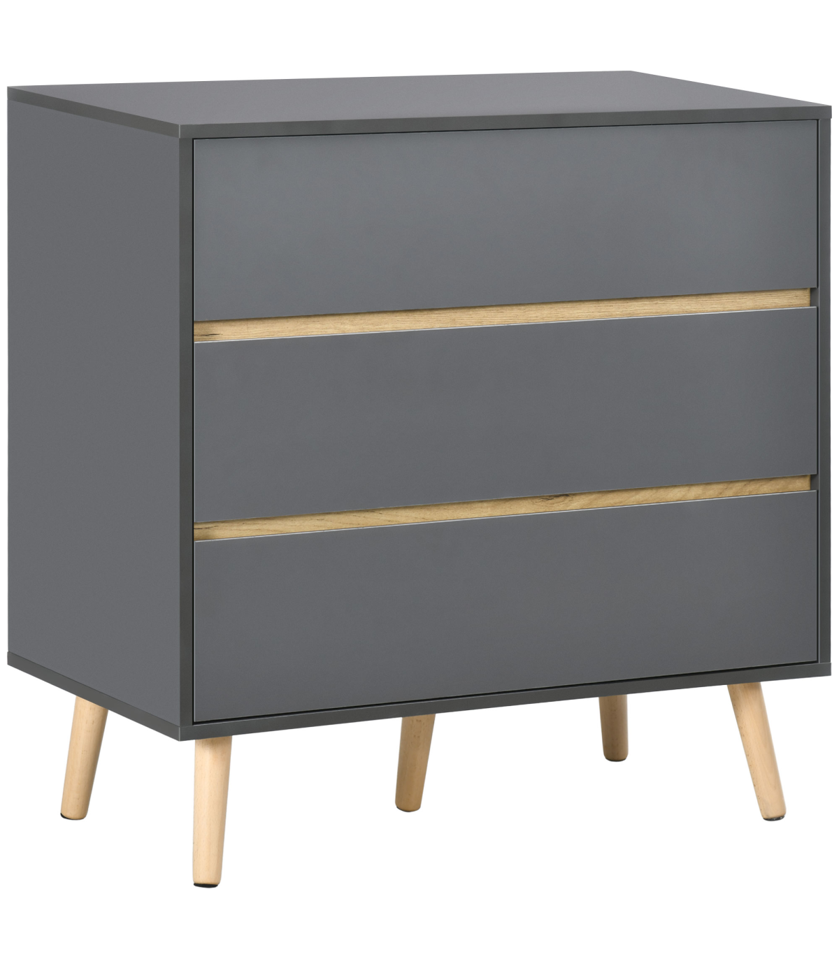 Enhance your home with a blend of functionality and modern style with the HOMCOM Dark Grey 3 Drawer Chest Storage Cabinet Organiser. This elegant piece of furniture is designed to bring a touch of moodiness and sophistication to any room. Crafted in a dark matte grey finish, it features wood-effect details that add a natural charm. The chest comes equipped with three spacious drawers, providing ample space to store your bedside essentials or declutter other areas of your home. Supported by sturdy wooden legs, this chest ensures durability and stability, while the included anti-tipping straps offer added safety. Whether placed in your bedroom or any other space, this storage cabinet organiser is sure to make a statement.