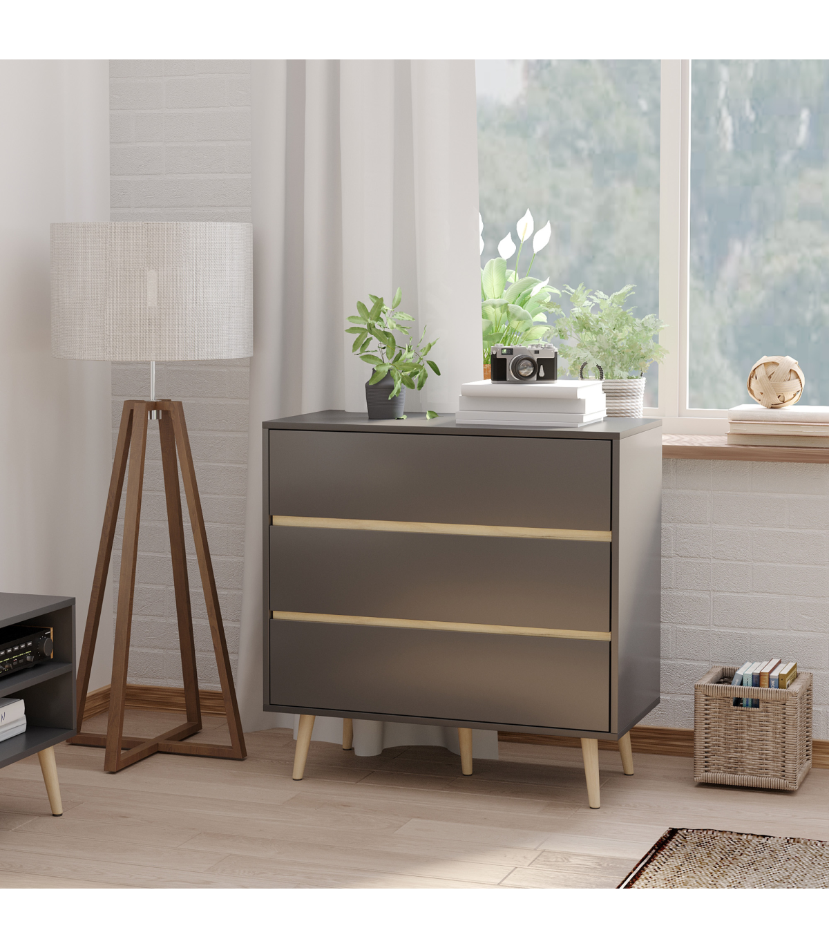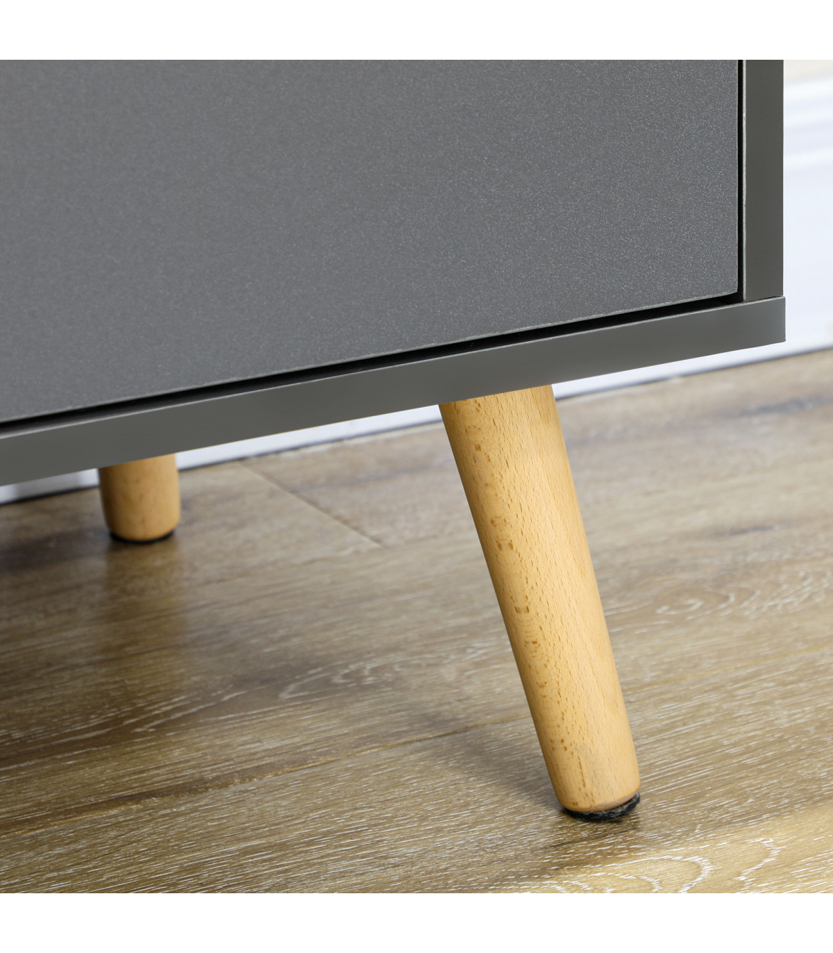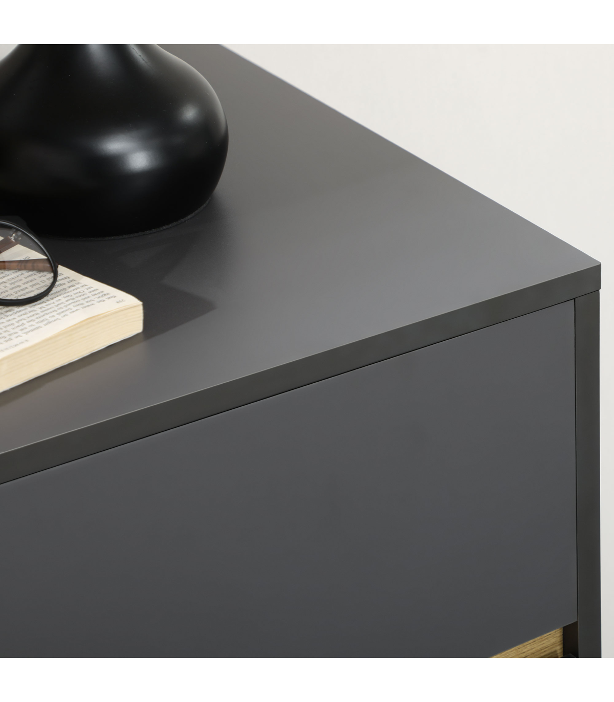 - Dark grey finish with wood-effect accents