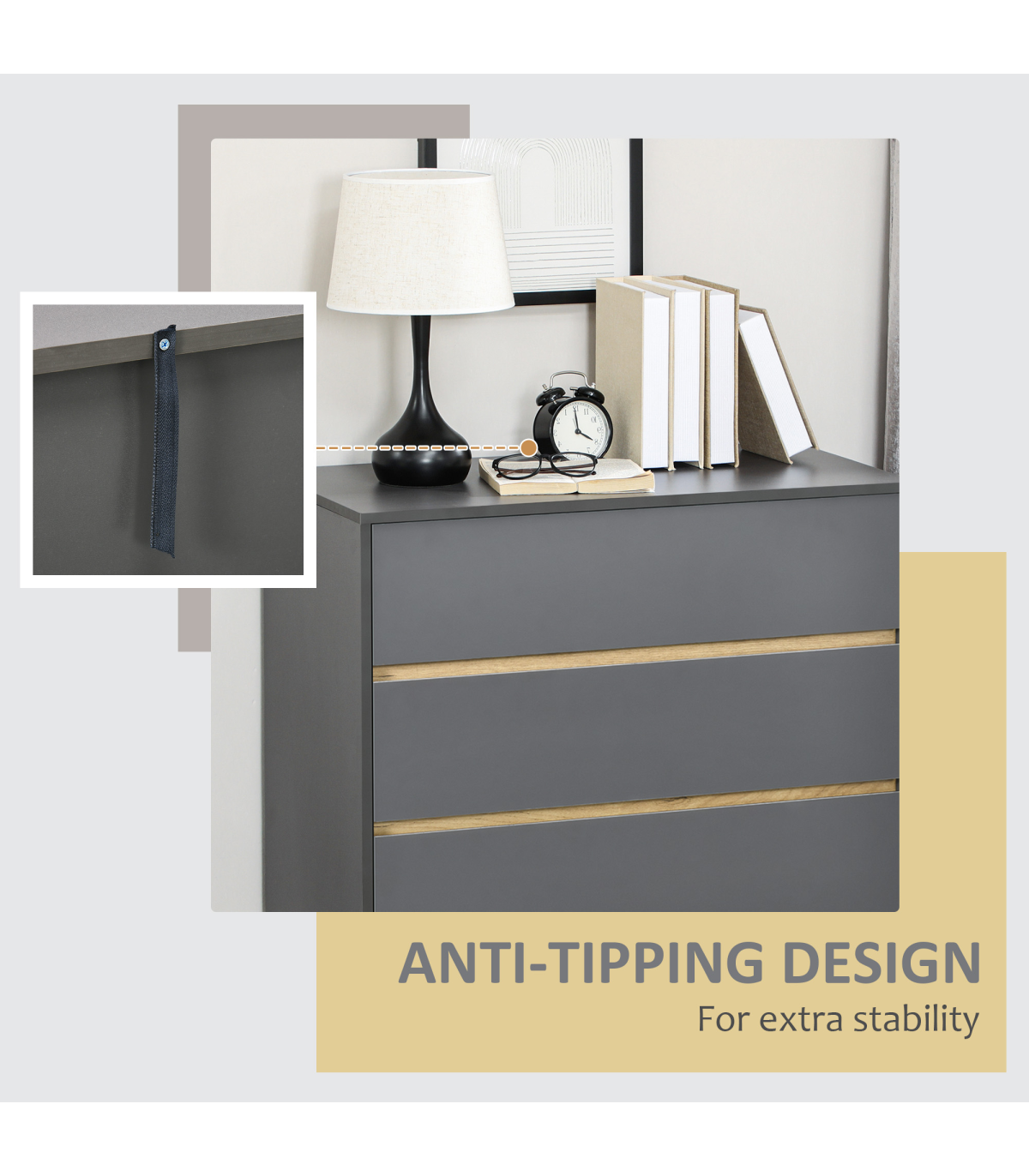 - Includes anti-tipping straps for safety
