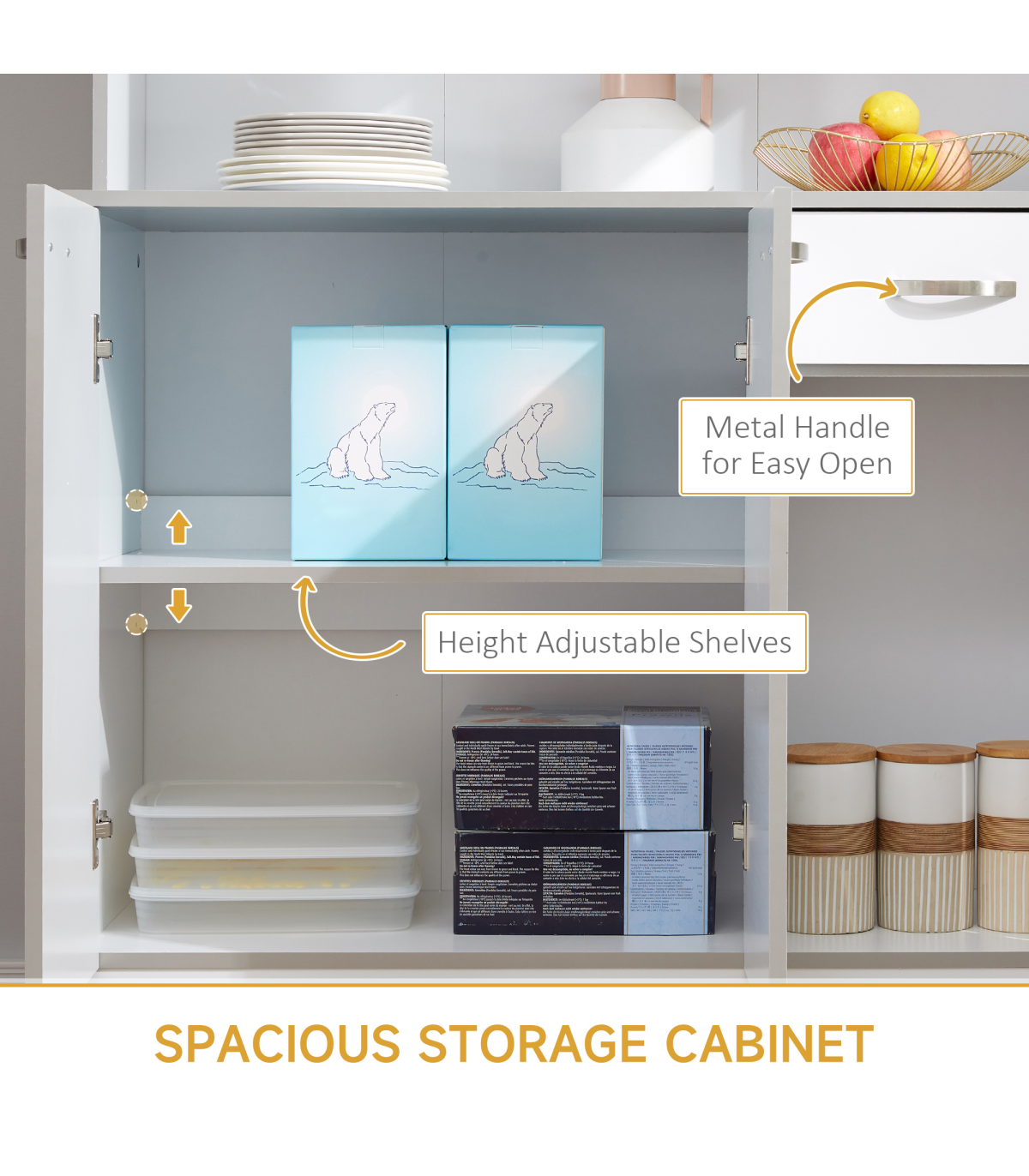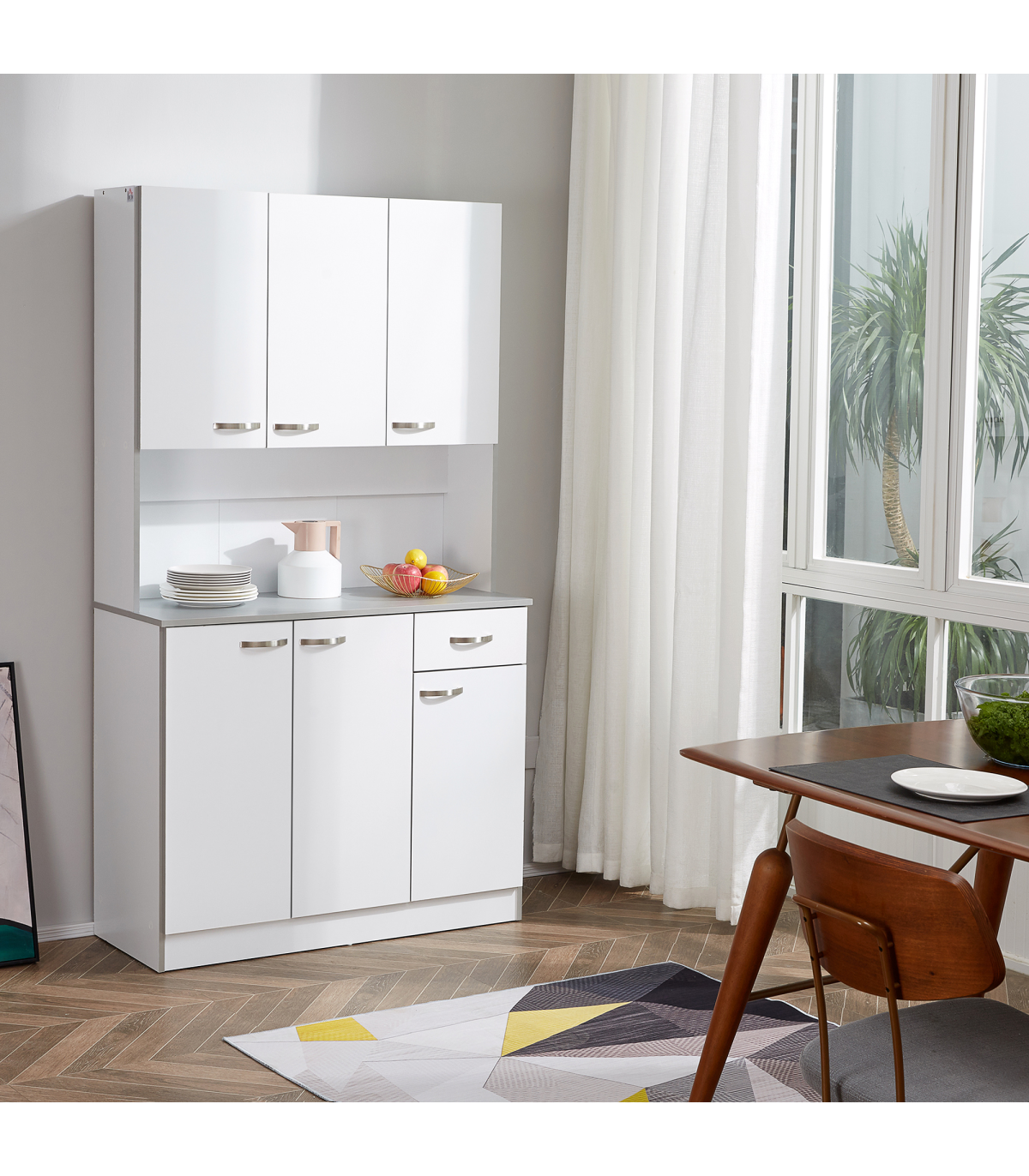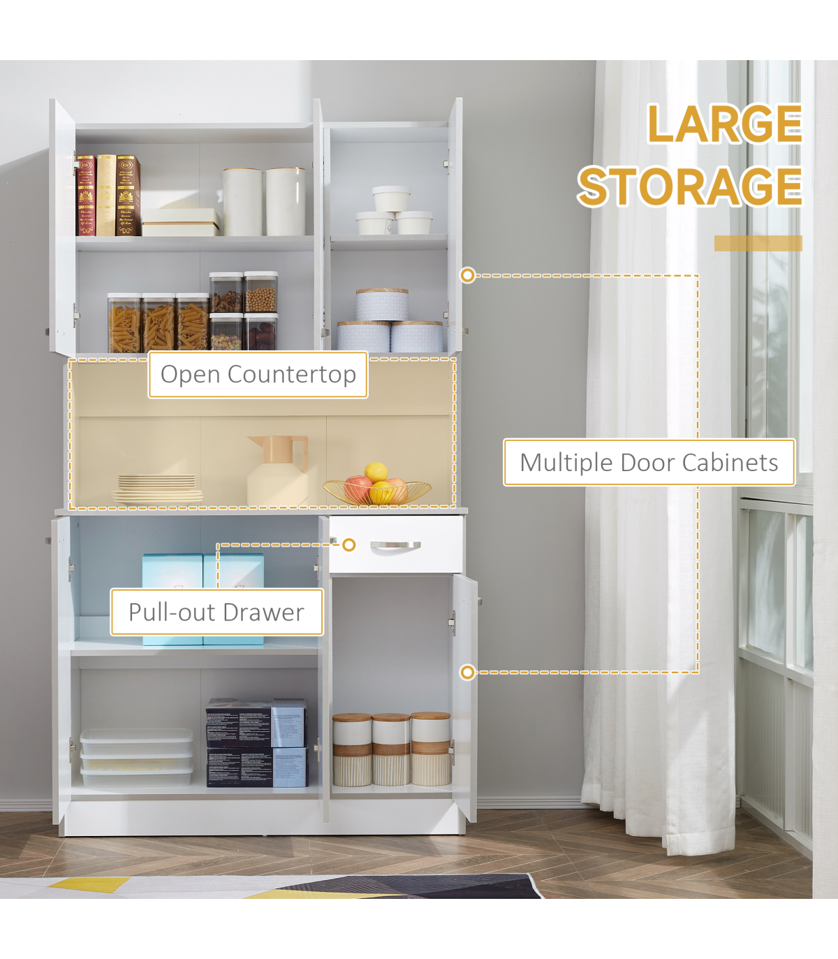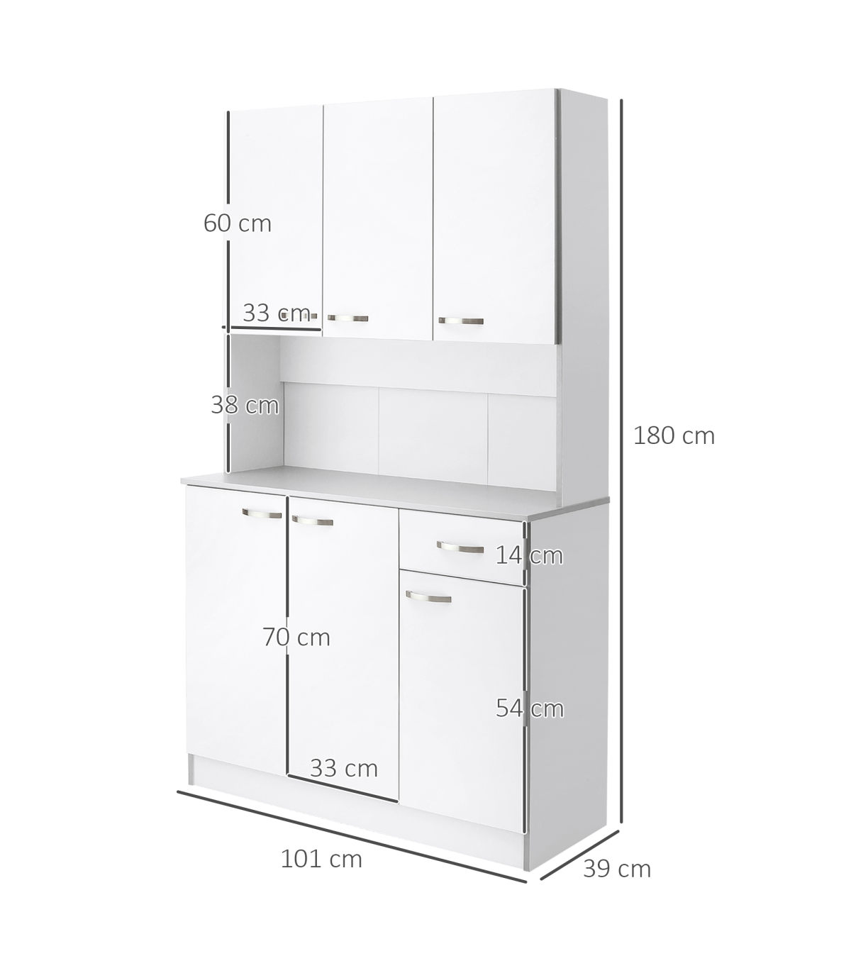 A multi-storage kitchen dresser which gives you multi-storage space: this HOMCOM tall cabinet. It features top and bottom cupboards, a drawer and open middle shelf. Each cupboard comes with a three-level adjustable shelf so you can fit in smaller and larger pieces. A clean white colour for a modern look, this storage cupboard is complete with silver-coloured handles for a sleek look.