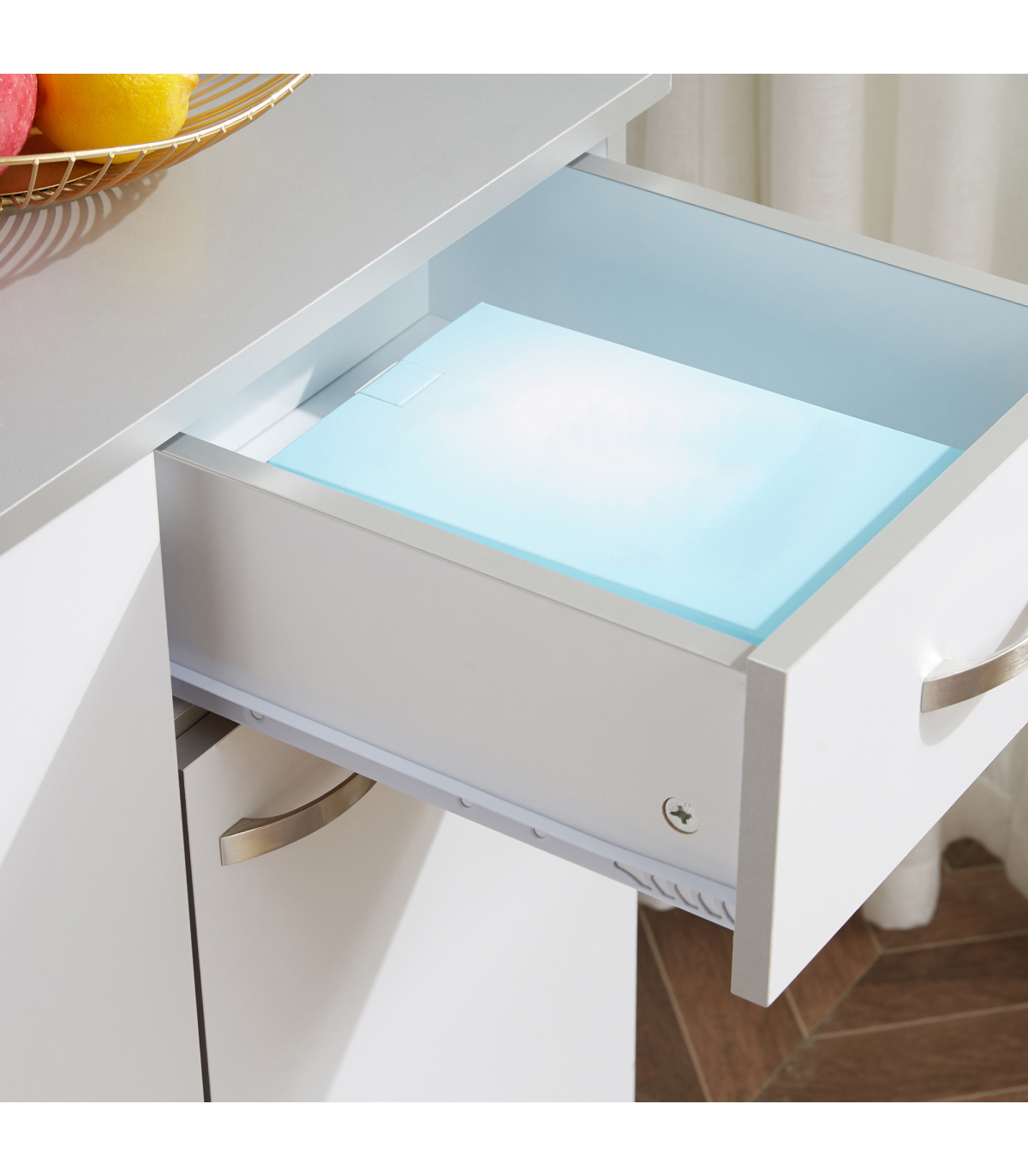 each cupboard comes with a three-level adjustable shelf so you can fit in smaller and larger pieces. A clean white colour for a modern look, this storage cupboard is complete with silver-coloured handles for a sleek look.