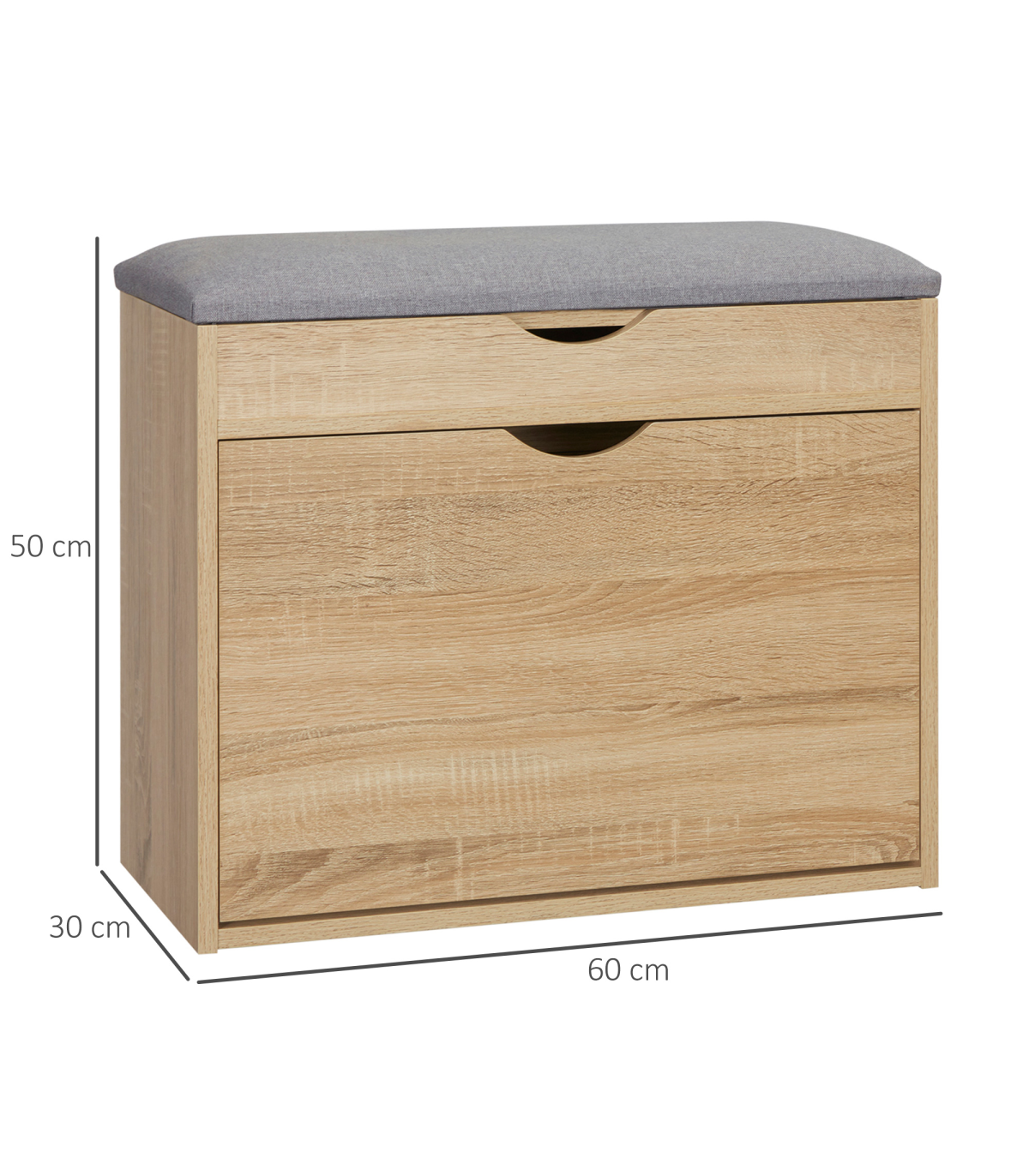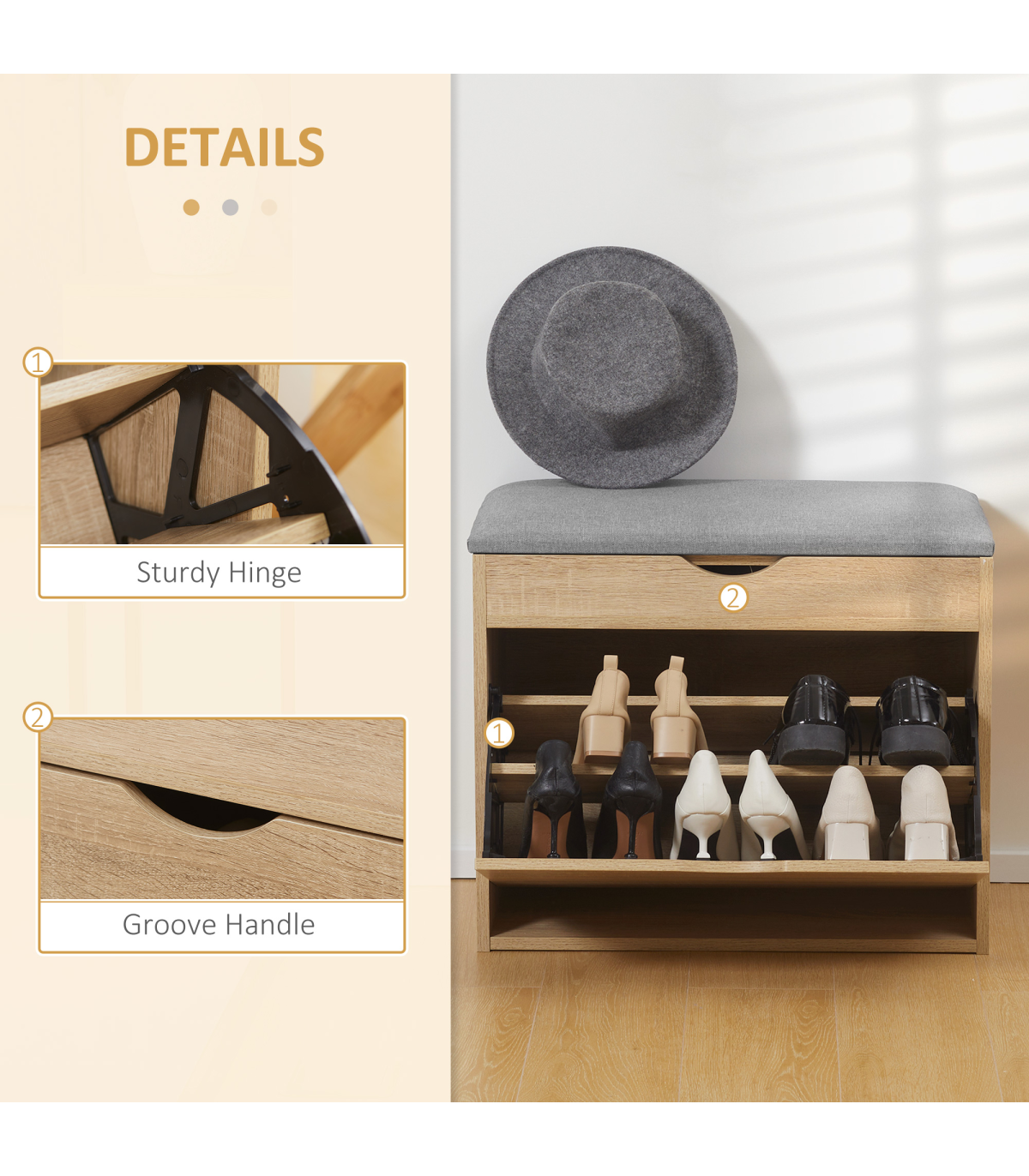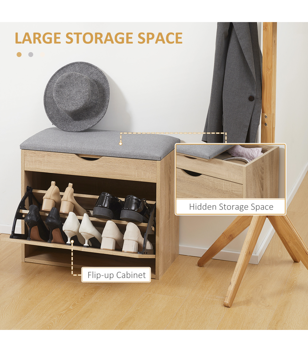 This HOMCOM Entryway Shoe Bench with Cushion Storage Cabinet is a compact and comfortable shoe storage solution. Perfect for keeping your hallway organized, this shoe cupboard features a flip-up cabinet that can hold approximately four pairs of shoes. The small top compartment is ideal for storing small items and is concealed under the padded lift-up lid, which also doubles as a comfortable seat for putting on and taking off your shoes. Complete with convenient groove handles, this shoe storage bench is both practical and stylish.
