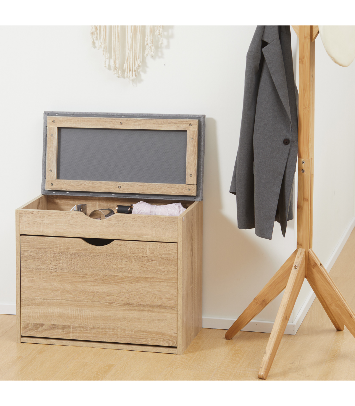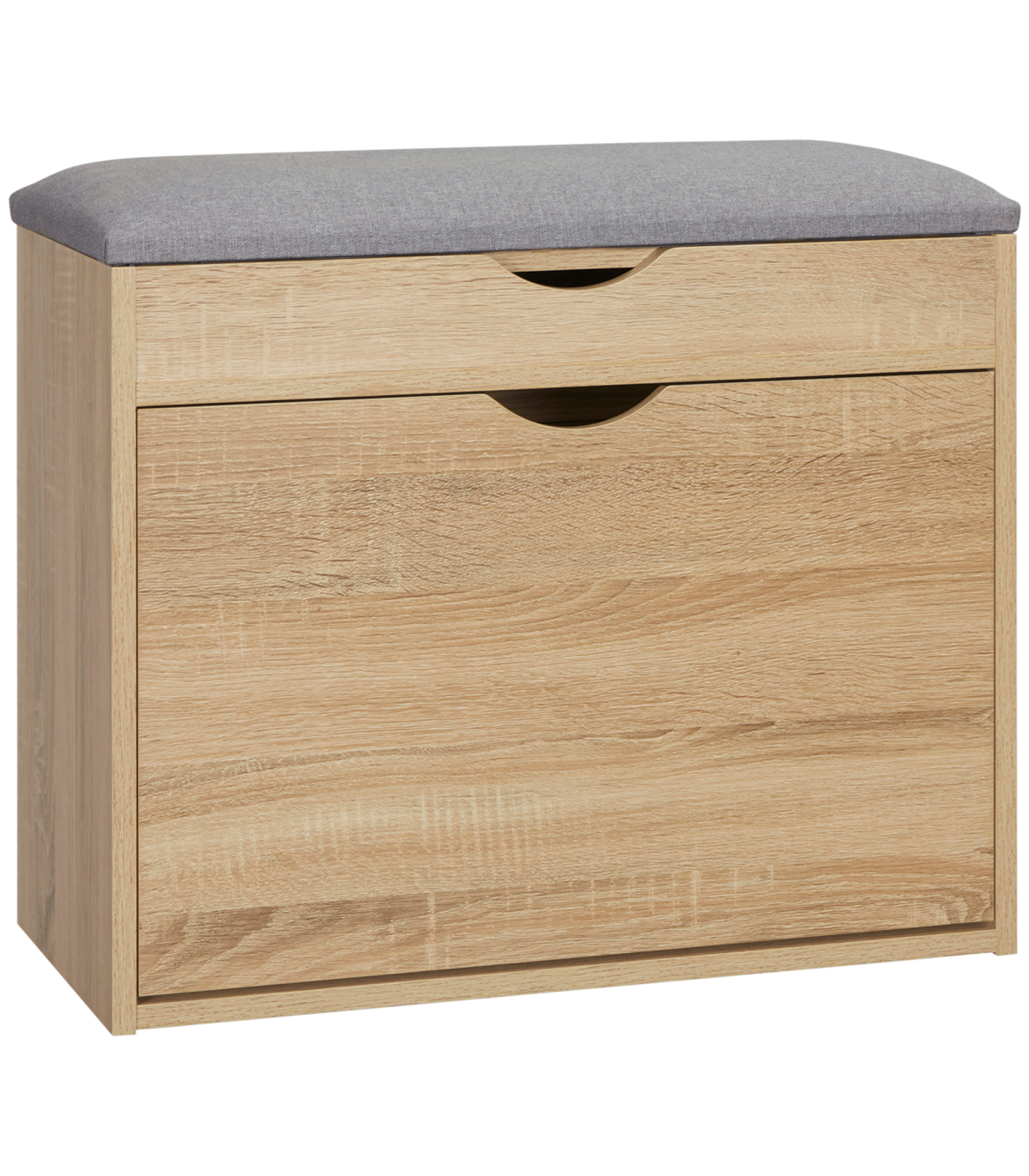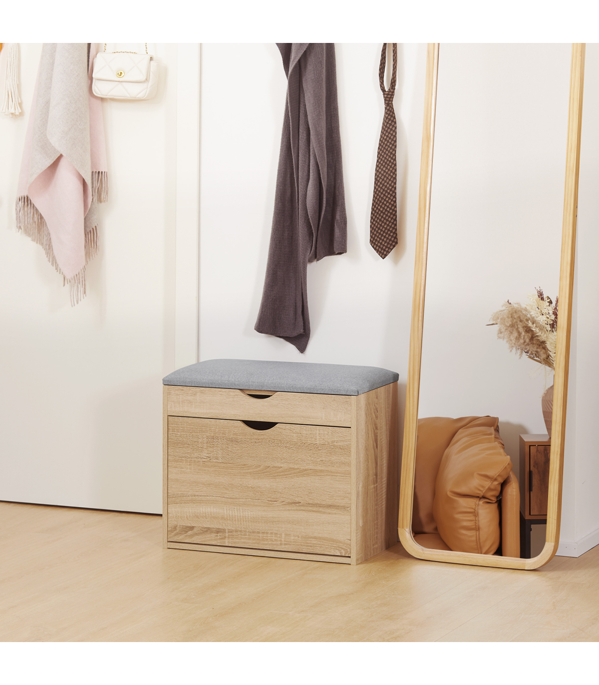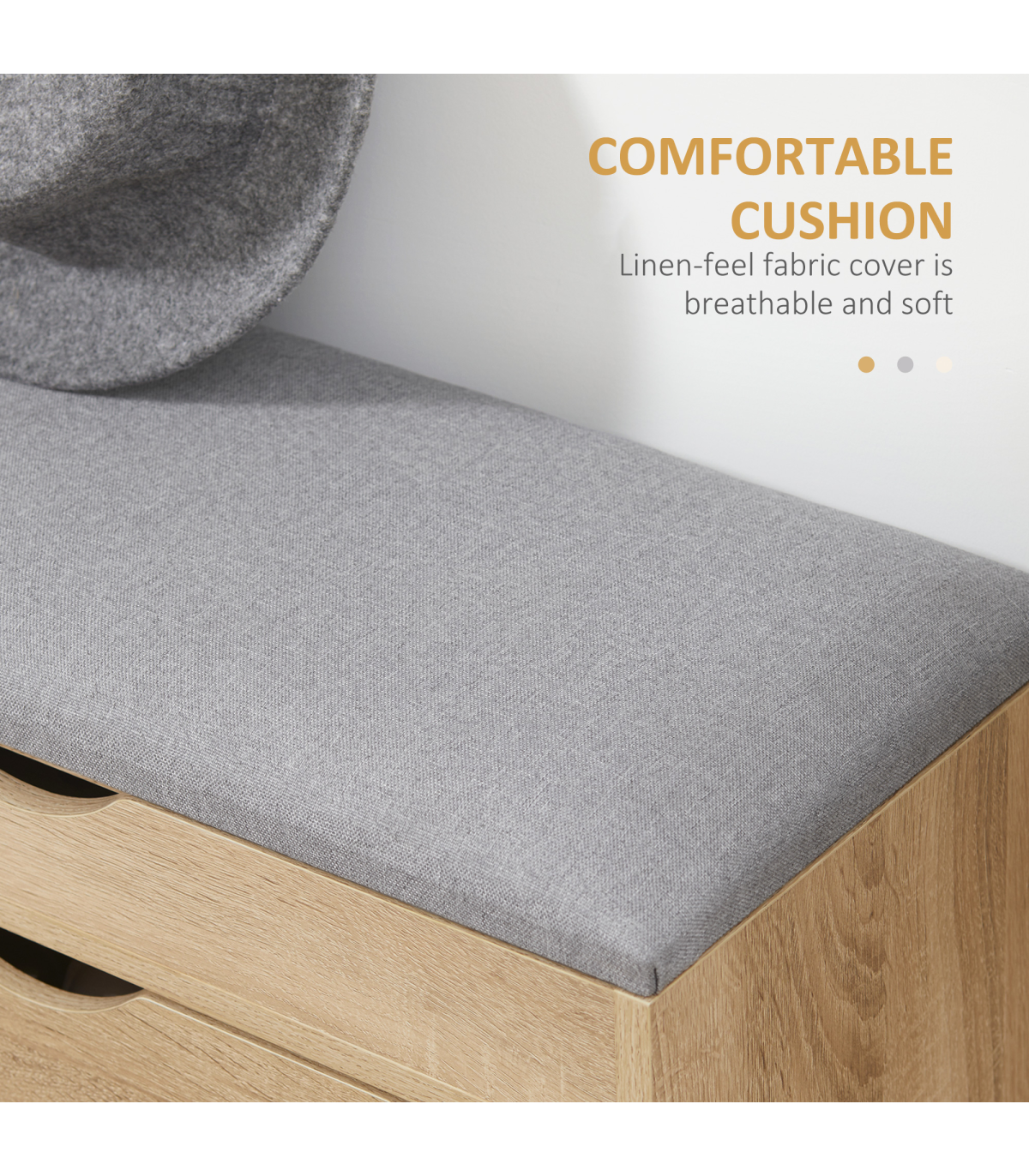 This HOMCOM Entryway Shoe Bench with Cushion Storage Cabinet is a compact and comfortable shoe storage solution. Perfect for keeping your hallway organized, this shoe cupboard features a flip-up cabinet that can hold approximately four pairs of shoes. The small top compartment is ideal for storing small items and is concealed under the padded lift-up lid, which also doubles as a comfortable seat for putting on and taking off your shoes. Complete with convenient groove handles, this shoe storage bench is both practical and stylish.