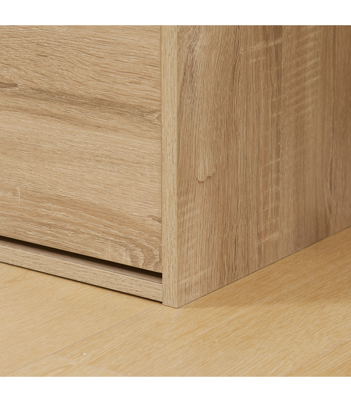 - Two-part storage: A small top compartment with lid and bottom cupboard with flip-up panel