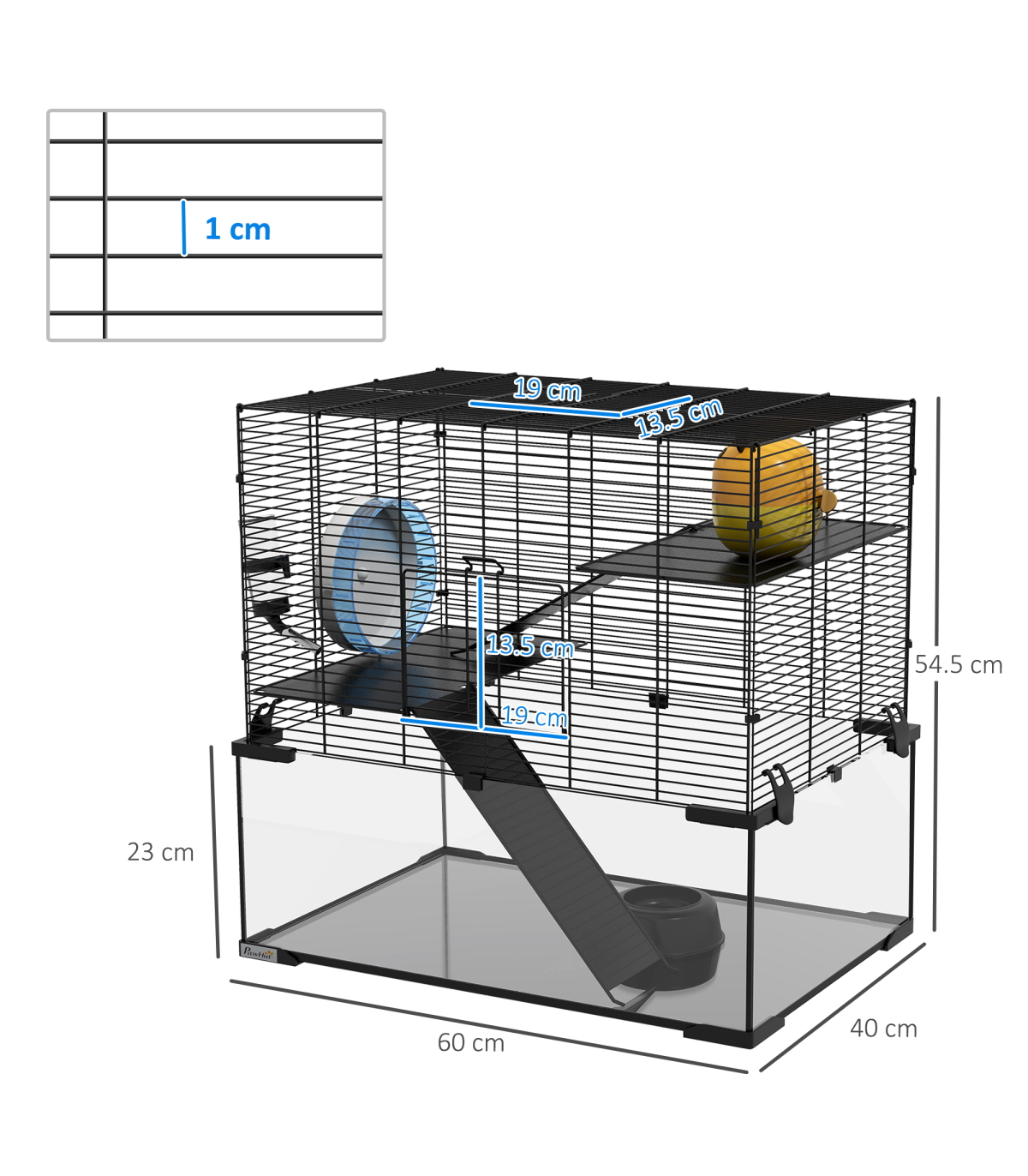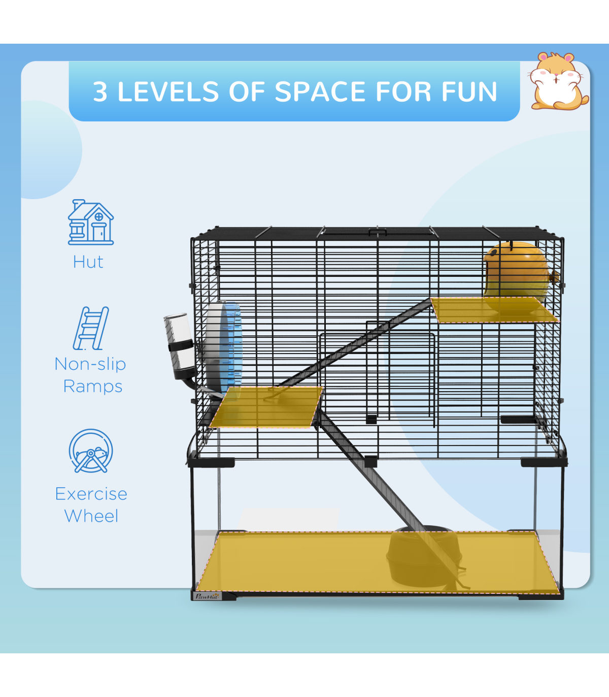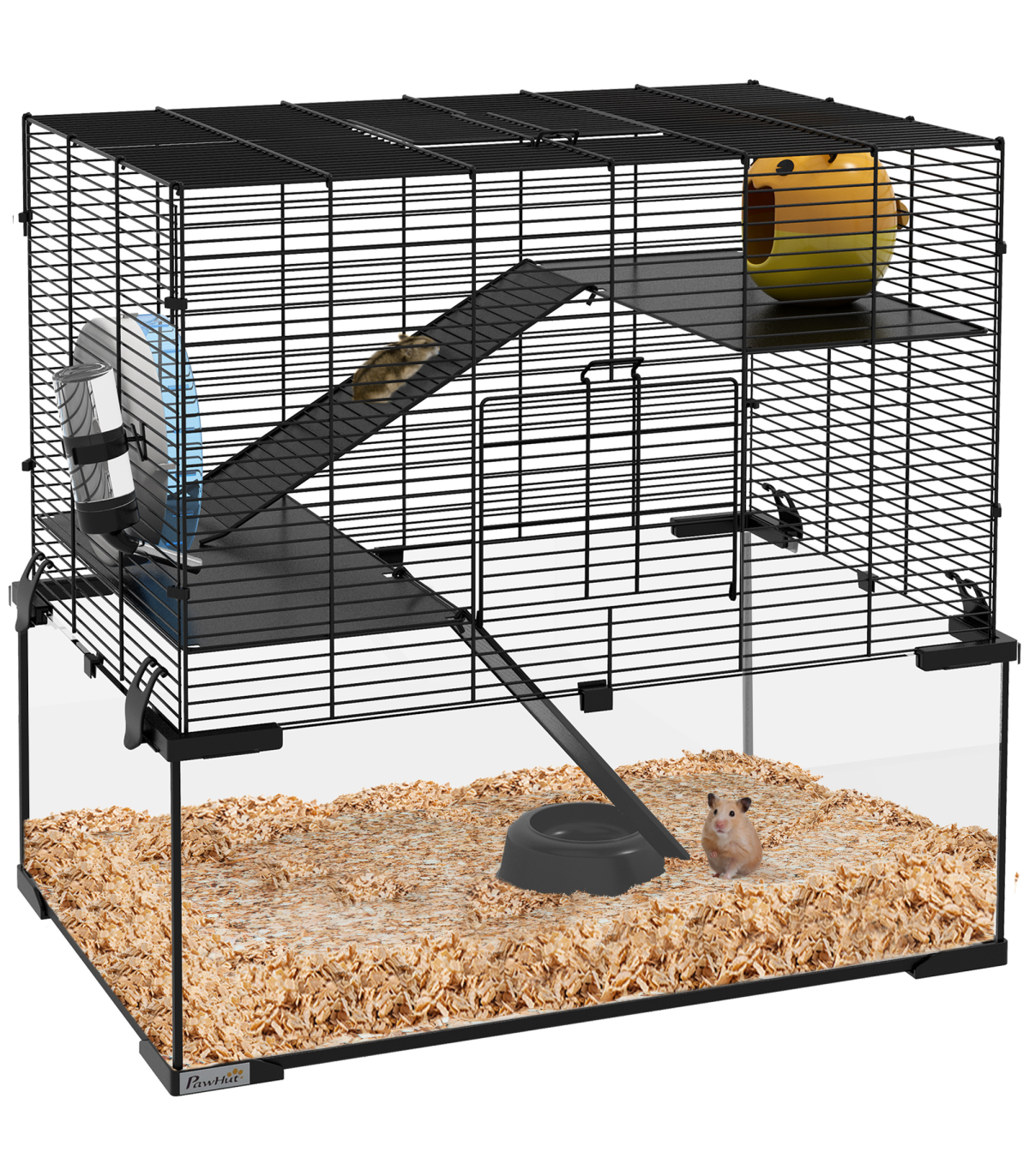 Three tiers: - Spacious hamster cage with running wheel, ramps, and hut - Ideal space for pets to roam, play, exercise, rest, and nap Easy access: - Top and front doors for easy cleaning and access Secure and ventilated: - Soft yet sturdy KT shock-absorbing board - Tempered glass base for easy cleaning - Footpads for balance - Spaced wiring for airflow Food bowl and water bottle included Dimensions: - 57H x 60L x 40W cm - Suitable for Syrian hamsters, dwarf hamsters, gerbils, and other small pets - Assembly required This PawHut hamster cage provides a spacious, multi-level home for pets. It includes a running wheel and ramps for exercise and play, as well as a private hut for relaxation. The tempered glass base with footpads ensures safety, while the spaced wiring promotes airflow to keep pets cool and cosy. Treat your pets to the ideal living space with this hamster cage.