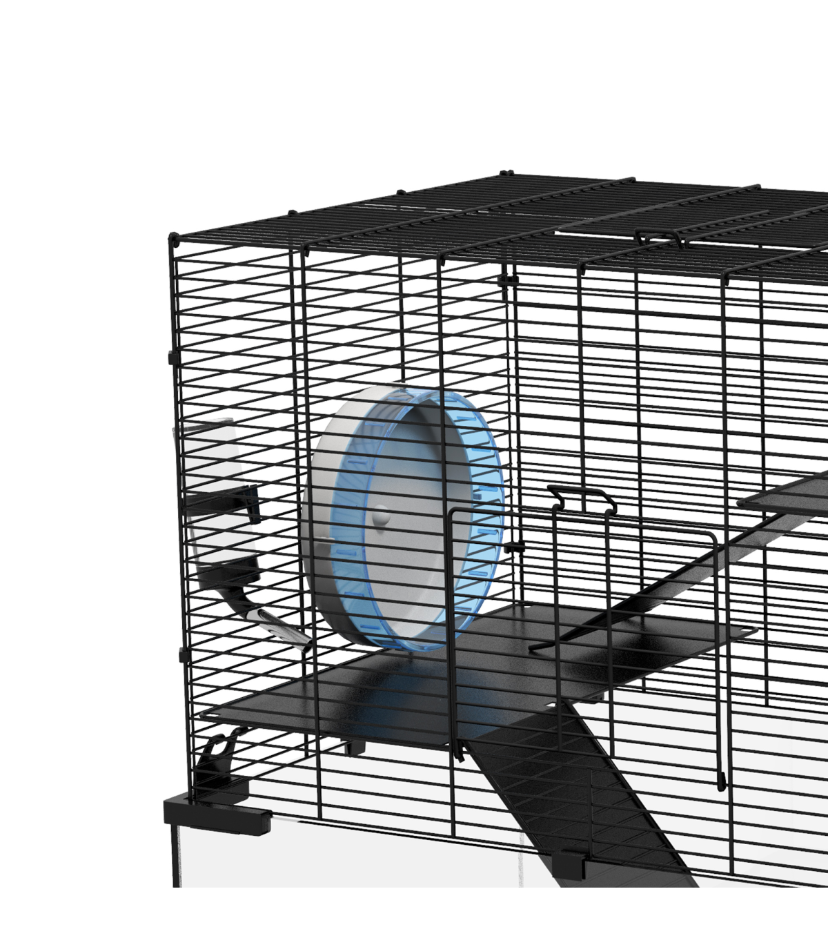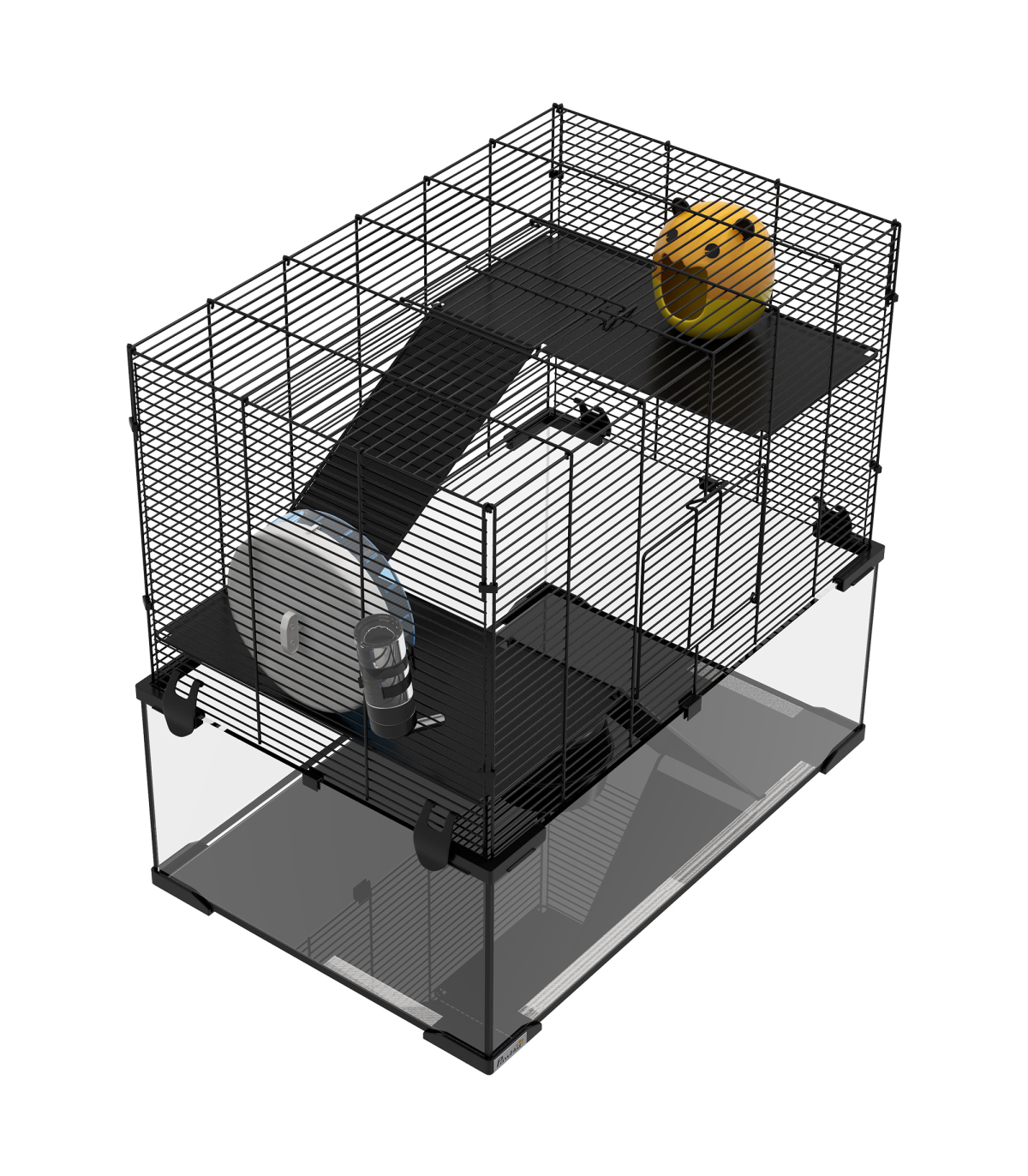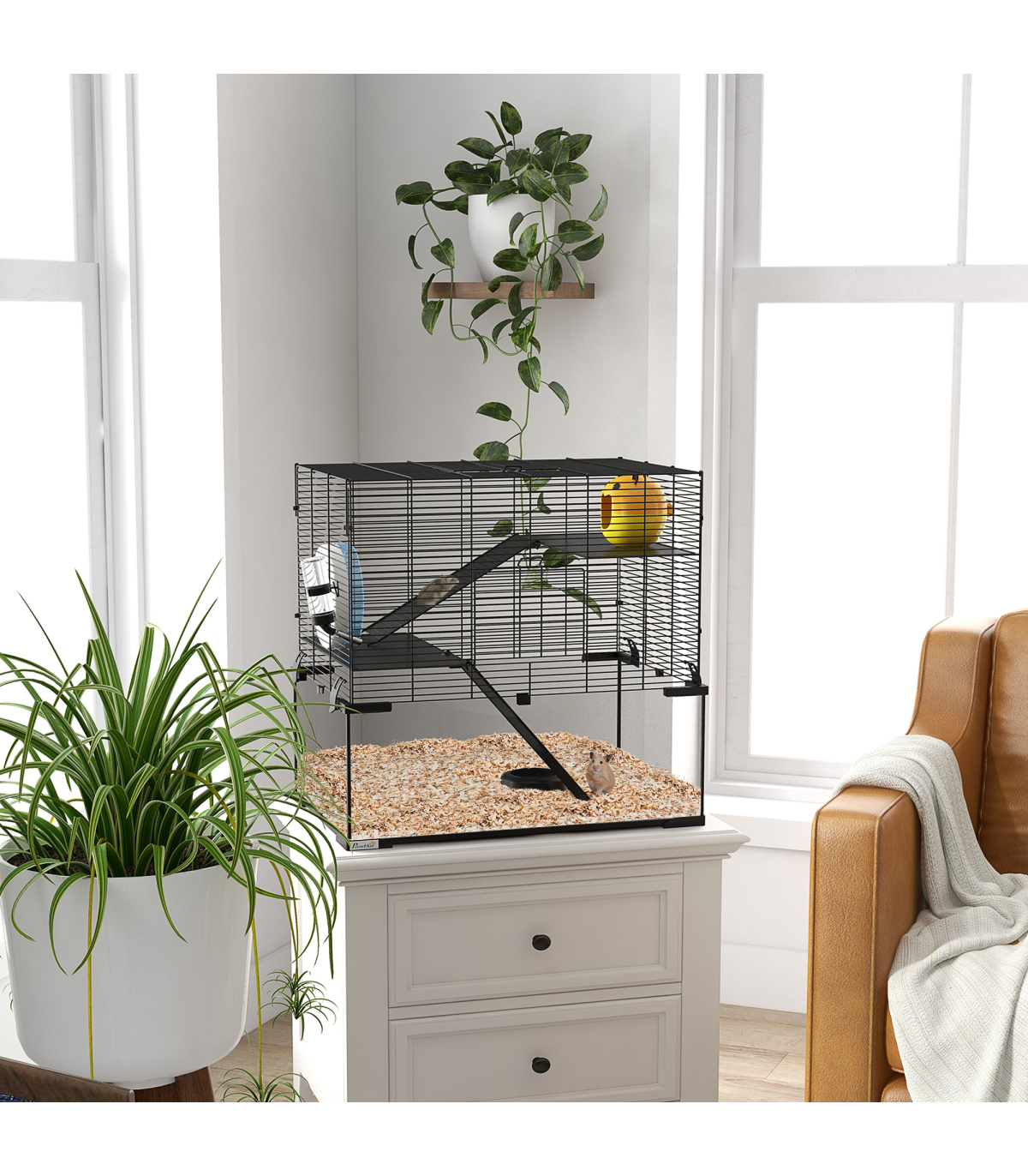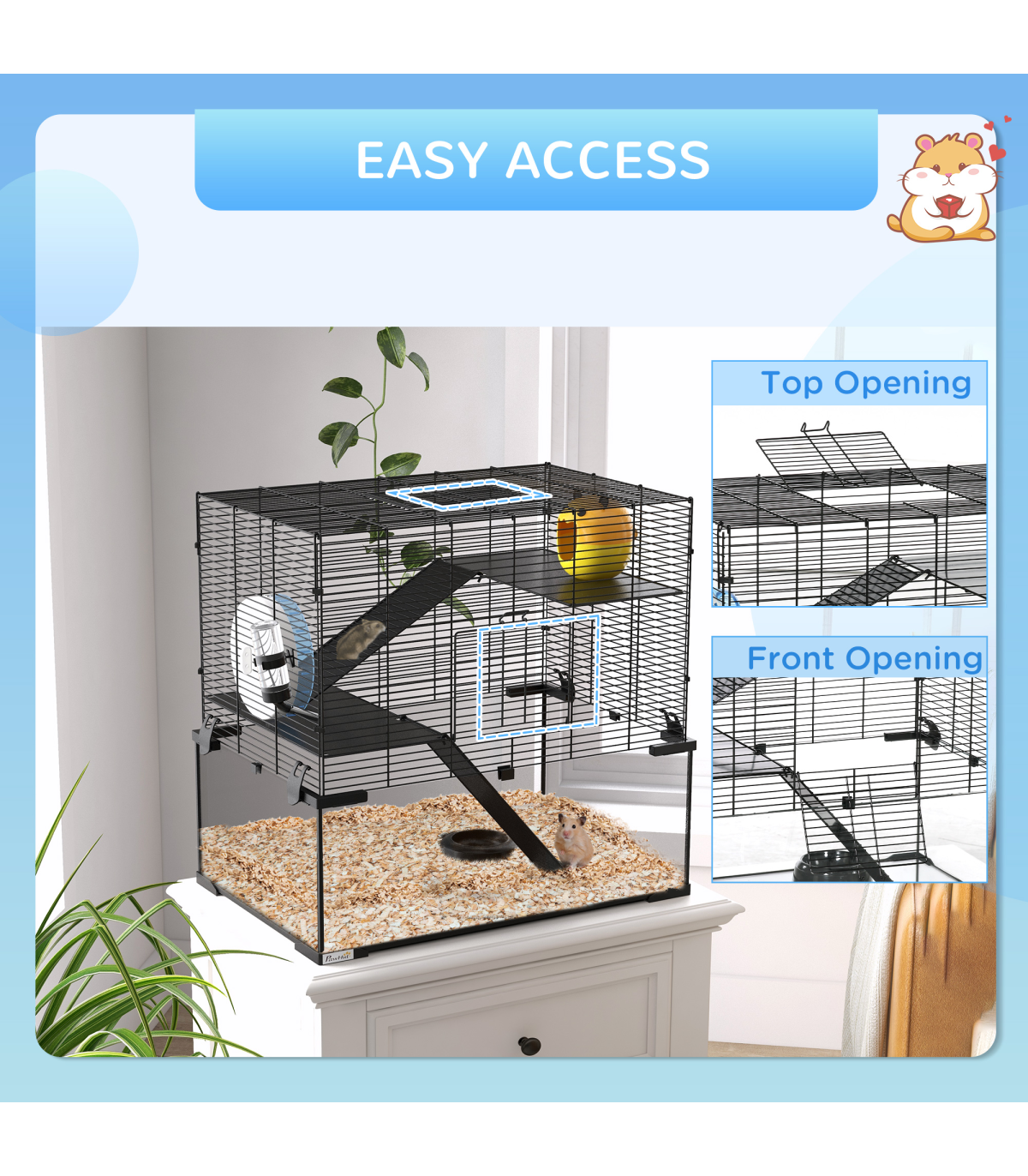 Three tiers: - Spacious hamster cage with running wheel, ramps, and hut - Ideal space for pets to roam, play, exercise, rest, and nap Easy access: - Top and front doors for easy cleaning and access Secure and ventilated: - Soft yet sturdy KT shock-absorbing board - Tempered glass base for easy cleaning - Footpads for balance - Spaced wiring for airflow Food bowl and water bottle included Dimensions: - 57H x 60L x 40W cm - Suitable for Syrian hamsters, dwarf hamsters, gerbils, and other small pets - Assembly required This PawHut hamster cage provides a spacious, multi-level home for pets. It includes a running wheel and ramps for exercise and play, as well as a private hut for relaxation. The tempered glass base with footpads ensures safety, while the spaced wiring promotes airflow to keep pets cool and cosy. Treat your pets to the ideal living space with this hamster cage.