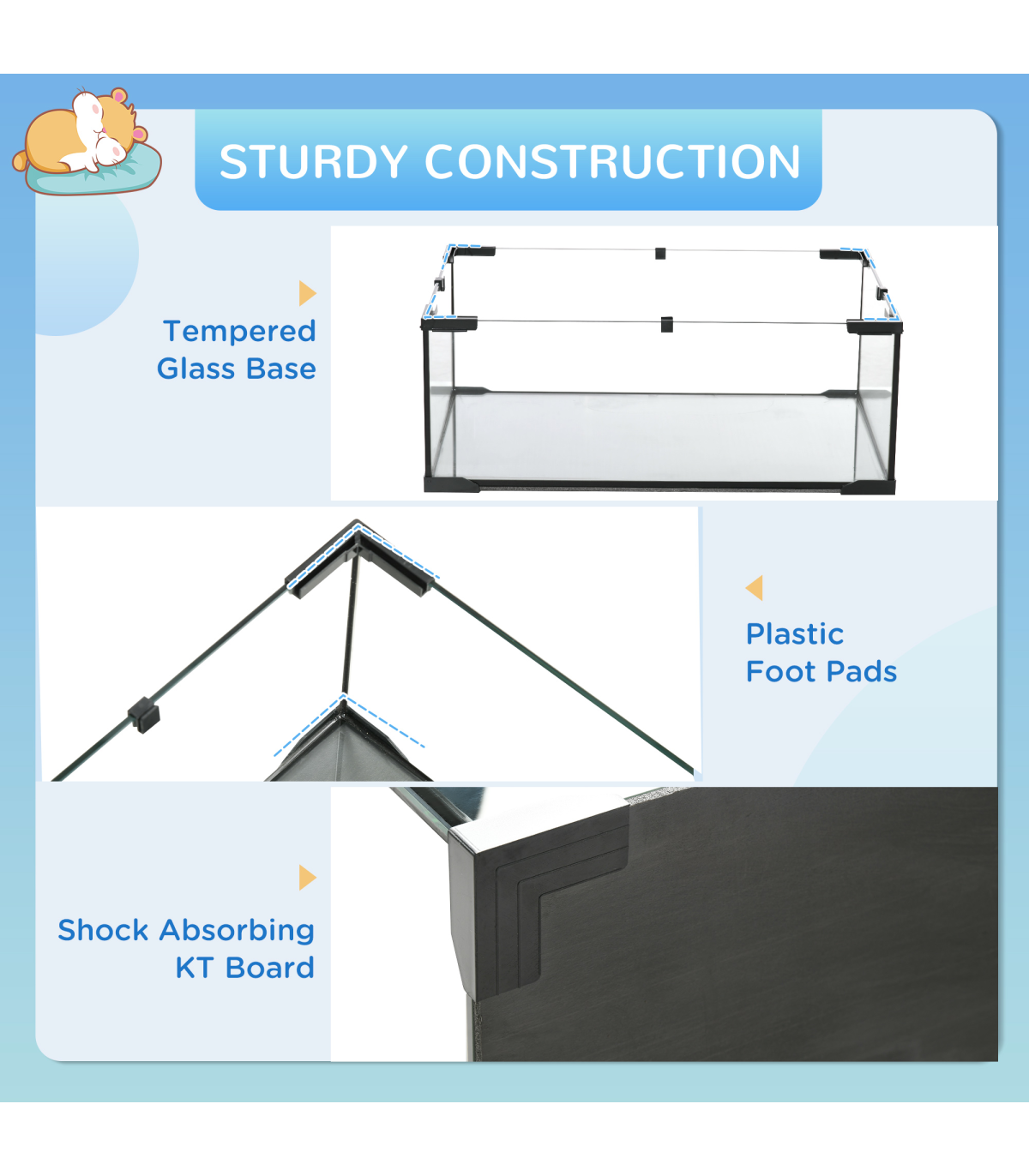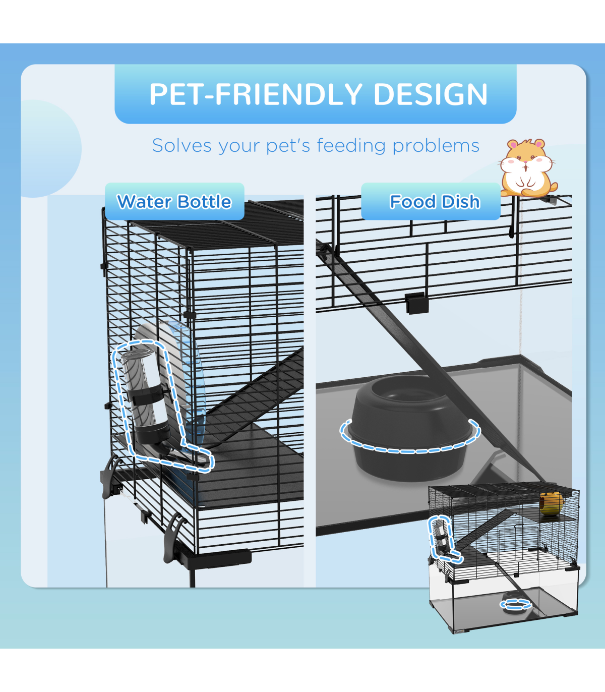 This PawHut hamster cage for dwarf hamster provides a spacious, multi-level home for pets, with an included running wheel and ramps for exercise and play. A private, cosy hut offers a place to relax, whilst an accessible food bowl and water bottle keep them fed and hydrated. The tempered glass base with footpads ensures safety and security, whilst the spaced wiring promotes airflow, keeping them cool and cosy. Invest in your pets' comfort and happiness by treating the to the ideal living space.