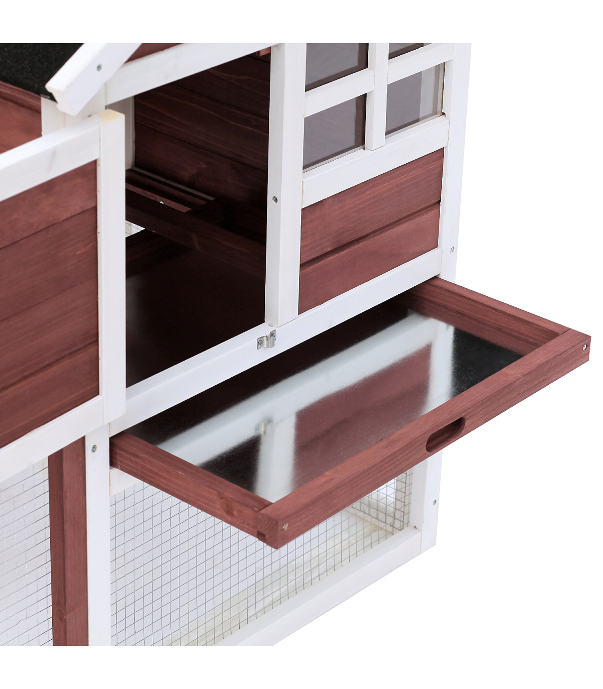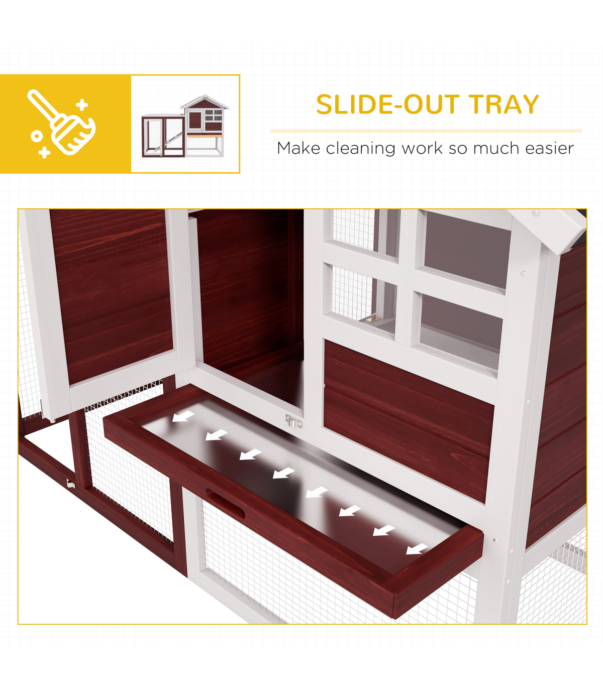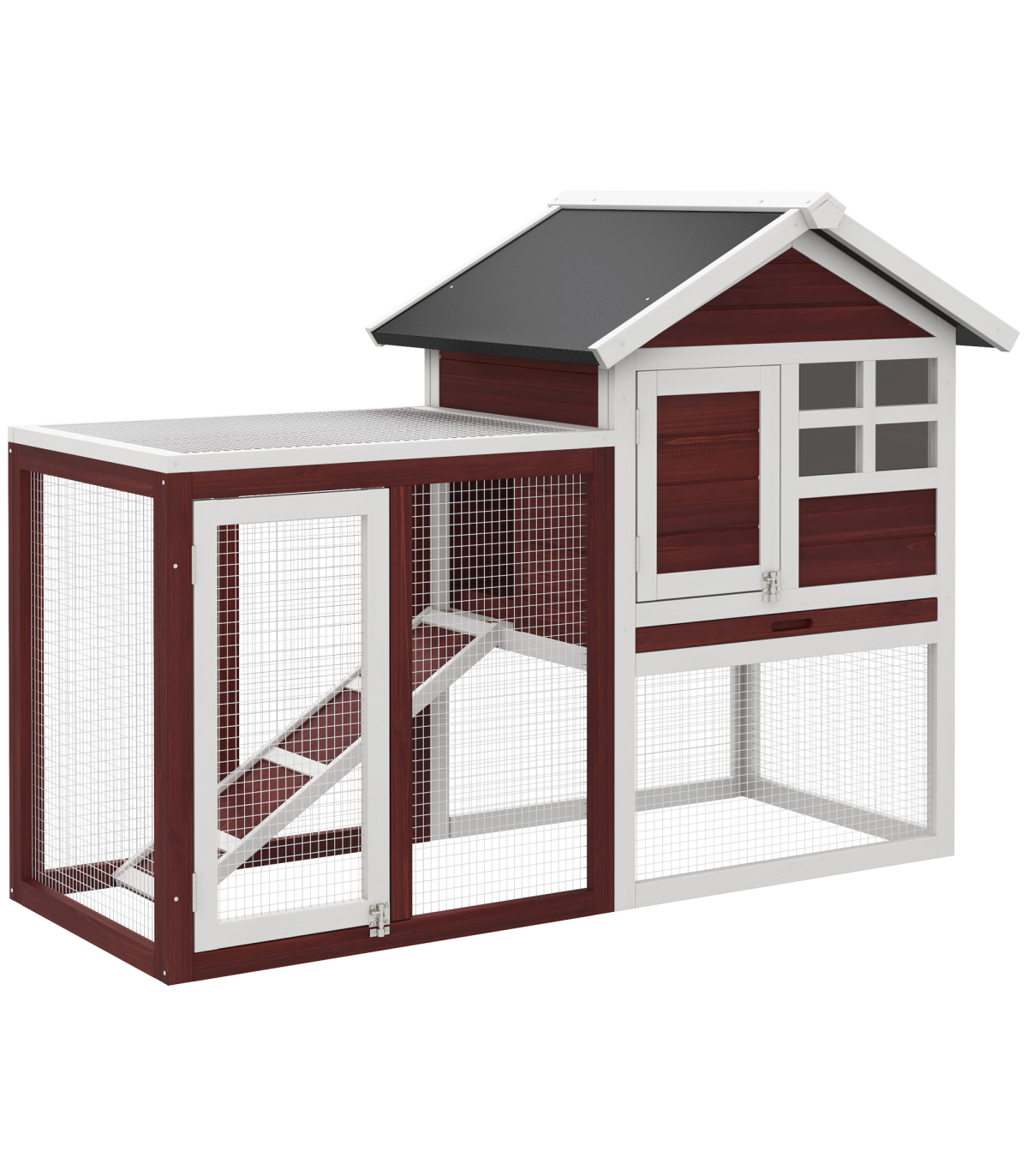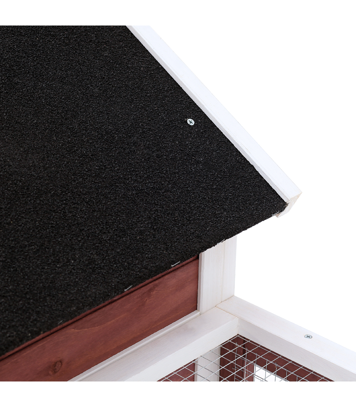 The ideal home for small pets - this PawHut indoor rabbit hutch provides space and comfort. The two-story design is made from solid fir wood and coated with water-based paint, keeping it protected against mild weathering. There is a steel wire outdoor run, allowing your pet to enjoy fresh air without them escaping. Two easy-open doors and a pull-out tray ensure easy access inside for cleaning and upkeep. It's finished with asphalt on the roof for extra protection.