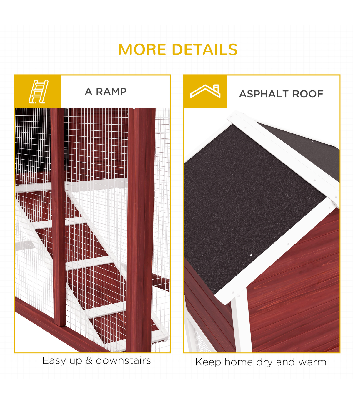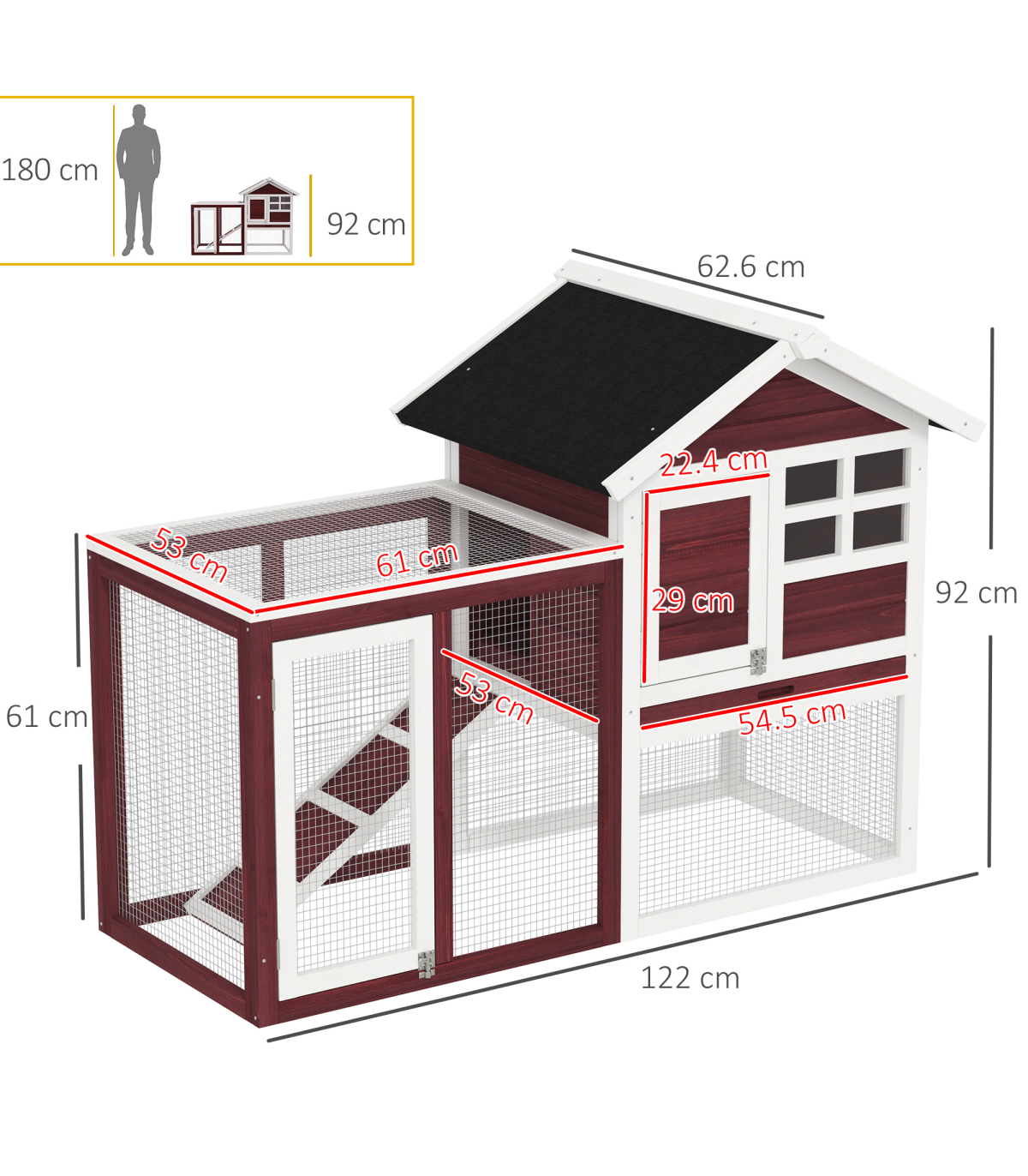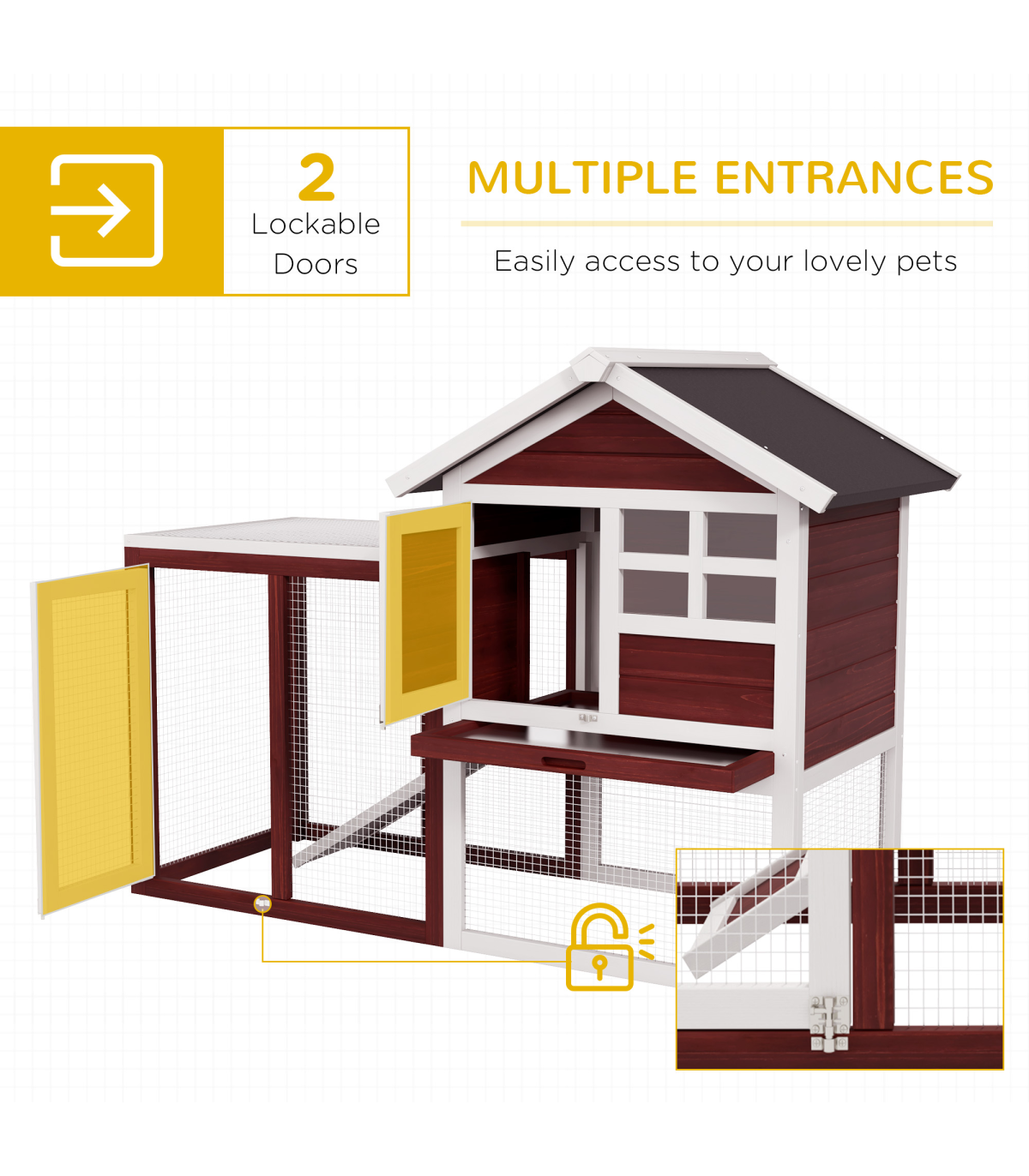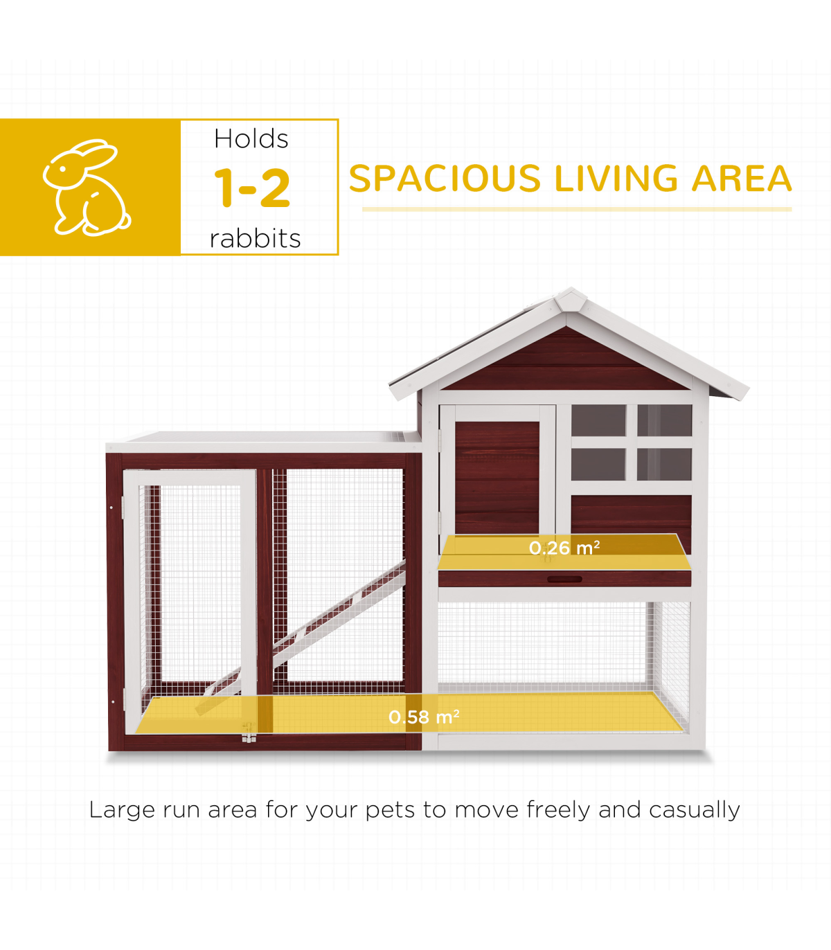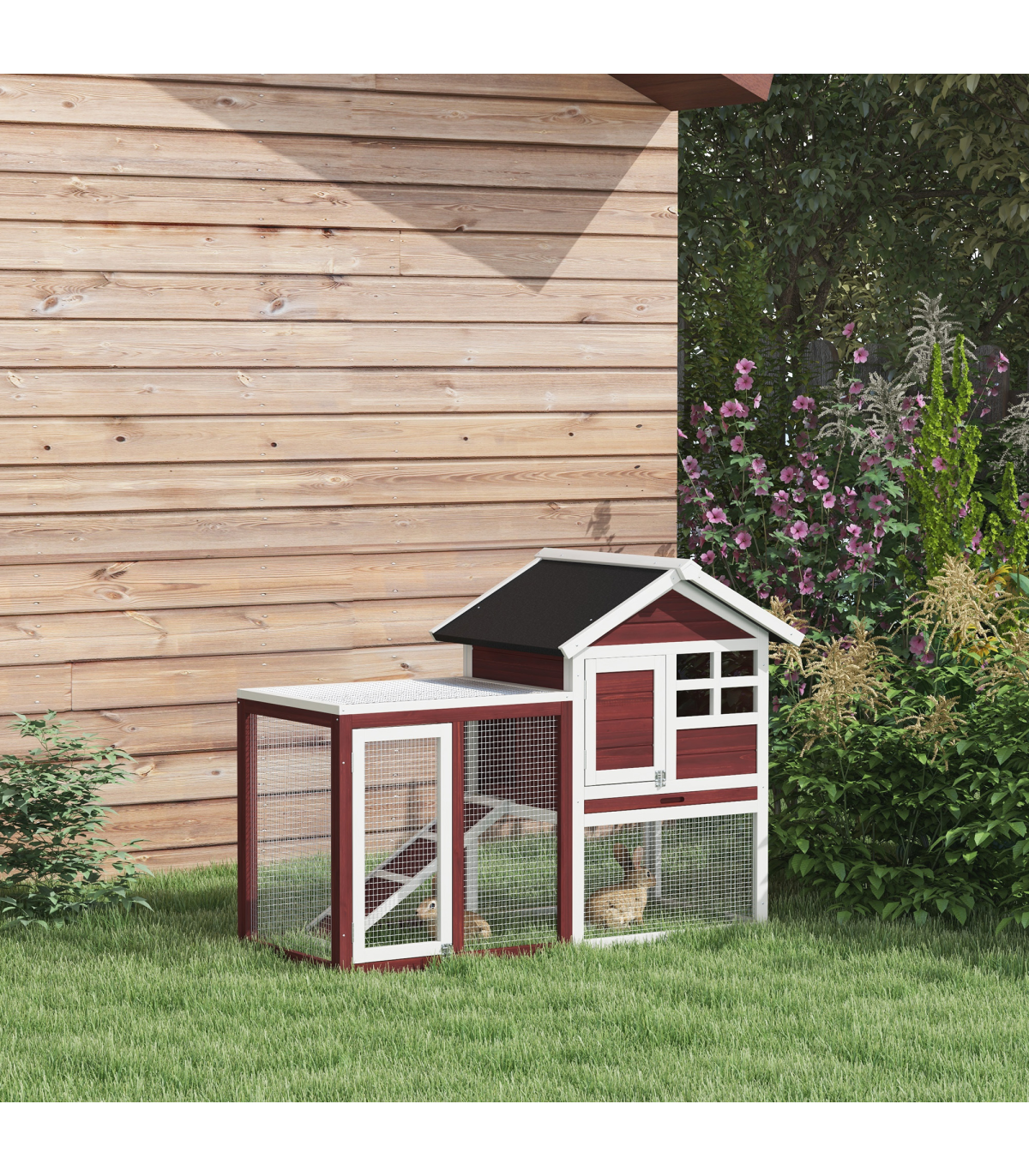 The ideal home for small pets - this PawHut indoor rabbit hutch provides space and comfort. The two-story design is made from solid fir wood and coated with water-based paint, keeping it protected against mild weathering. There is a steel wire outdoor run, allowing your pet to enjoy fresh air without them escaping. Two easy-open doors and a pull-out tray ensure easy access inside for cleaning and upkeep. It's finished with asphalt on the roof for extra protection.