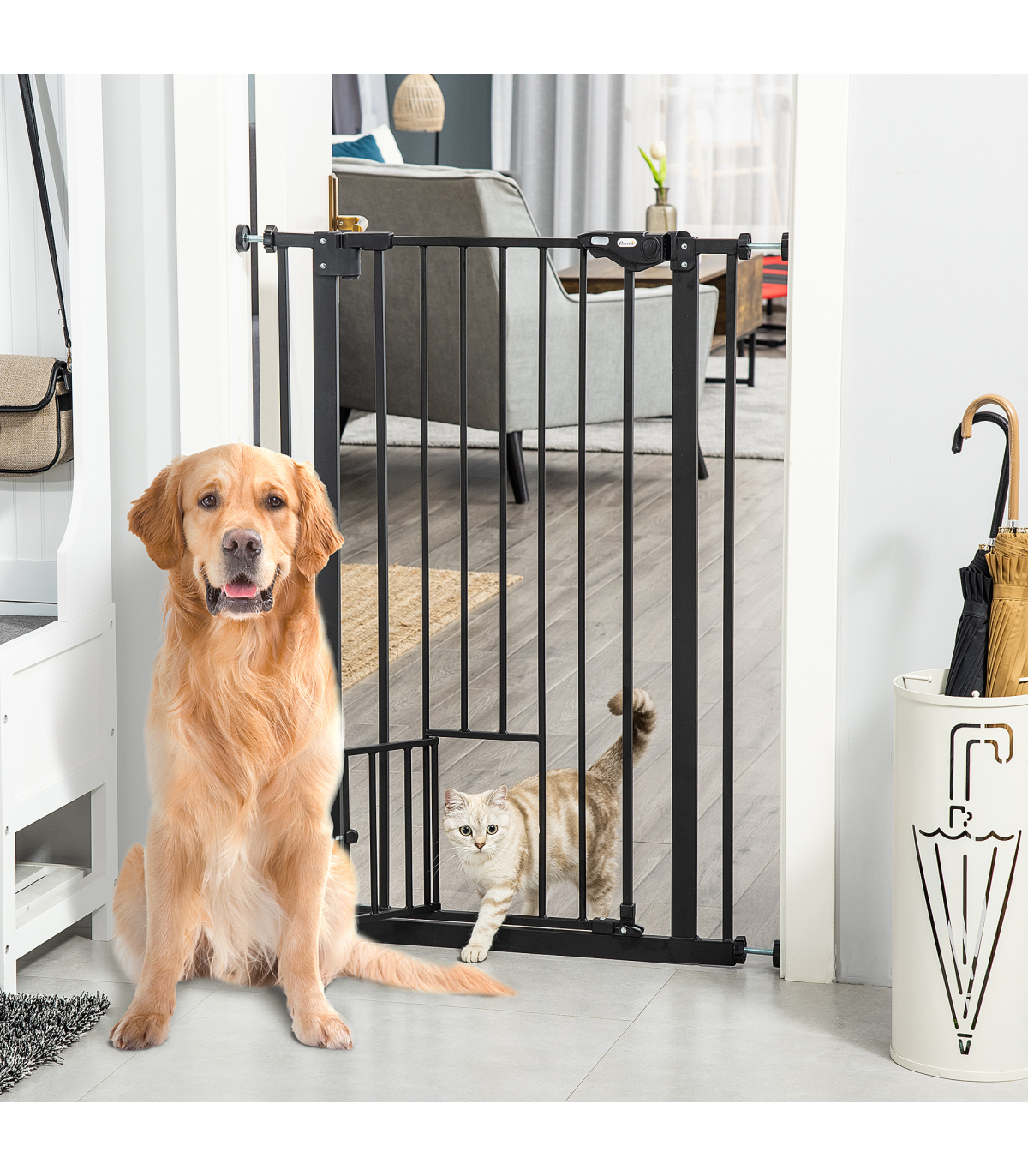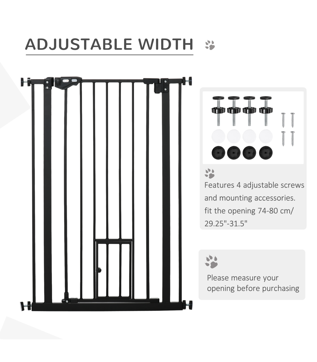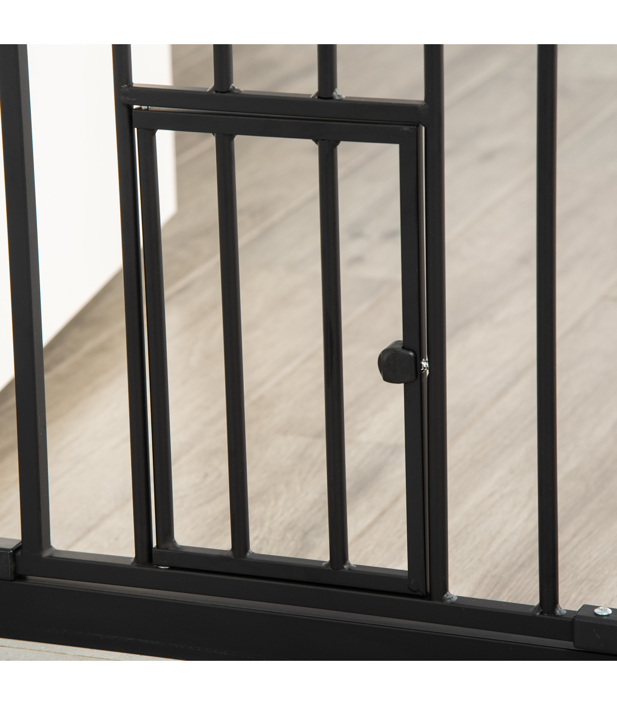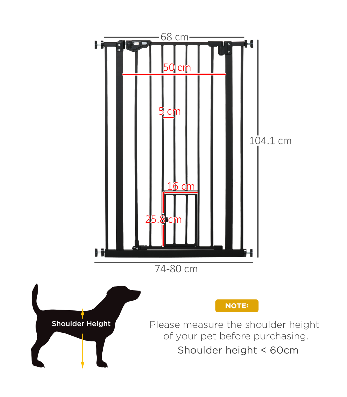 Keep pets away from rooms when required with this PawHut pet stair gate. Made from sprayed metal with lead-free treated surface for strength and safety. 74cm to 80cm wide, allows to fit into different sized spaces with ease while 104.1cm high - the extra tall gate makes it difficult for pets to get over. Slide and lift, the handle is easy to open, allowing you to pass through quickly without your pet escaping for security. Cat door provides a secure separation between cats and dogs.