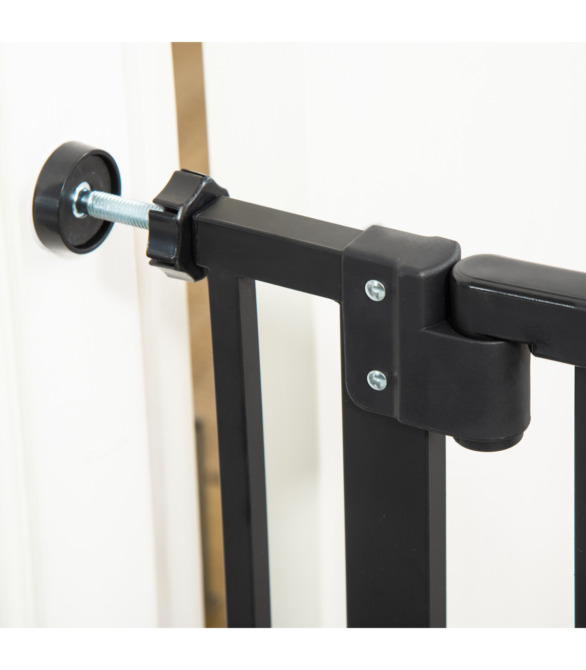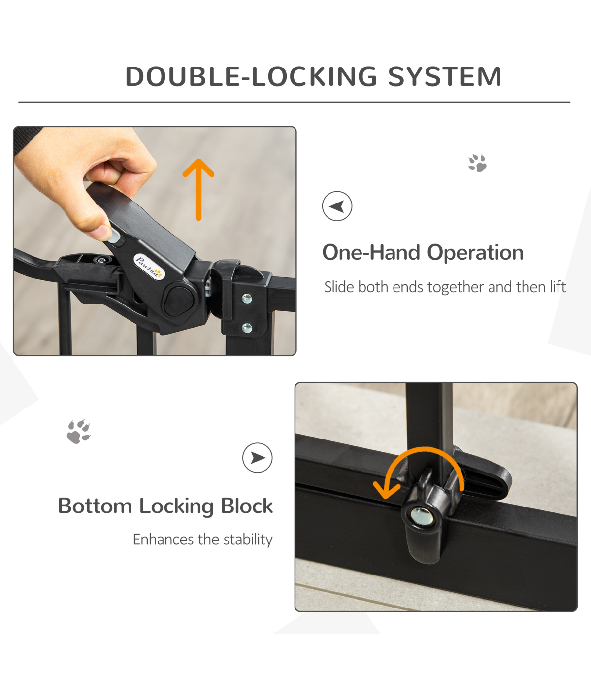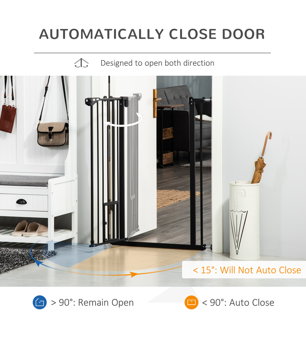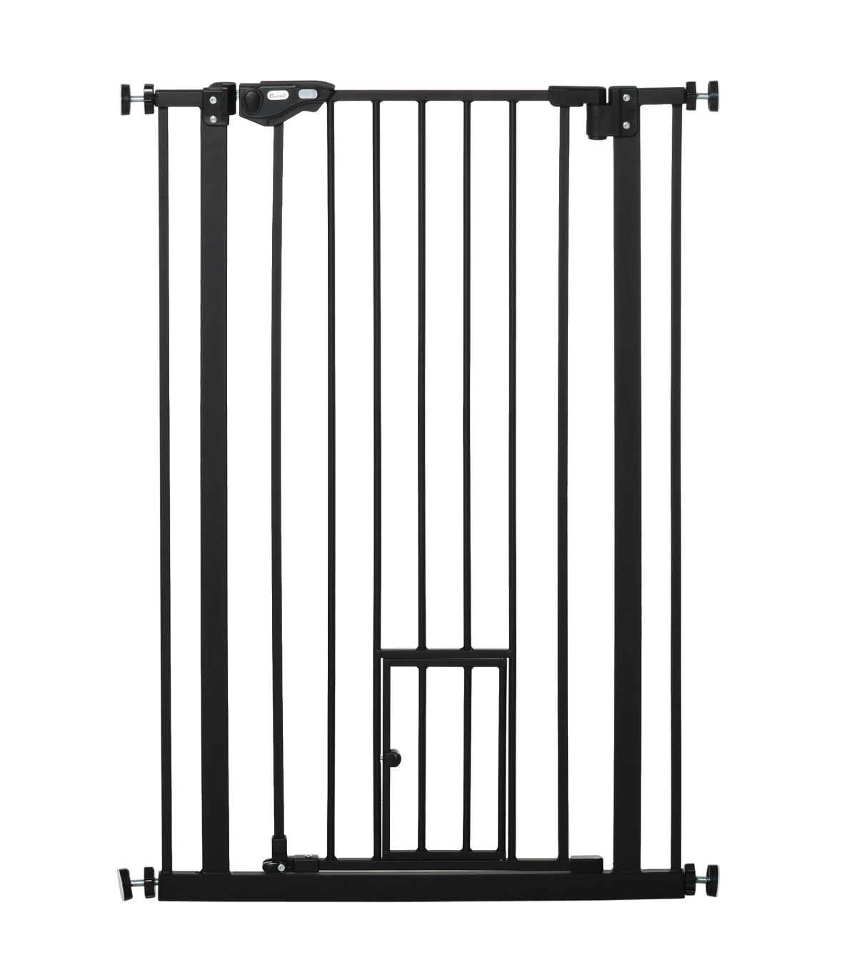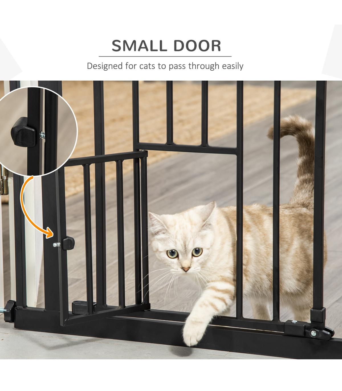 Keep pets away from rooms when required with this PawHut pet stair gate. Made from sprayed metal with lead-free treated surface for strength and safety. 74cm to 80cm wide, allows to fit into different sized spaces with ease while 104.1cm high - the extra tall gate makes it difficult for pets to get over. Slide and lift, the handle is easy to open, allowing you to pass through quickly without your pet escaping for security. Cat door provides a secure separation between cats and dogs.