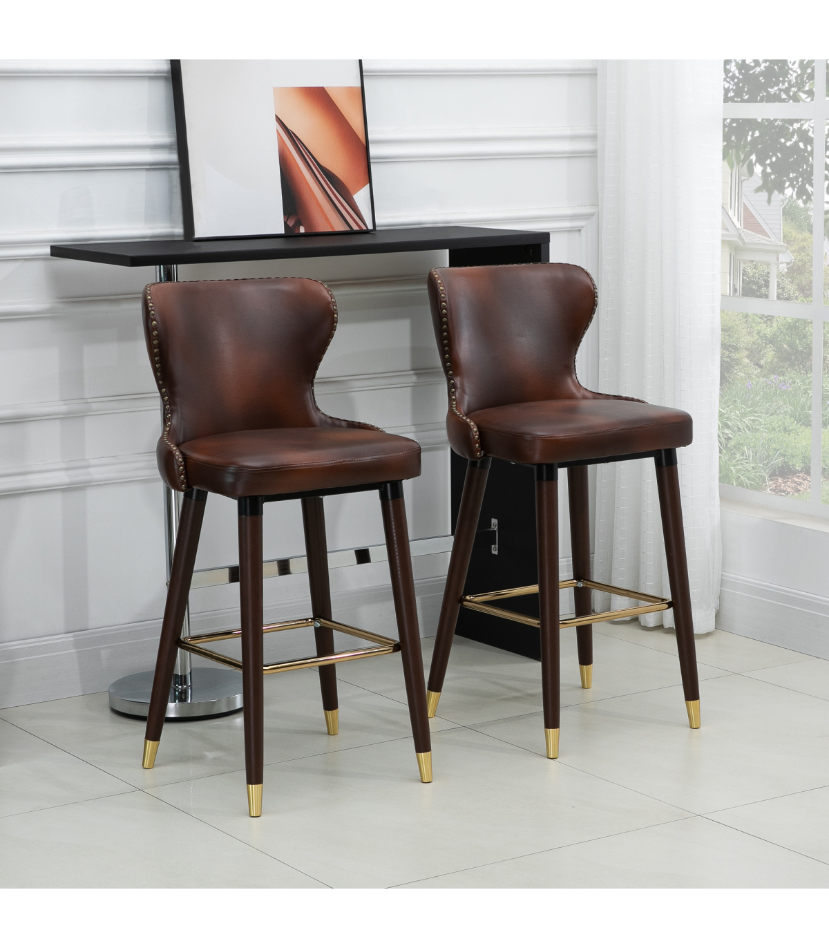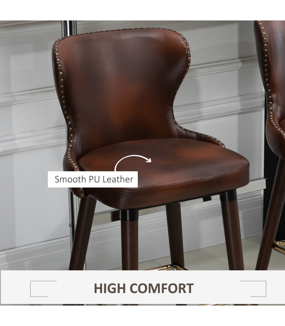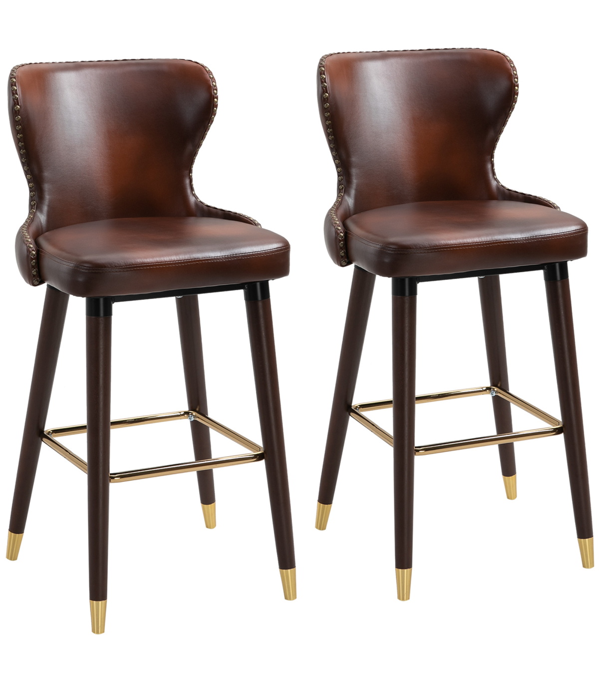 Enhance your home with this set of two luxurious bar stools featuring a sleek, retro design. The multi-tonal brown faux leather upholstery is accented with gold-colored studding on the seat edges and leg ends, adding a touch of elegance to your space. The 6cm sponge cushion seats provide a soft and comfortable seating experience, while the high curved backs offer ample support. Each stool is equipped with a strong metal frame and lower footrests for added comfort. Perfect for dining and kitchen areas, this set of bar stools allows you to enjoy company in style.