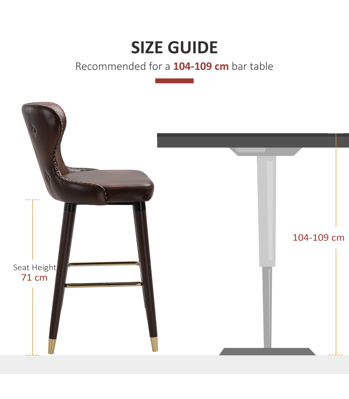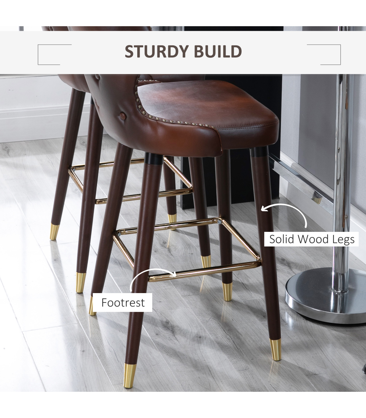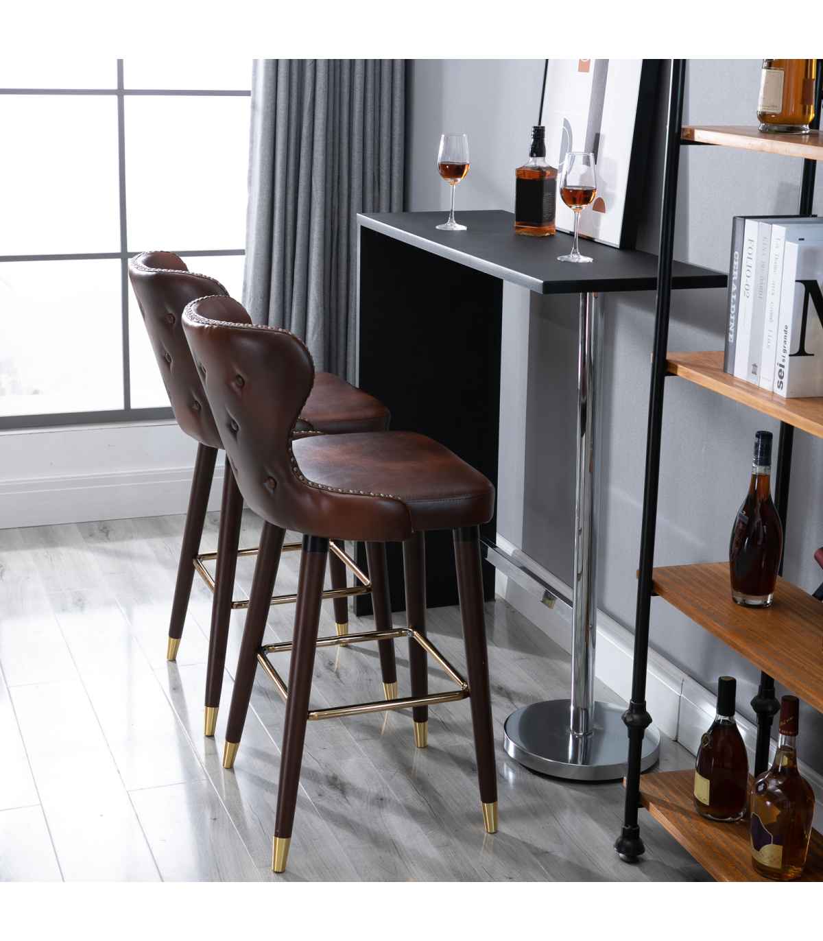 Enhance your home with this set of two luxurious bar stools featuring a sleek, retro design. The multi-tonal brown faux leather upholstery is accented with gold-colored studding on the seat edges and leg ends, adding a touch of elegance to your space. The 6cm sponge cushion seats provide a soft and comfortable seating experience, while the high curved backs offer ample support. Each stool is equipped with a strong metal frame and lower footrests for added comfort. Perfect for dining and kitchen areas, this set of bar stools allows you to enjoy company in style.