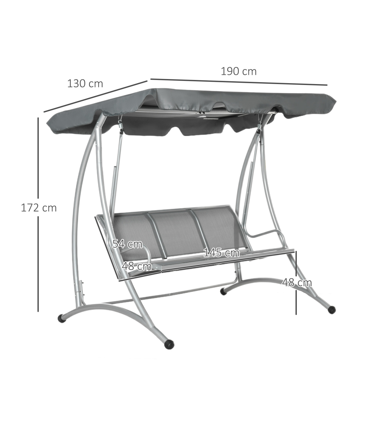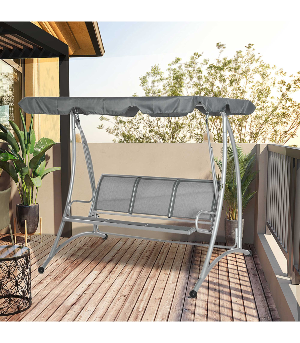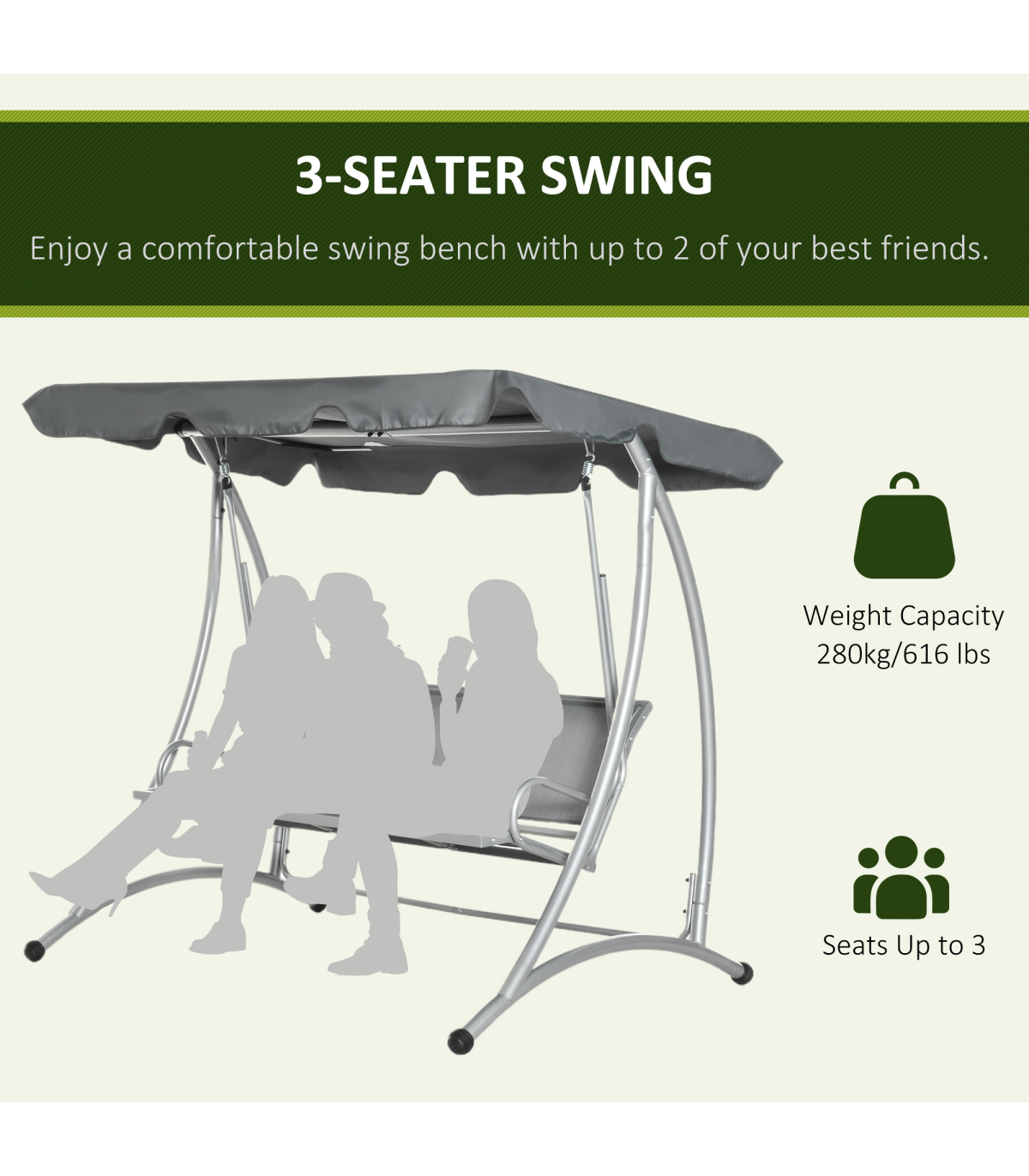 - Free standing outdoor swing designed for 3 people to sit comfortably