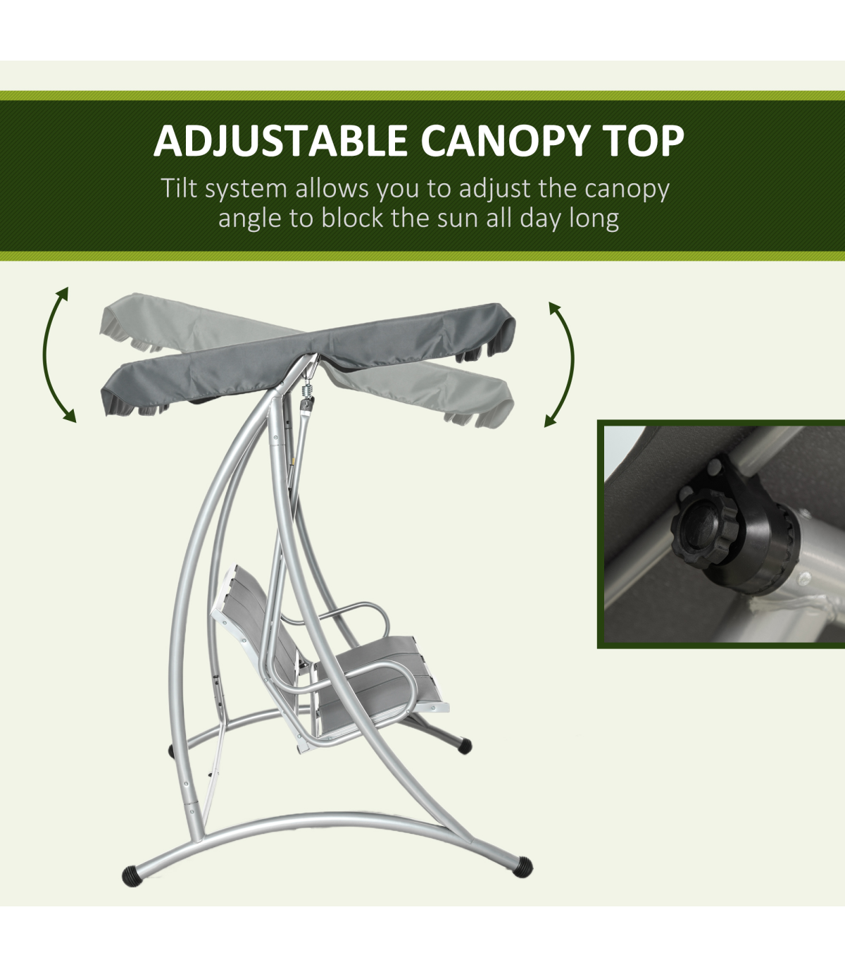 - The angle of the canopy top adjusts for optimal shade coverage