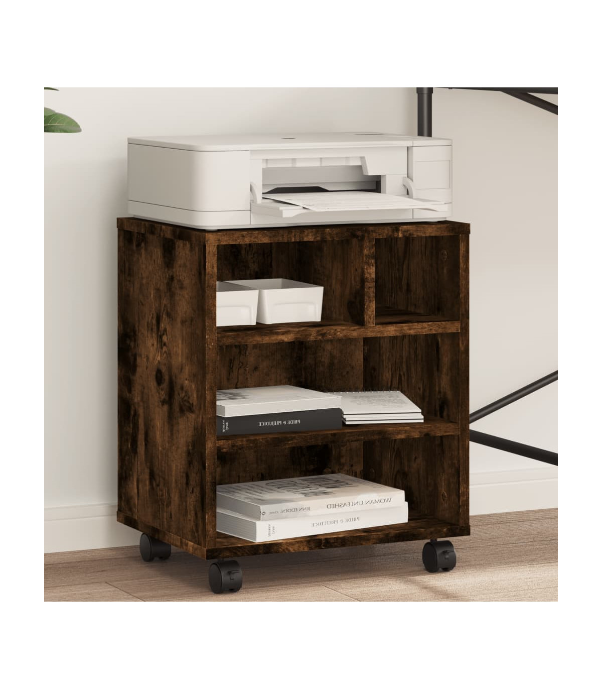 This printer stand provides easy access to everything, keeping your workplace organised and tidy. Durable material: The engineered wood is of exceptional quality with smooth surface and also features strength, stability and resistance to moisture.Ample storage space: The top shelf is designed for printers, and fax machines, with storage space underneath for files, paper, books, and other office supplies. Keep everything easily reached and make your workplace organised and tidy.Easy to move: This printer table has 4 wheels and 2 of them are lockable, making it move flexibly and park stably at any time.Multifunctional organiser: The file organiser can be used not only as a printer stand but also as a bookshelf, nightstand, coffee stand, side table, etc. It can also be widely used in the kitchen to arrange condiment jars, kitchenware, plates, and dishes.