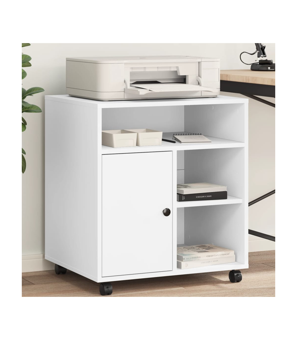 This printer stand provides easy access to everything, keeping your workplace organised and tidy. Durable material: The engineered wood is of exceptional quality with smooth surface and also features strength, stability and resistance to moisture.Ample storage space: The top shelf is designed for printers, and fax machines, with storage space underneath for files, paper, books, and other office supplies. Keep everything easily reached and make your workplace organised and tidy.Easy to move: This printer table has 4 wheels and 2 of them are lockable, making it move flexibly and park stably at any time.Multifunctional organiser: The file organiser can be used not only as a printer stand but also as a bookshelf, nightstand, coffee stand, side table, etc. It can also be widely used in the kitchen to arrange condiment jars, kitchenware, plates, and dishes.