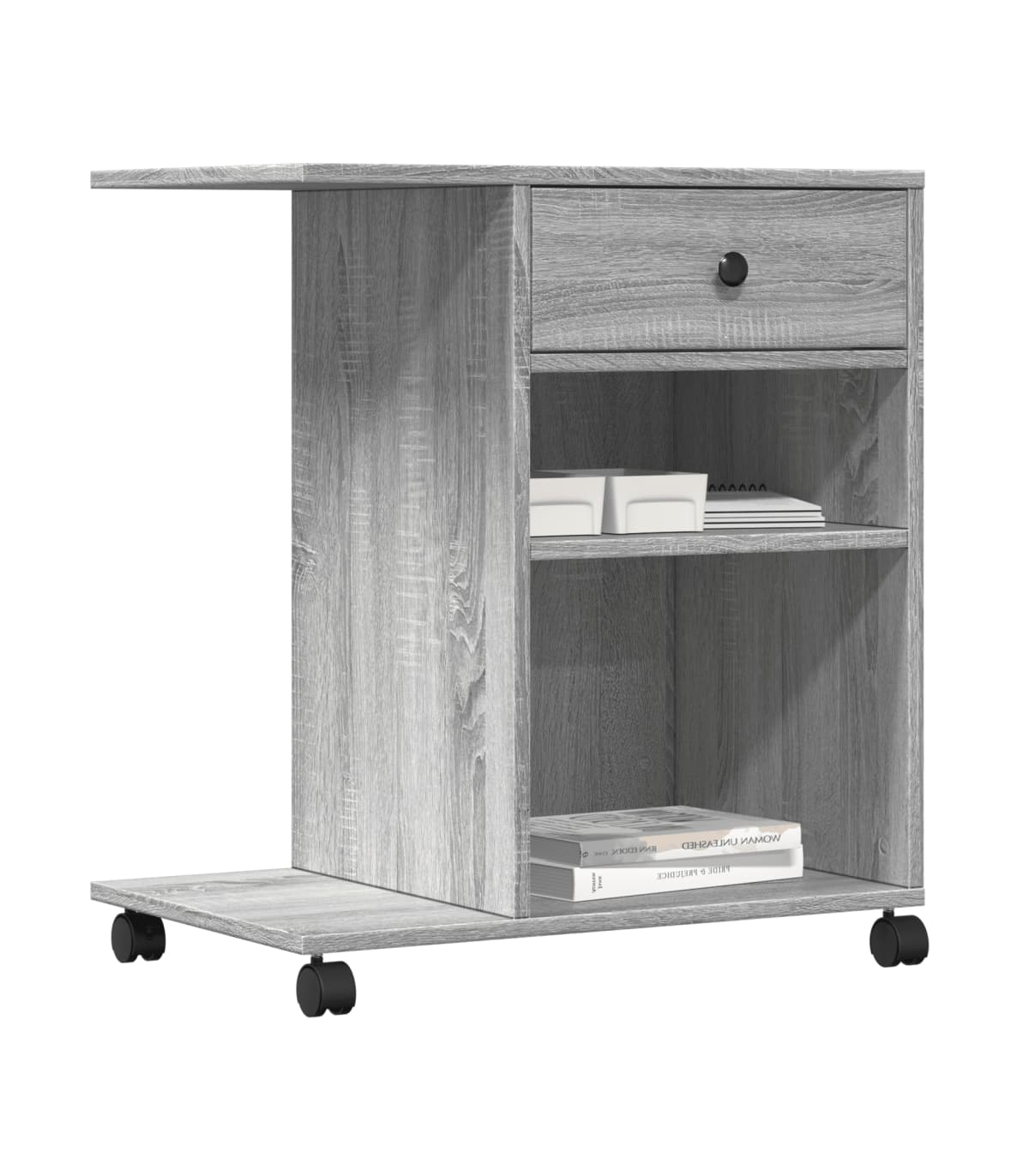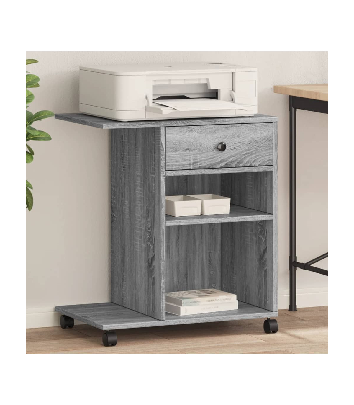 This printer stand provides easy access to everything, keeping your workplace organised and tidy. Durable material: The engineered wood is of exceptional quality with smooth surface and also features strength, stability and resistance to moisture.Ample storage space: The top shelf is designed for printers, and fax machines, with storage space underneath for files, paper, books, and other office supplies. Keep everything easily reached and make your workplace organised and tidy.Easy to move: This printer table has 4 wheels and 2 of them are lockable, making it move flexibly and park stably at any time.Multifunctional organiser: The file organiser can be used not only as a printer stand but also as a bookshelf, nightstand, coffee stand, side table, etc. It can also be widely used in the kitchen to arrange condiment jars, kitchenware, plates, and dishes.