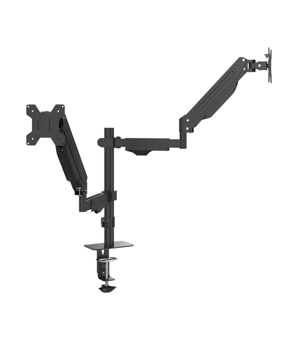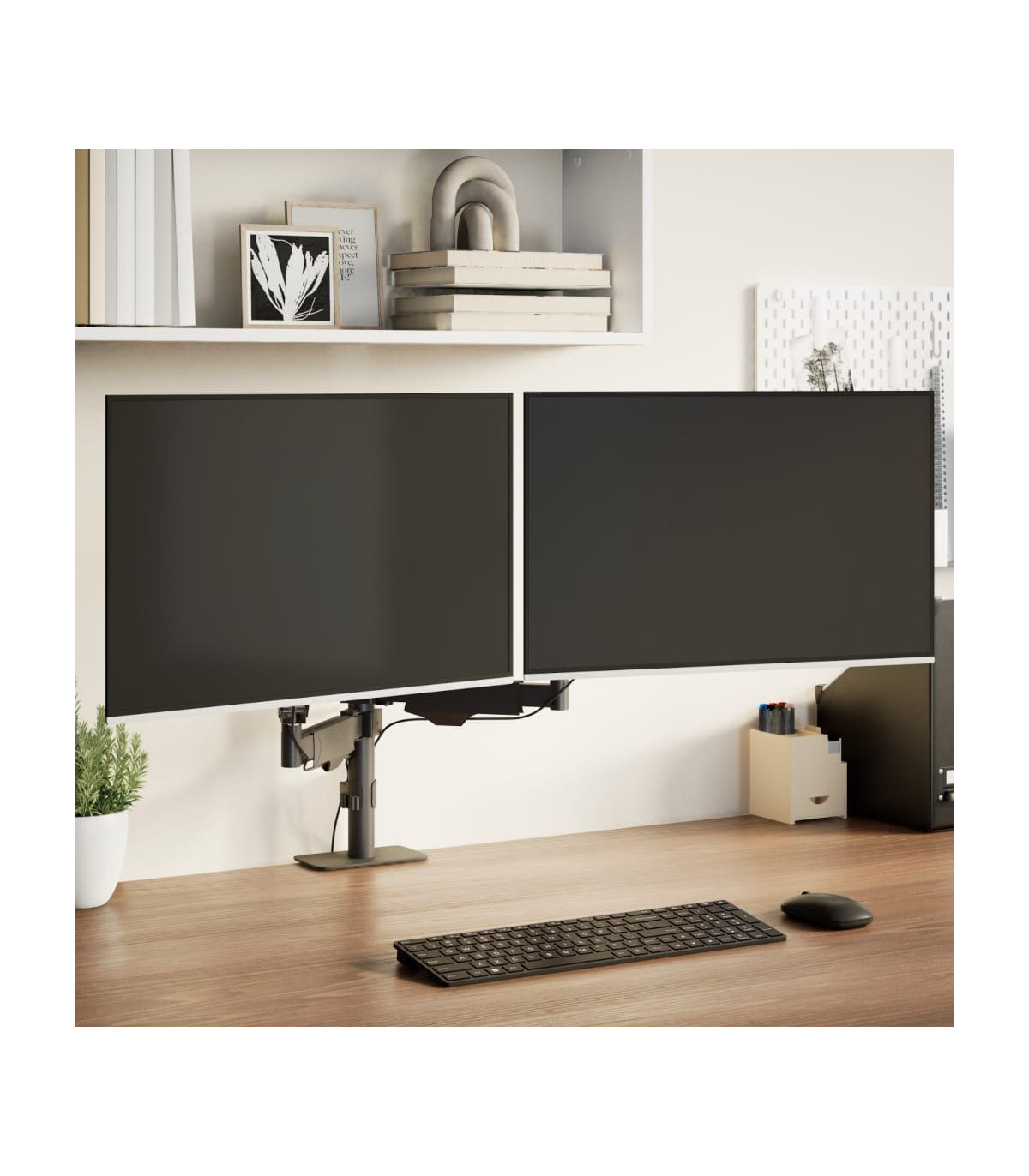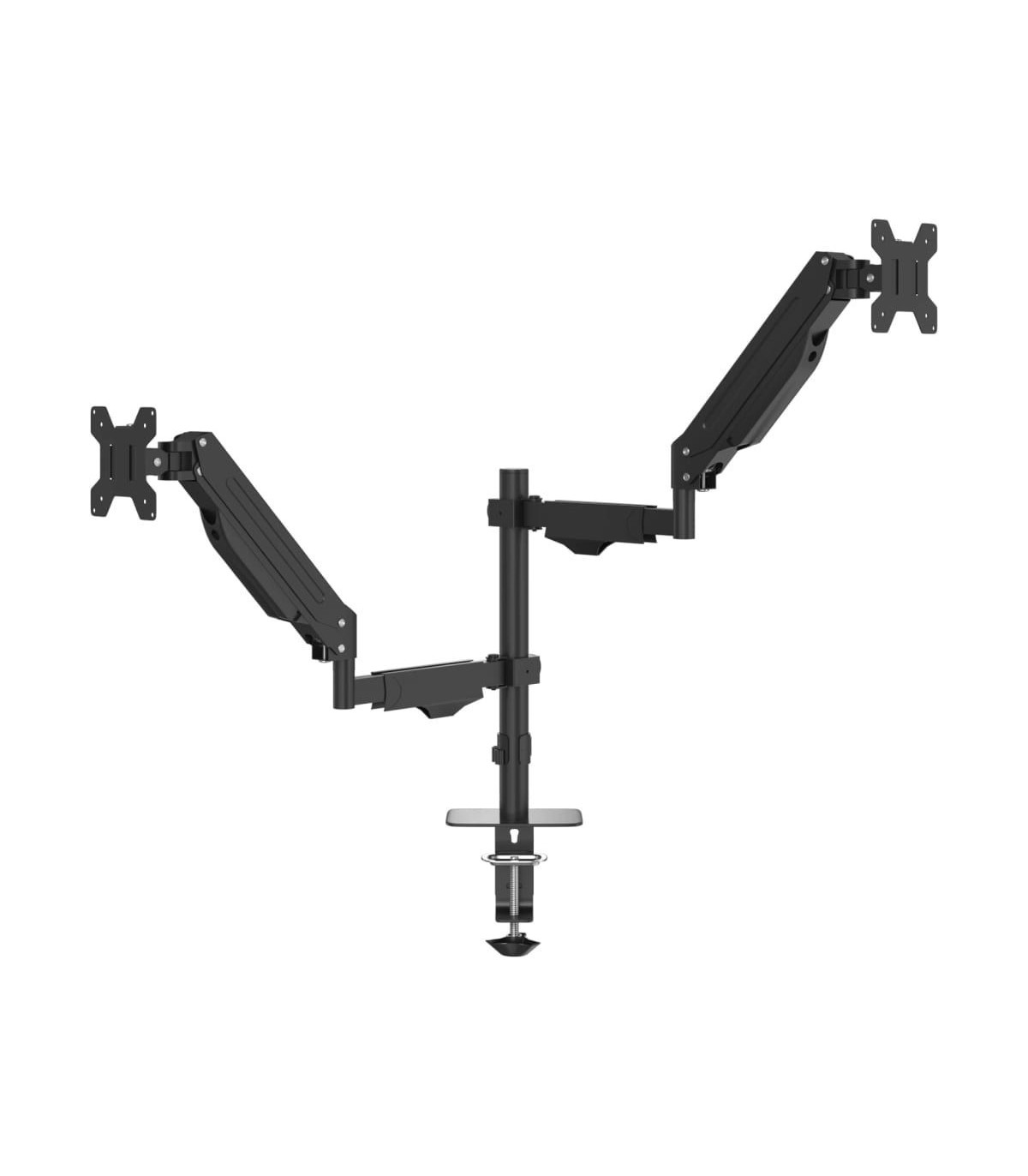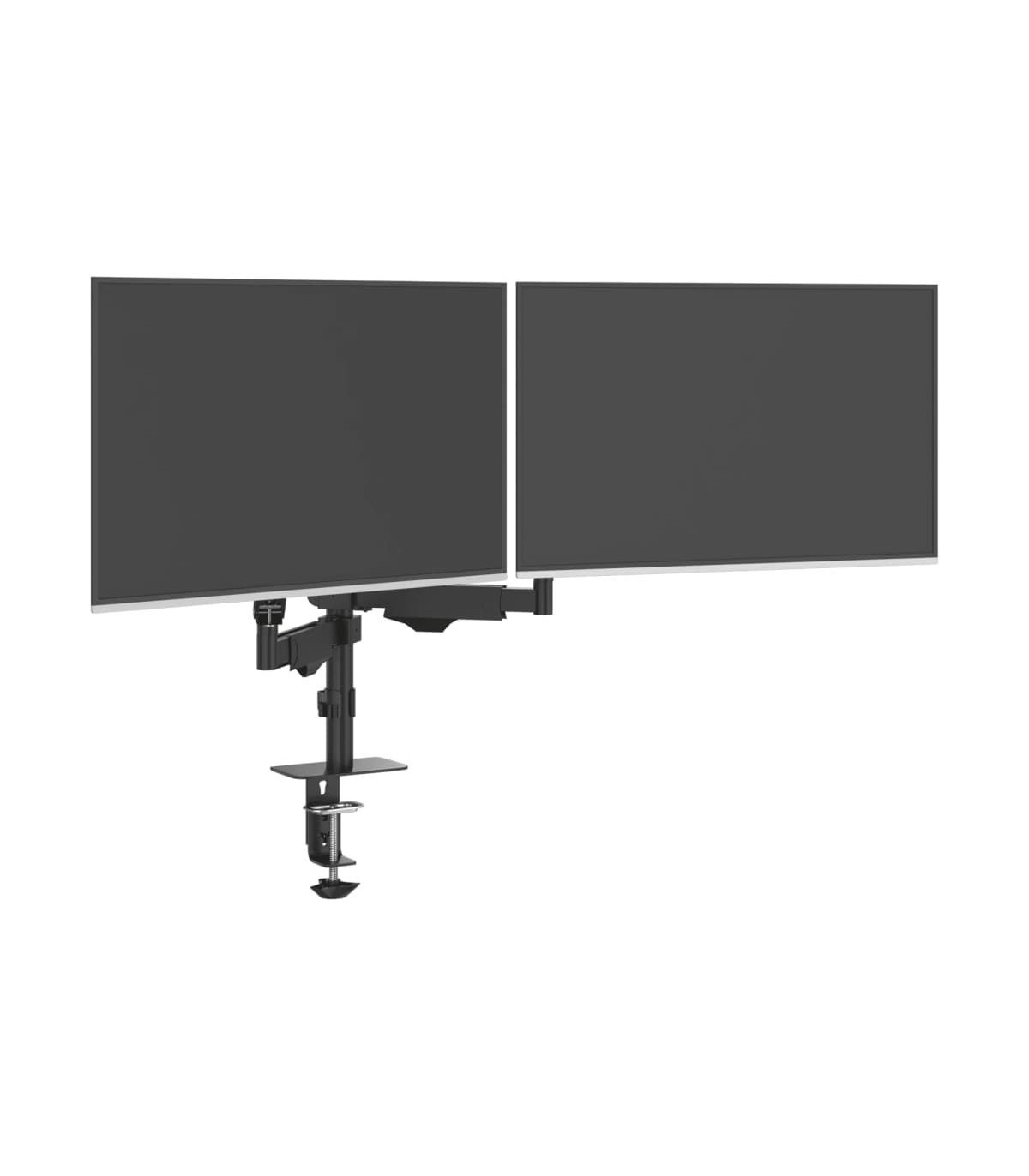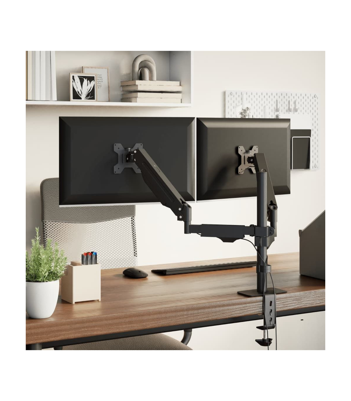 This dual monitor arm allows you to position your screen correctly, which can have a positive impact on your productivity, health, and well-being. Adjustable in many ways: The dual monitor arm has a gas spring that provides 90° upward tilt, 70° downward tilt, 360° rotation for the screen, and a pan or swivel range of up to 180°. Thanks to the adjustable height and angle, it can release stress from the shoulders and neck.Compatibility: The dual monitor arm widely fits a maximum of 27-inch computer screens with 75x75 mm or 100x100 mm VESA mount holes on the back. This monitor wall mount easily holds up to 20 kg.Durable and space-saving: The dual monitor arm is made of steel, making it durable and stable. Use this dual monitor arm to elevate your monitor, free up space, and enjoy the benefits of a clean and spacious desk.Two install options: This dual monitor arm can be installed in two different ways, using a C-clamp or grommet mount. It works for desks that are between 10 mm and 100 mm thick. You can pick the way you prefer to install it and free up your desk space.Cable management: The dual monitor arm has a cable management design that helps to tidy up cables for a neat workstation.