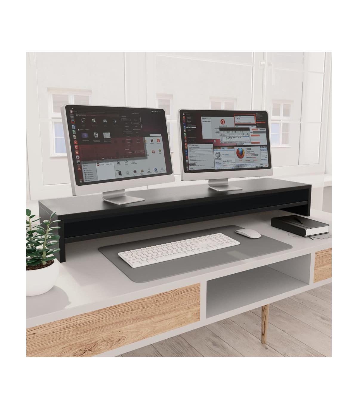 You can now raise your monitors to the perfect height with this monitor stand. Its sleek design holds up to 2 monitors and allows you to free up more space on your desk. Premium material: The engineered wood is of exceptional quality with smooth surface and features strength, stability and resistance to moisture.Additional storage: The extra wide design of this computer stand holds up to 2 monitors and the integrated shelf allows you to free up more space on your desk and keep your keyboard, pens and other stationery items well organised and within reach.Multiple functions: This monitor riser can be used as a TV stand or riser for your desktop monitor, or other multimedia devices. Raising your screen will reduce the strain on your neck and back.