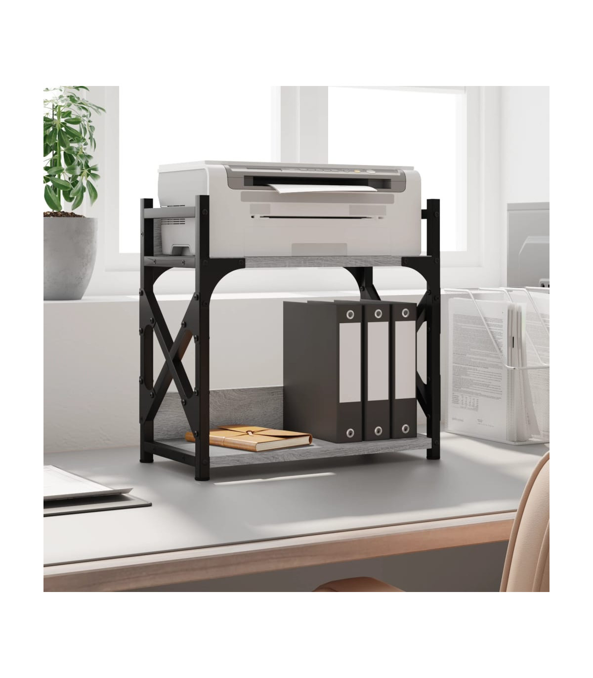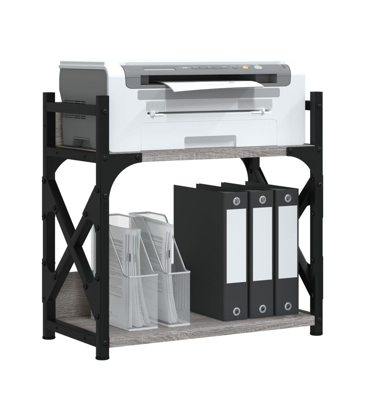The 2-tier printer stand keeps everything easily reached and makes your workplace organised and tidy. Durable and sturdy material: The engineered wood is of exceptional quality with smooth surface and also features strength, stability and resistance to moisture. The metal frame of the desk organiser ensures sturdiness and stability.2-tier printer stand: The top shelf is designed for printers, and fax machines while the bottom shelf is for files and papers to be printed. Keep everything easily reached and make your workplace organised and tidy.Adjustable feet: Four adjustable feet with plastic pads keep the printer table balanced on uneven ground and increase stability.Multifunctional desktop organiser: The file organiser can be used not only as a printer stand but also as a bookshelf, nightstand, coffee stand, side table, etc. It can also be widely used in the kitchen to arrange condiment jars, kitchenware, plates, and dishes.