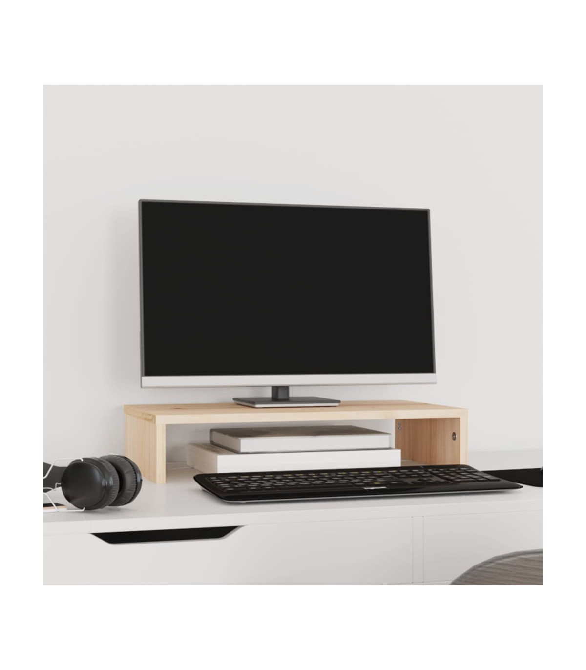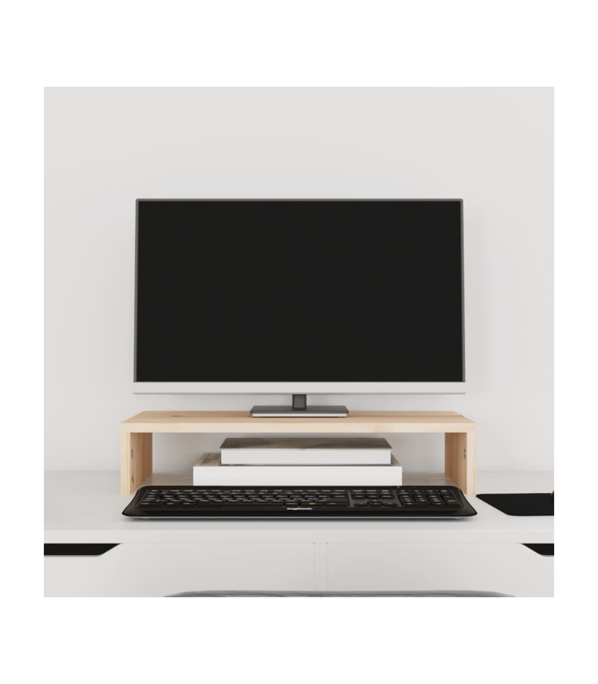 This classic wooden monitor stand featuring a minimalist design adds a beautiful touch to your current living space. Solid pinewood: Solid pine wood is a beautiful natural material. Pine wood has a straight grain, and the knots give the material its signature, rustic look.Stable frame: The wooden frame of this computer stand ensures sturdiness and stability.Storage space: The space under the computer monitor stand can accommodate your keyboard, DVD player, gaming console, streaming device, receivers, media carriers, notebooks, pens, and similar items.Stress-reducing function: This keyboard stand can be used as a riser for your desktop monitor and other multimedia devices. Raising your screen will reduce the strain on your neck and back. Note:Each product comes with an assembly manual in the box for easy assembly.