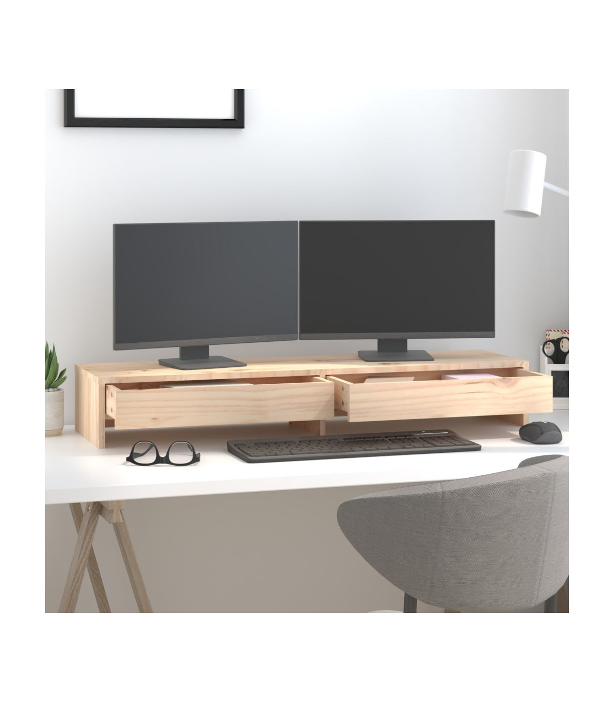 This classic wooden monitor stand featuring a minimalist design adds a beautiful touch to your current living space. Solid pinewood: Solid pine wood is a beautiful natural material. Pine wood has a straight grain, and the knots give the material its signature, rustic look.Stable frame: The wooden frame of this computer stand ensures sturdiness and stability.Storage space: The space under the computer monitor stand can accommodate your keyboard, DVD player, gaming console, receivers, media carriers, notebooks, pens, and similar items. And the 2 drawers can help you organise small items better.Stress-reducing function: This keyboard stand can be used as a riser for your desktop monitor and other multimedia devices. Raising your screen will reduce the strain on your neck and back. Note:Each product comes with an assembly manual in the box for easy assembly.