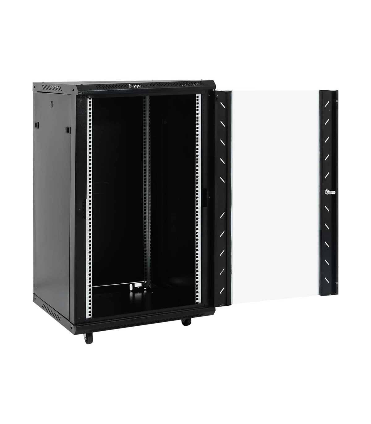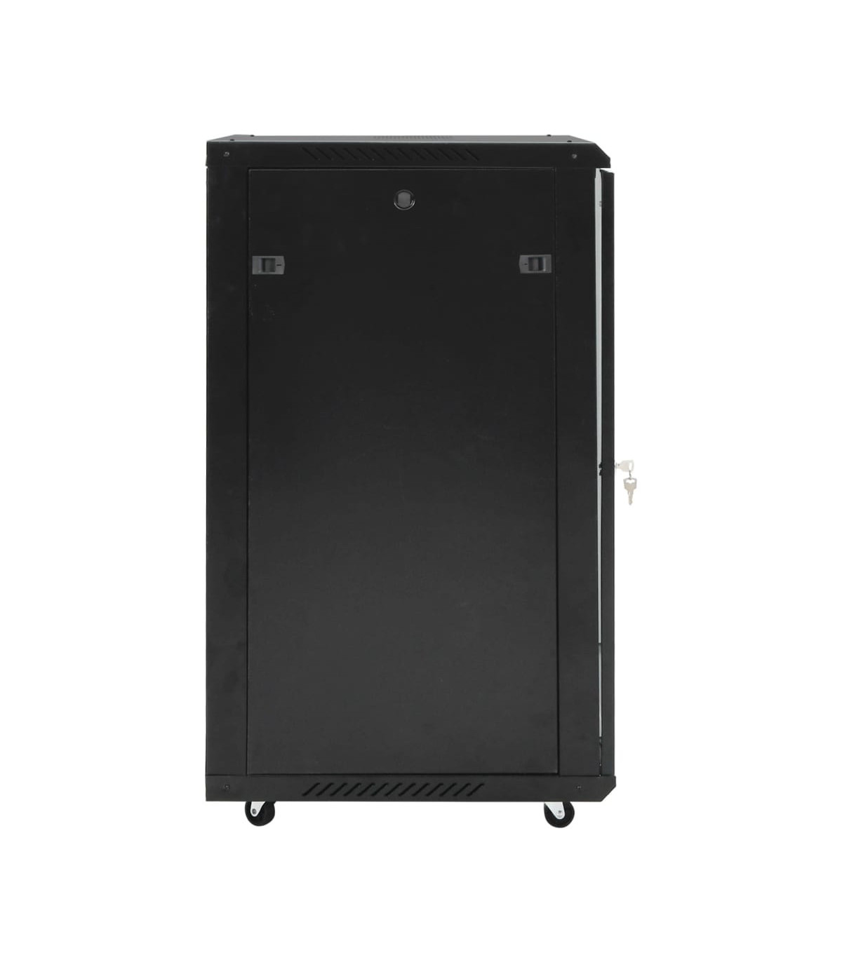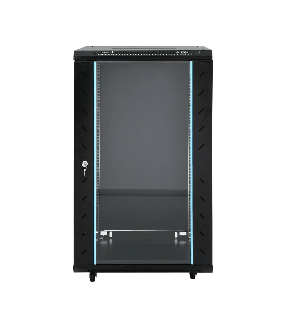 This 22U network cabinet is specially designed for placing network accessories in order, such as a router or fibre optic modem. This data cabinet, featuring a solid structure, is made of premium cold-rolled steel, making it strong and durable to use. It is compatible with 19" standard equipment. The removable side panels make it easy for the installation and maintenance of network accessories. Thanks to the included lock and key, the lockable front door prevents unwanted opening and keeps the items safe. In addition, the swivel feet make the cabinet easy to move around. Please note: The cooling fan is not included.