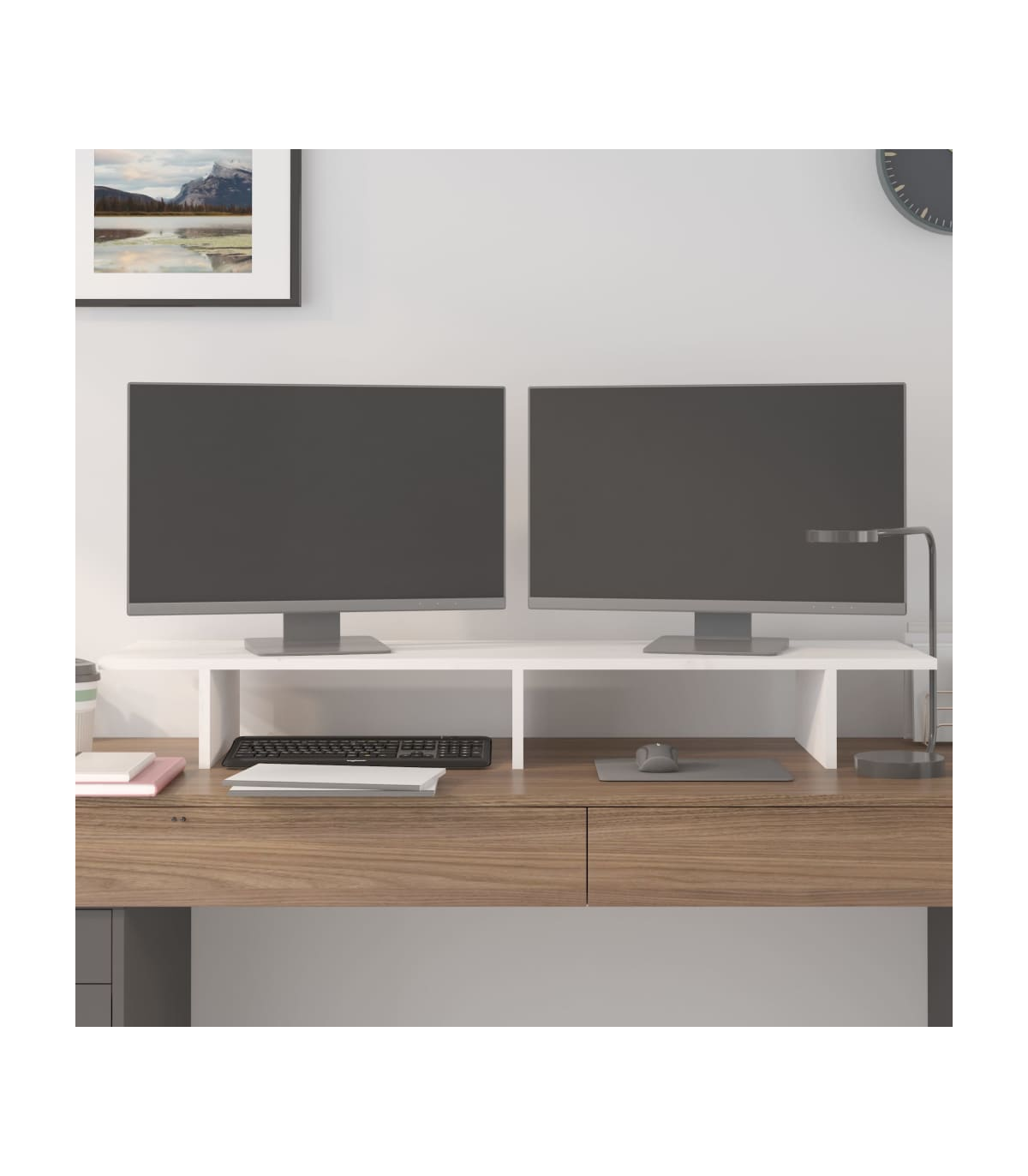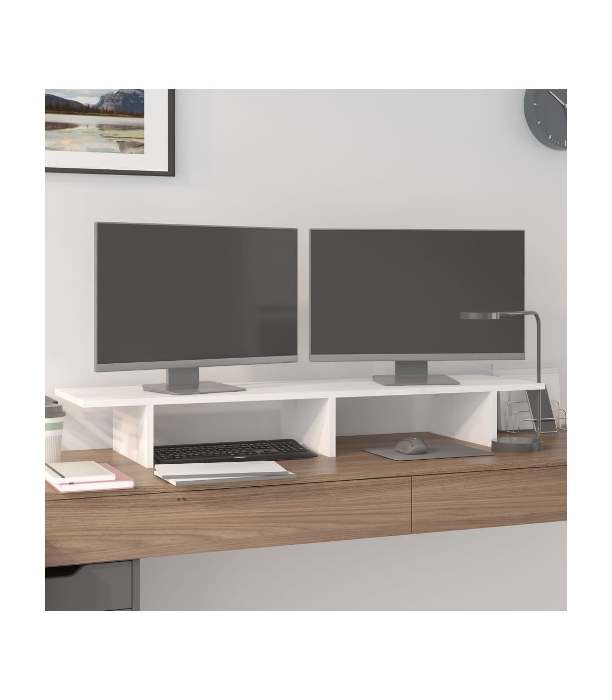 This classic wooden monitor stand featuring a minimalist design adds a beautiful touch to your current living space. Solid pinewood: Solid pine wood is a beautiful natural material. Pine wood has a straight grain, and the knots give the material its signature, rustic look.Stable frame: The wooden frame of this computer stand ensures sturdiness and stability.Storage space: The space under the computer monitor stand can accommodate your keyboard, DVD player, gaming console, streaming device, receivers, media carriers, notebooks, pens, and similar items.Stress-reducing function: This keyboard stand can be used as a riser for your desktop monitor and other multimedia devices. Raising your screen will reduce the strain on your neck and back. Note:Each product comes with an assembly manual in the box for easy assembly.