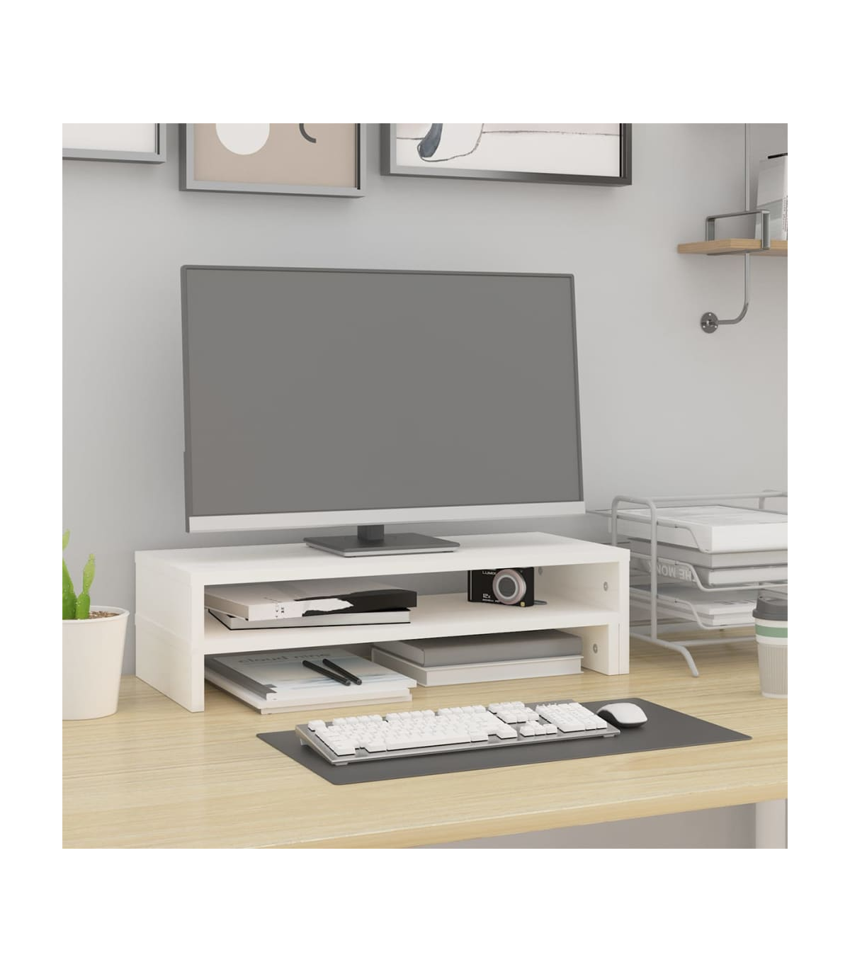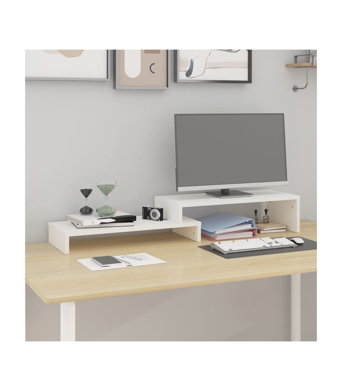 This classic wooden monitor stand featuring a minimalist design adds a beautiful touch to your current living space. Solid pinewood: Solid pine wood is a beautiful natural material. Pine wood has a straight grain, and the knots give the material its signature, rustic look.Stable frame: The wooden frame of this computer stand ensures sturdiness and stability.Storage space: The space under the computer monitor stand can accommodate your keyboard, DVD player, gaming console, streaming device, receivers, media carriers, notebooks, pens, and similar items.Stress-reducing function: This keyboard stand can be used as a riser for your desktop monitor and other multimedia devices. Raising your screen will reduce the strain on your neck and back.Flexible design: The length of the monitor riser is adjustable. You can choose the suitable length according to your needs. Note:Each product comes with an assembly manual in the box for easy assembly.
