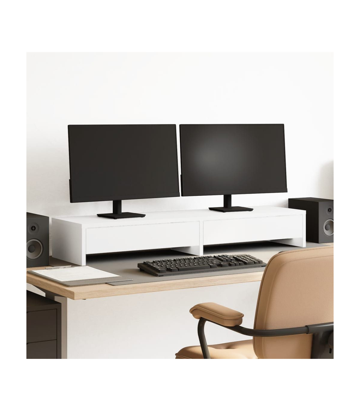 Enhance your workspace with this practical dual monitor stand for better viewing comfort and style. Stable and durable material: Engineered wood is a durable and stable material with a smooth surface that is resistant to moisture, warping, and splitting, making it a reliable choice for various projects.Ample storage space: The screen stand includes 2 drawers, offering extensive storage options for all your office essentials and helping to keep your workspace organized and clutter-free.Easy maintenance: Thanks to its smooth surface, the monitor platform is easy to clean with a damp cloth and requires less maintenance.