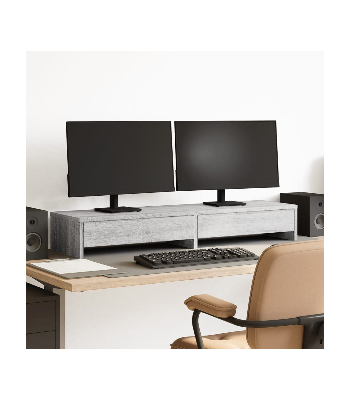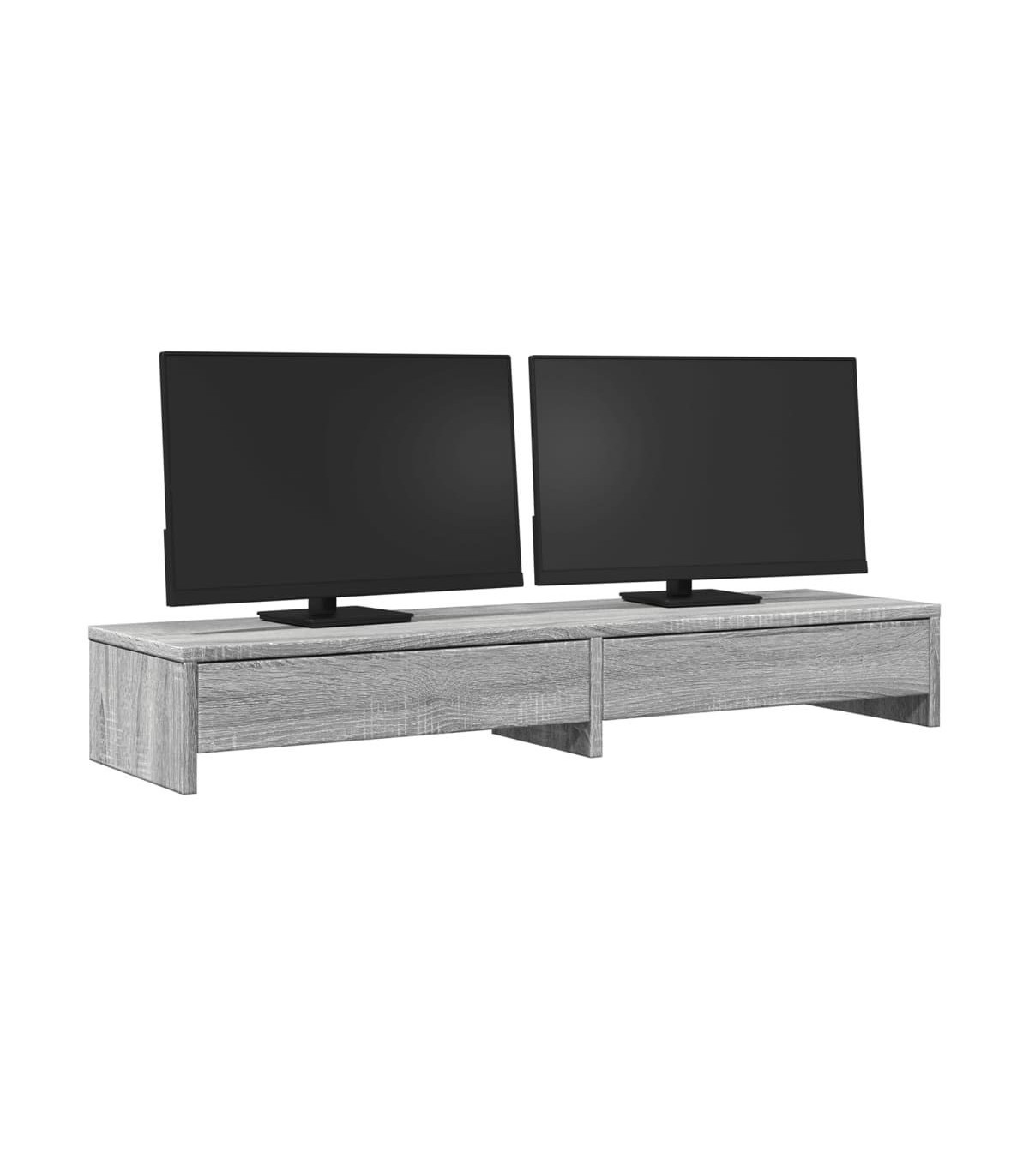 Enhance your workspace with this practical dual monitor stand for better viewing comfort and style. Stable and durable material: Engineered wood is a durable and stable material with a smooth surface that is resistant to moisture, warping, and splitting, making it a reliable choice for various projects.Ample storage space: The screen stand includes 2 drawers, offering extensive storage options for all your office essentials and helping to keep your workspace organized and clutter-free.Easy maintenance: Thanks to its smooth surface, the monitor platform is easy to clean with a damp cloth and requires less maintenance.