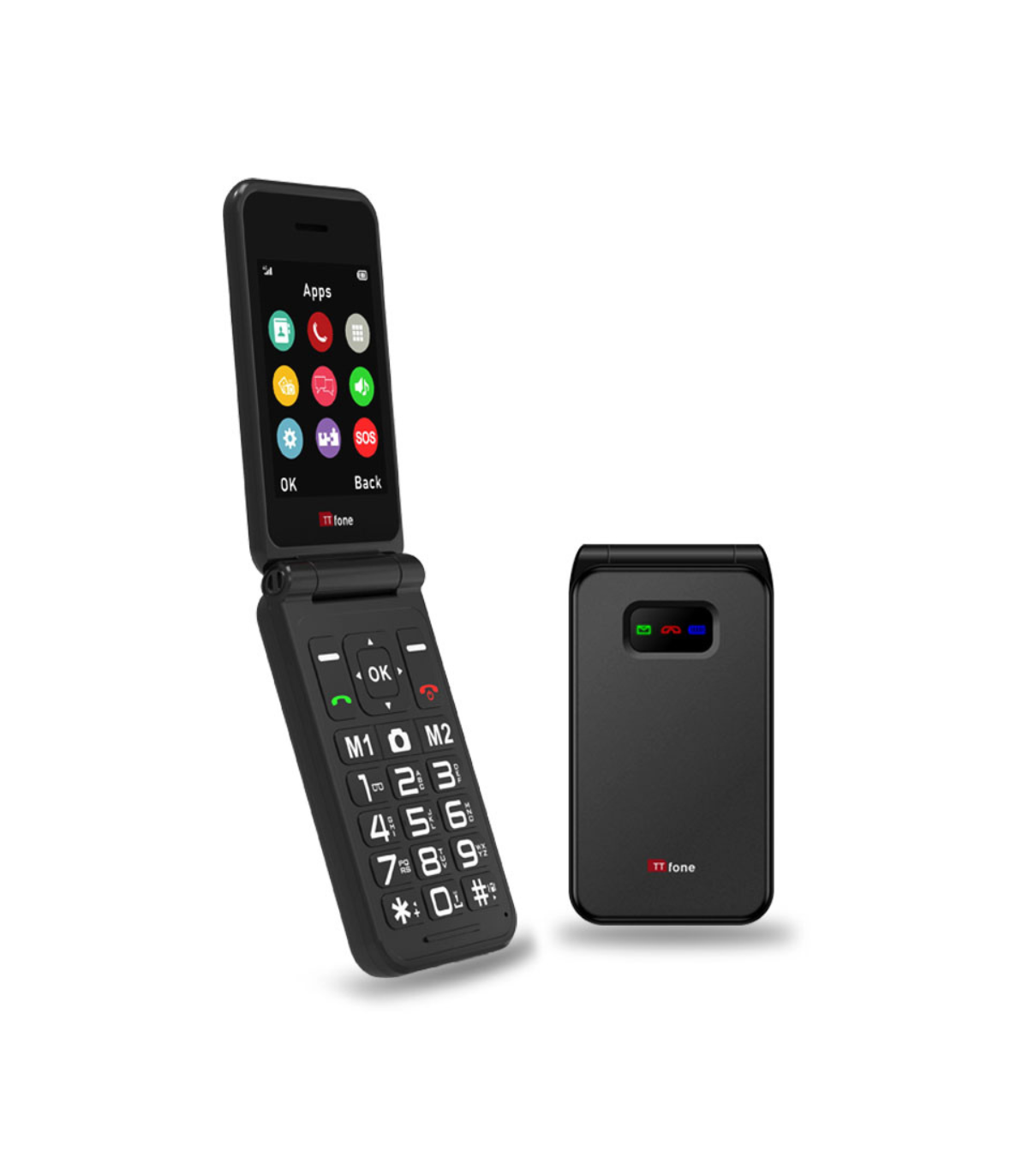 TTfone Black TT760 Flip 4G Big Button Mobile Phone for the Elderly with Emergency Assistance Button. It comes with a USB C Cable and a Giffgaff Pay As You Go SIM card.