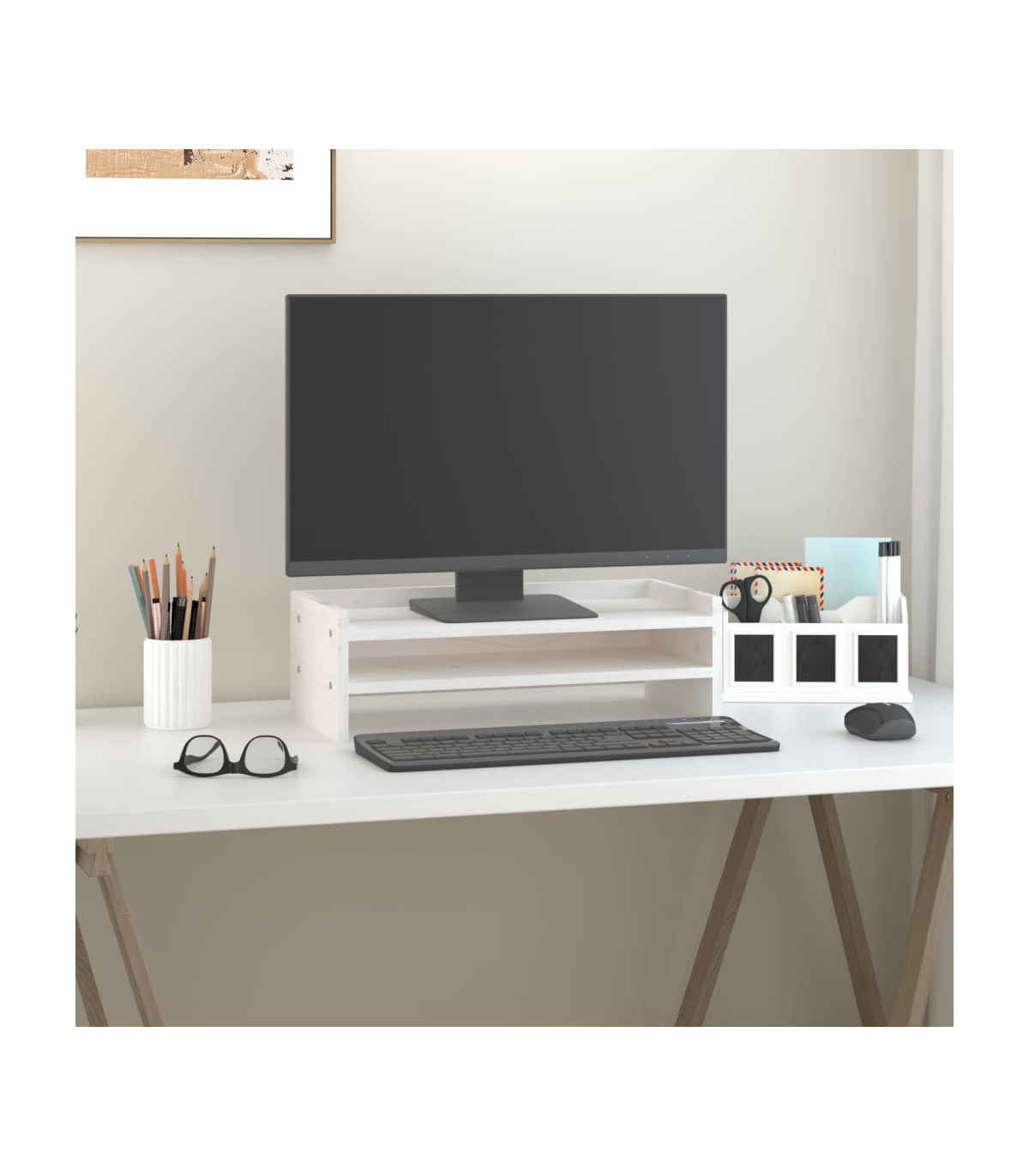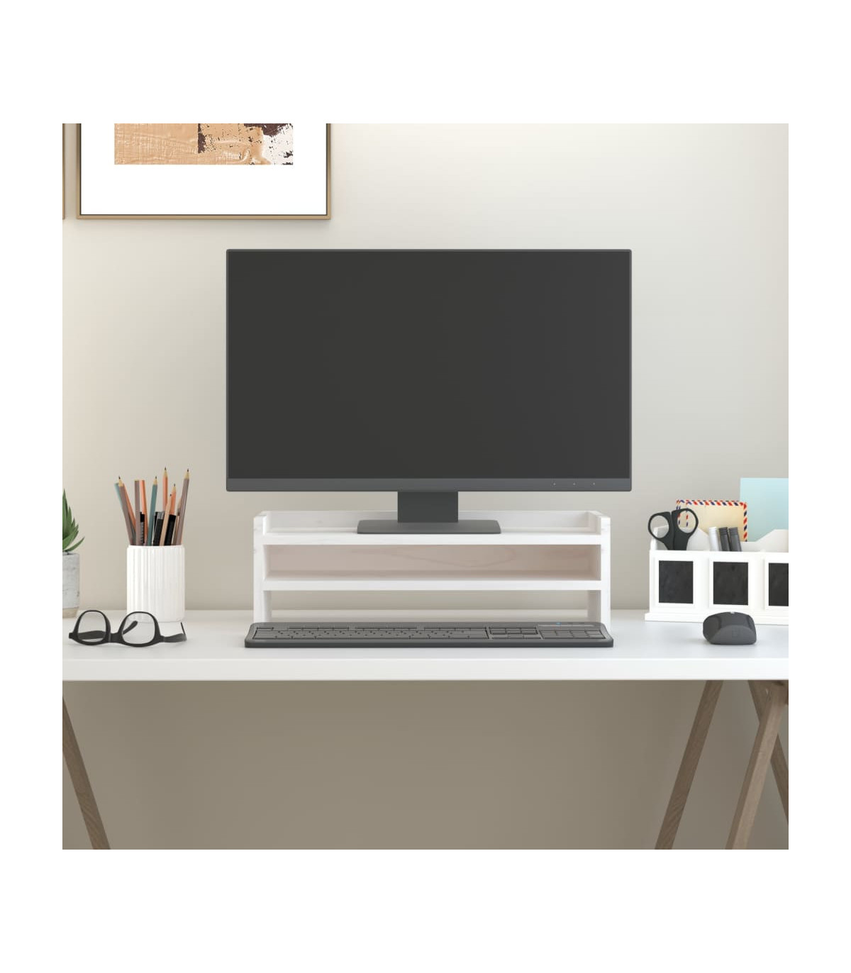 This classic wooden monitor stand featuring a minimalist design adds a beautiful touch to your current living space. Solid pinewood: Solid pine wood is a beautiful natural material. Pine wood has a straight grain, and the knots give the material its signature, rustic look.Stable frame: The wooden frame of this computer stand ensures sturdiness and stability.Storage space: The space under the computer monitor stand can accommodate your keyboard, DVD player, gaming console, streaming device, receivers, media carriers, notebooks, pens, and similar items.Stress-reducing function: This keyboard stand can be used as a riser for your desktop monitor and other multimedia devices. Raising your screen will reduce the strain on your neck and back. Note:Each product comes with an assembly manual in the box for easy assembly.