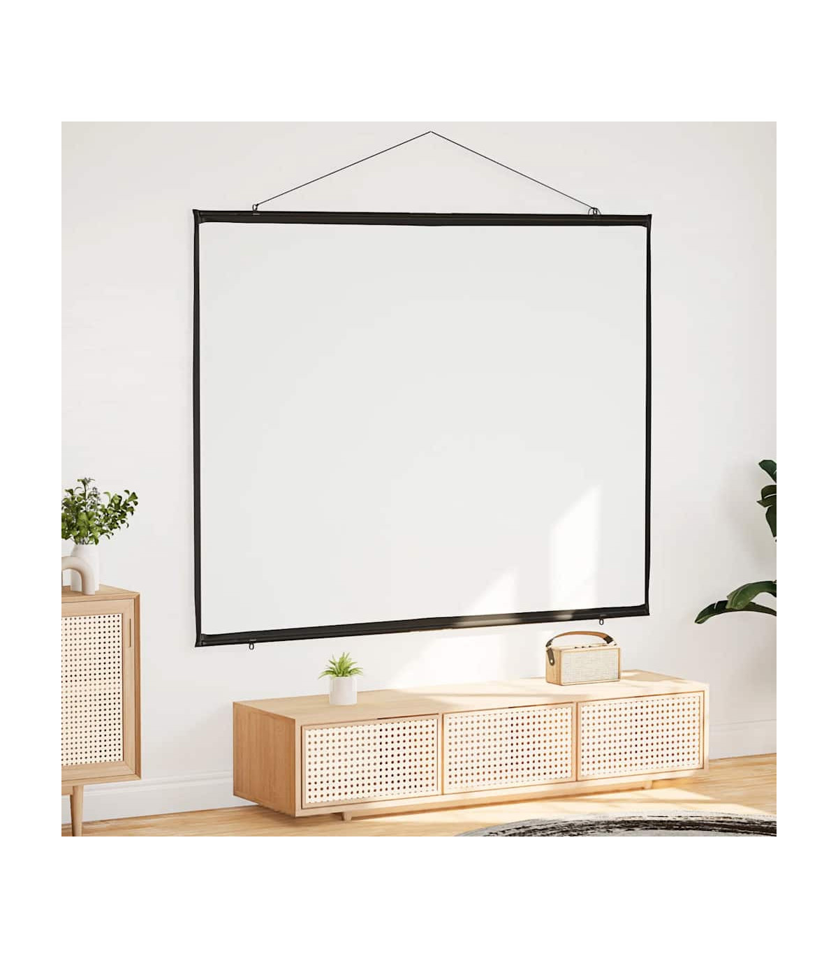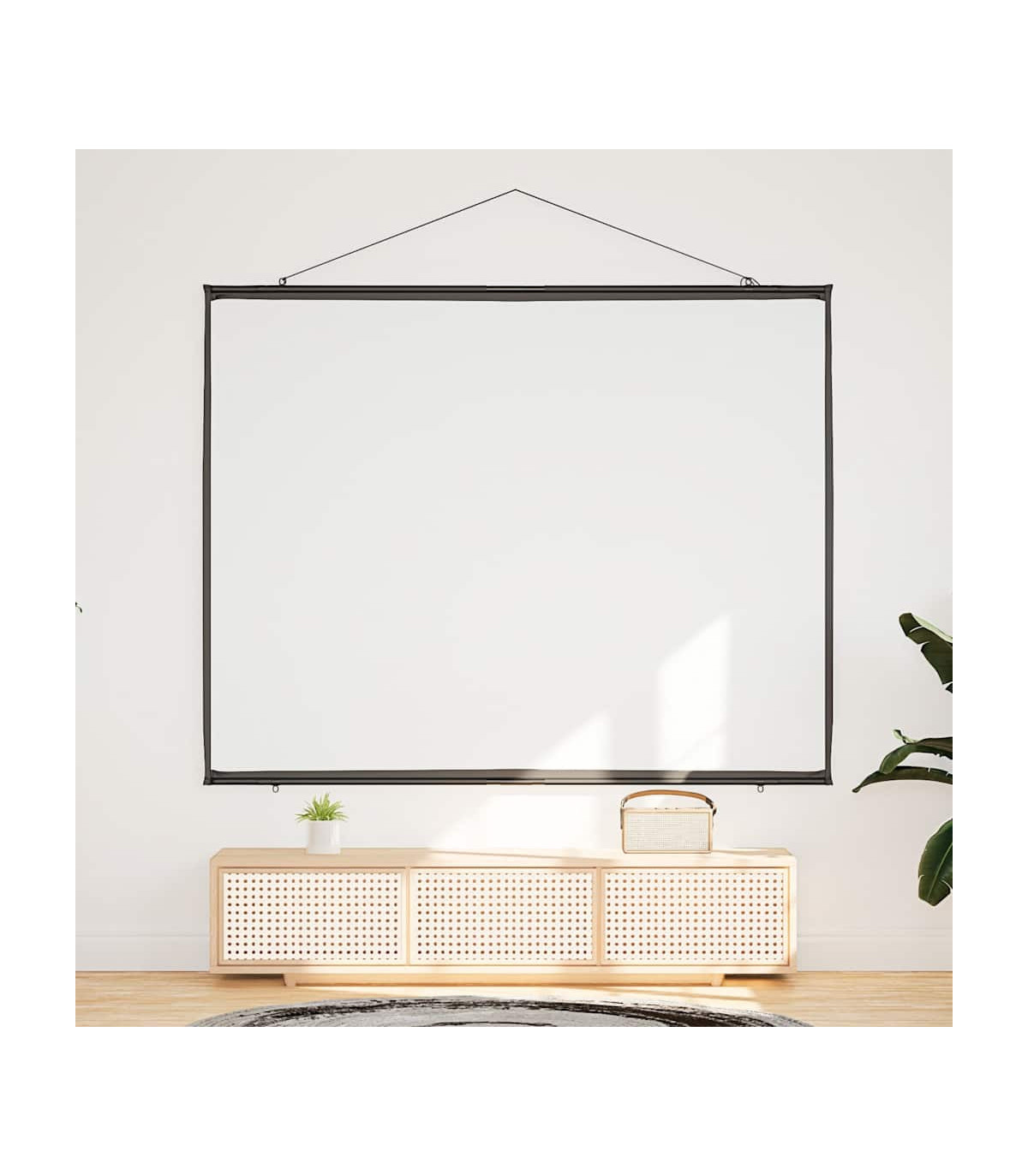 The projection screen is perfect for classrooms, home theater movies, public displays, and conference room presentations. Enhanced viewing experience: The matte screen evenly diffuses projected light, delivering sharp, clear images from any angle. Its optimised surface absorbs light to reduce reflections, ensuring consistent image quality, while the black borders enhance picture focus and contrast.Wall-hanging: Thanks to its lightweight design, the projector screen is easy to hang on any wall, enhancing your viewing experience for movies or presentations.Strong and durable material: Constructed from 100% polyester and reinforced with a sturdy iron housing, this projector screen offers exceptional strength and longevity, ensuring it withstands regular use.Portable and versatile application: The projector screen is perfect for movie nights at home, office presentations, or classroom teaching, and its portable design allows you to easily move it from one location to another, adapting effortlessly to any occasion.Effortless assembly: Designed for quick setup without a stand, this projector screen can be ready in minutes. Simply use the durable rope to hang it, and the included metal tubes ensure the fabric stays taut for an optimal display.