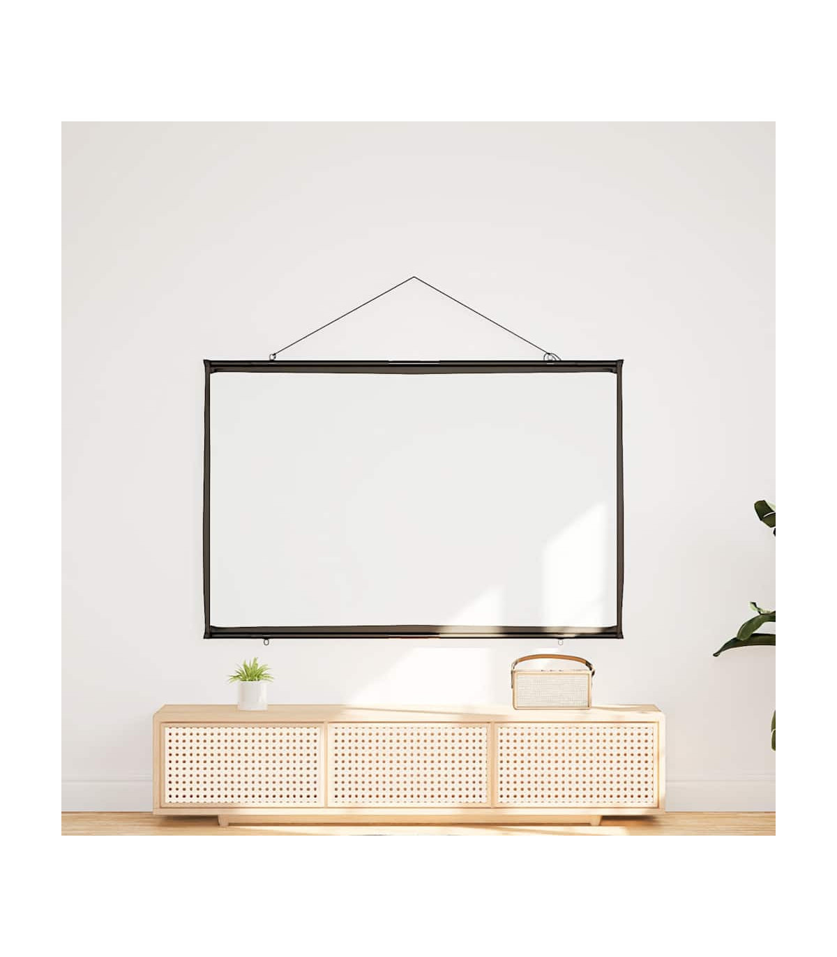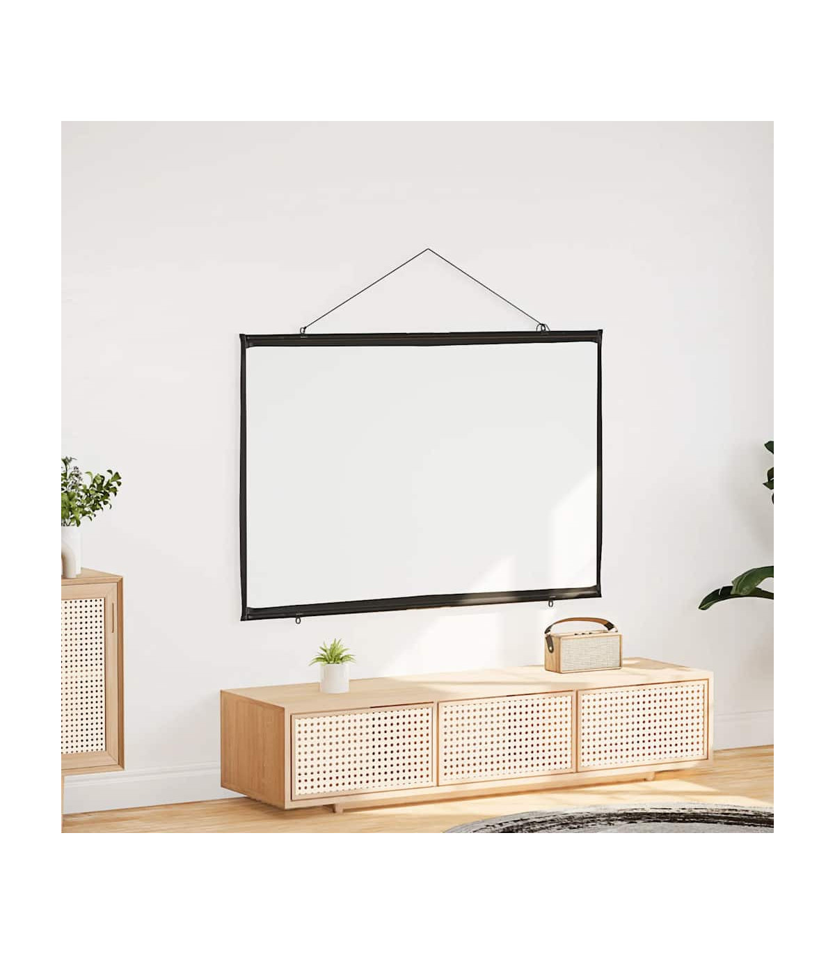 The projection screen is perfect for classrooms, home theater movies, public displays, and conference room presentations. Enhanced viewing experience: The matte screen evenly diffuses projected light, delivering sharp, clear images from any angle. Its optimised surface absorbs light to reduce reflections, ensuring consistent image quality, while the black borders enhance picture focus and contrast.Wall-hanging: Thanks to its lightweight design, the projector screen is easy to hang on any wall, enhancing your viewing experience for movies or presentations.Strong and durable material: Constructed from 100% polyester and reinforced with a sturdy iron housing, this projector screen offers exceptional strength and longevity, ensuring it withstands regular use.Portable and versatile application: The projector screen is perfect for movie nights at home, office presentations, or classroom teaching, and its portable design allows you to easily move it from one location to another, adapting effortlessly to any occasion.Effortless assembly: Designed for quick setup without a stand, this projector screen can be ready in minutes. Simply use the durable rope to hang it, and the included metal tubes ensure the fabric stays taut for an optimal display.