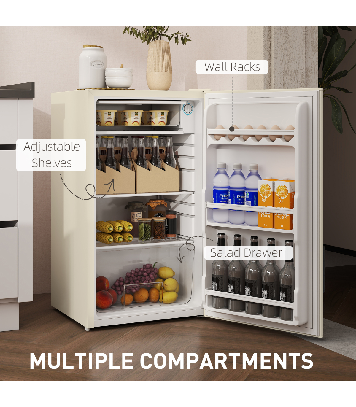 - Adjustable main shelves to easily and safely store food at different levels