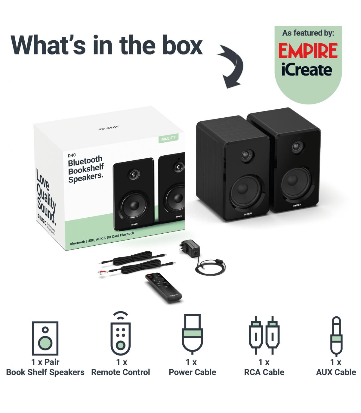 Here are key features for the Majority D40 Bluetooth Bookshelf Speakers: