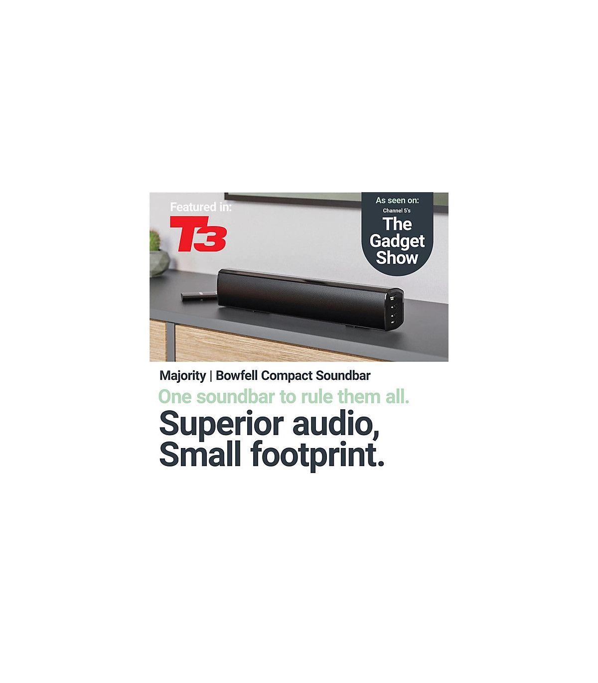With 50 watts of audio power, the Bowfell delivers dynamic and balanced sound that punches well above its size. It even features a USB port so you can play your personal music collection directly from a flash drive—ideal for hosting gatherings or simply relaxing to your favourite tunes. Perfect for bedrooms, living rooms, or office setups, the MAJORITY Bowfell 2.1 Compact Sound Bar brings big sound to any space without the bulk.